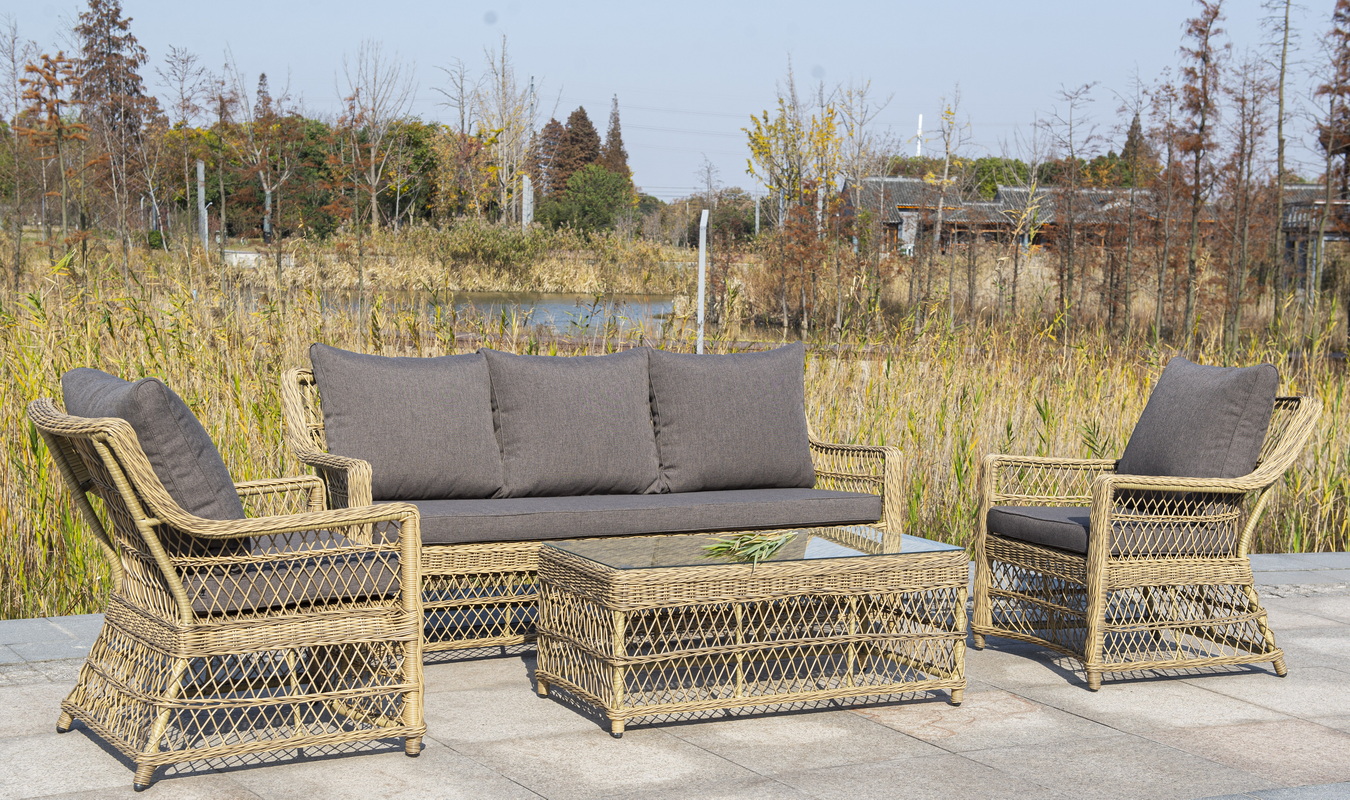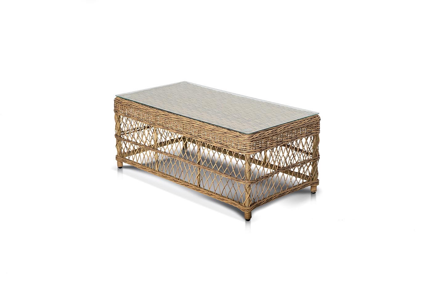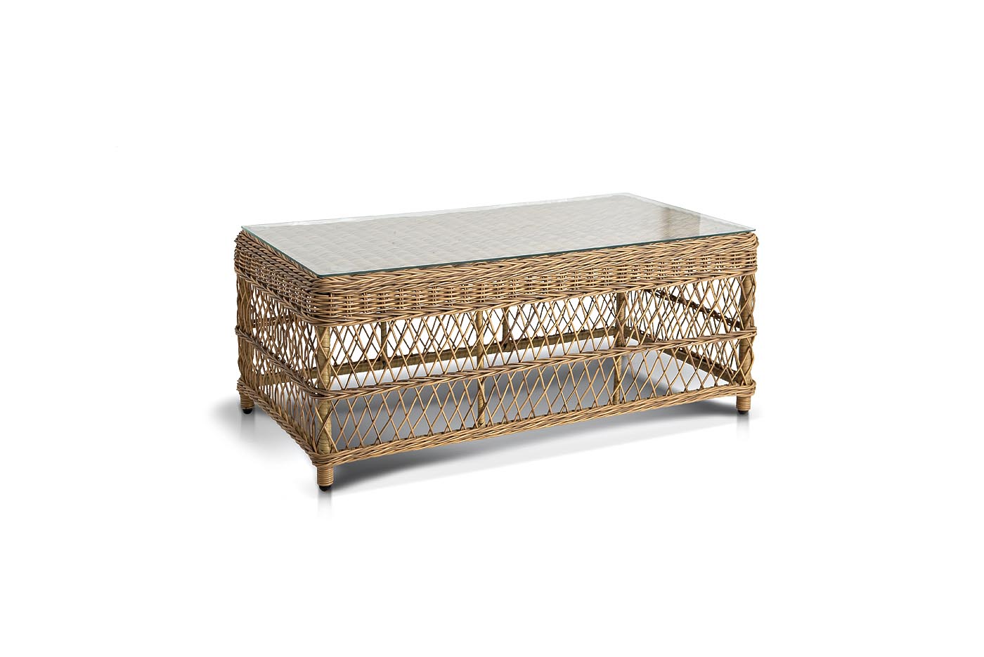 Каркас изготолен из алюминия, который гарантирует устойчивость при размещении на любой поверхности. В качестве декоративного элемента выступает ручная оплетка на основе круглого искусственного ротанга, представленного в натуральном соломенном оттенке.