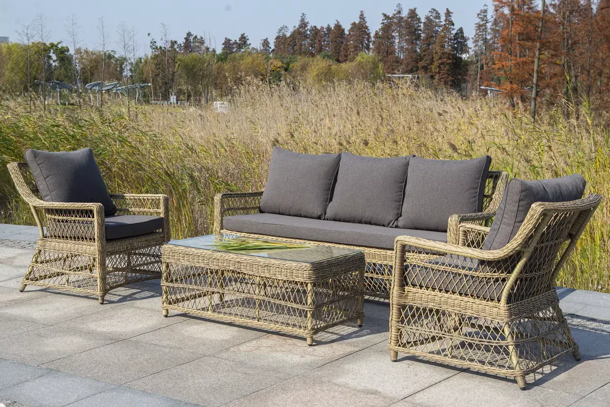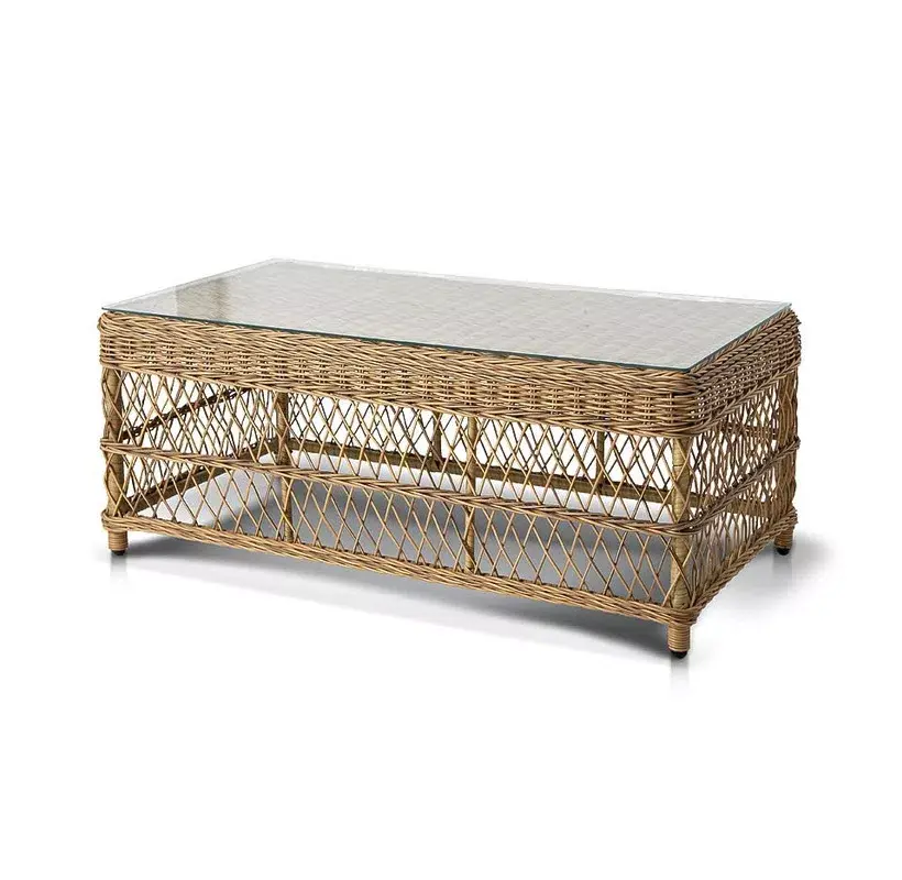 Каркас изготолен из алюминия, который гарантирует устойчивость при размещении на любой поверхности. В качестве декоративного элемента выступает ручная оплетка на основе круглого искусственного ротанга, представленного в натуральном соломенном оттенке.