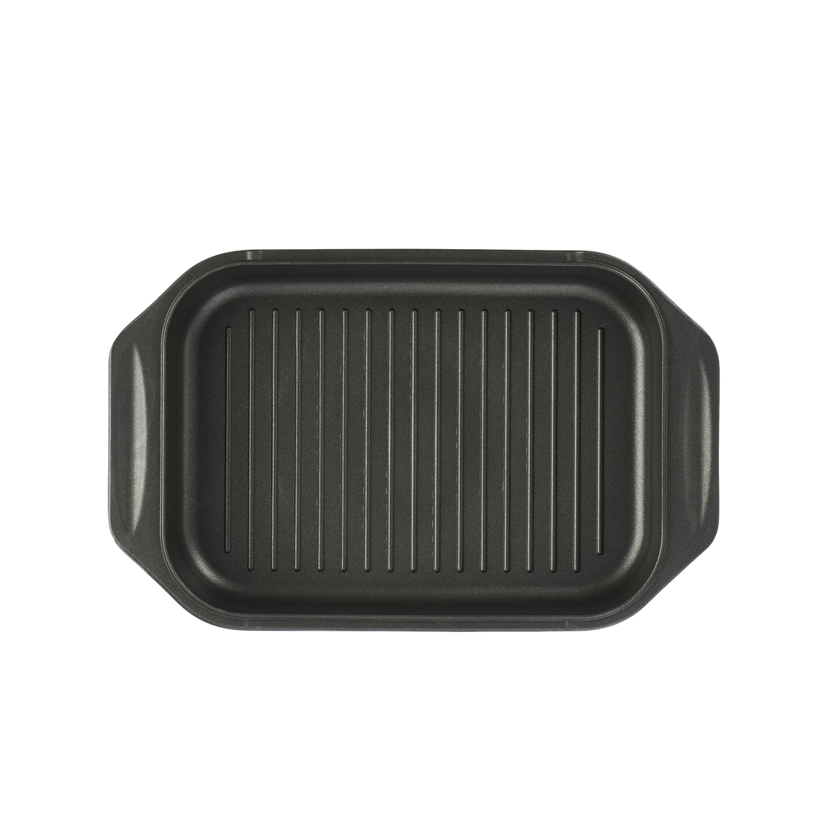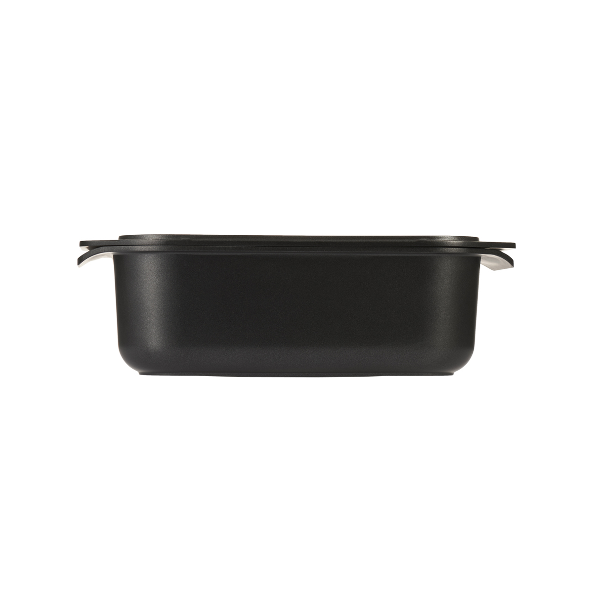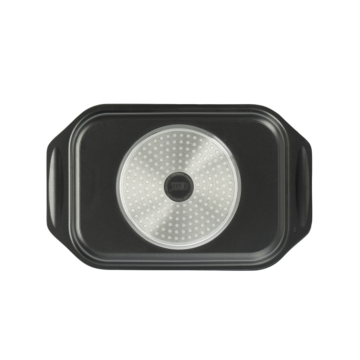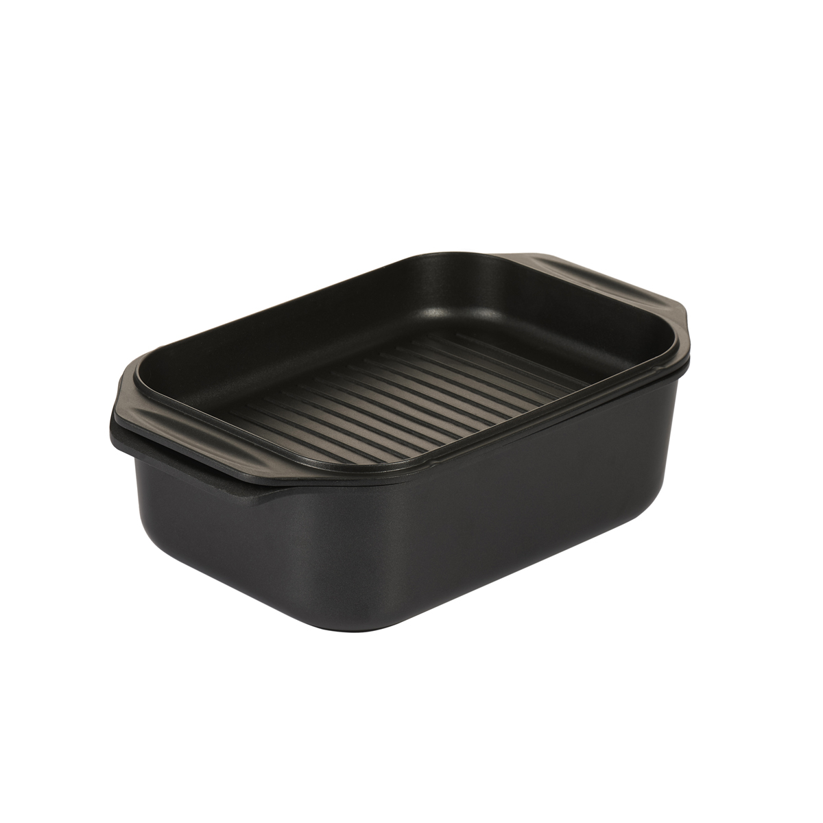 В комплект входит крышка. Крышка плотно закрывается и таким образом обеспечивается циркуляция горячего воздуха внутри посуды. Дно крышки ребристое, что позволяет ее использовать как противень для жарки с эффектом гриля.