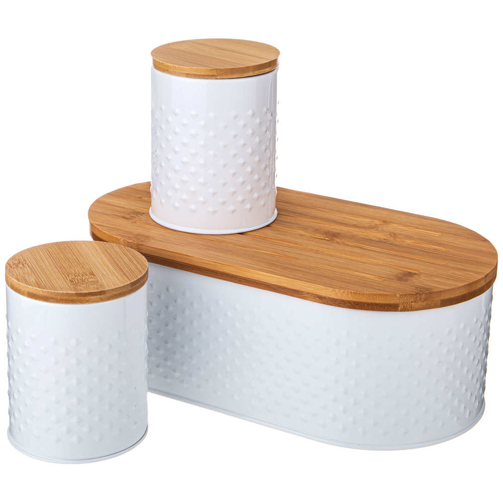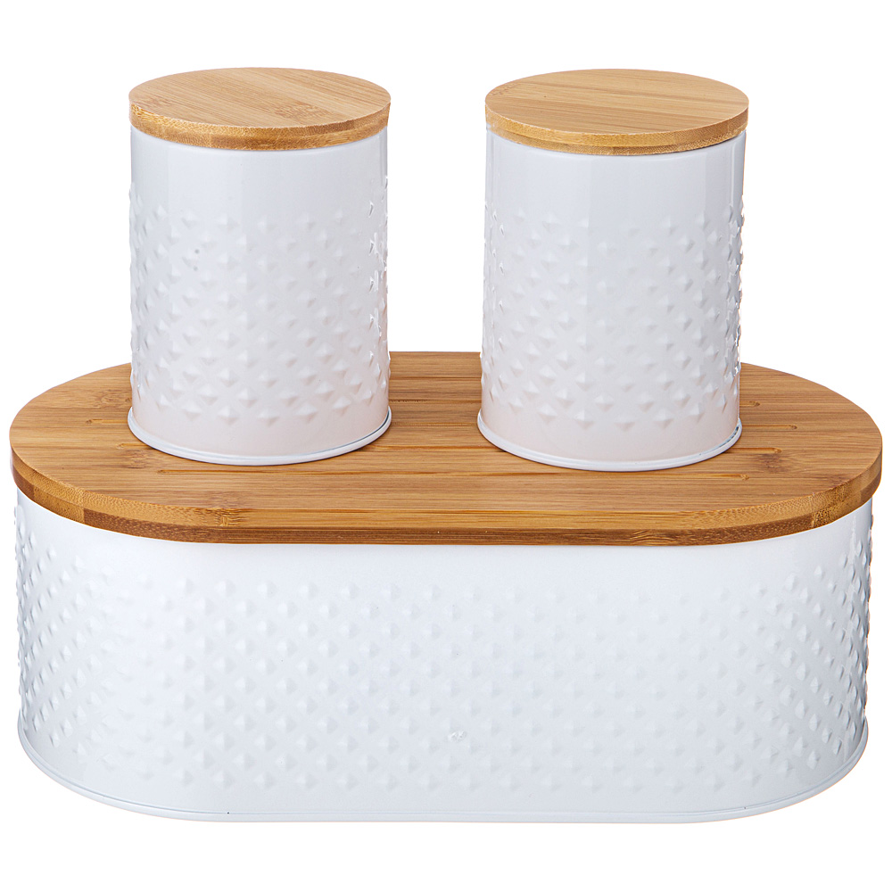 Хлебница и банки для сыпучих продуктов являются частью системы хранения в доме.