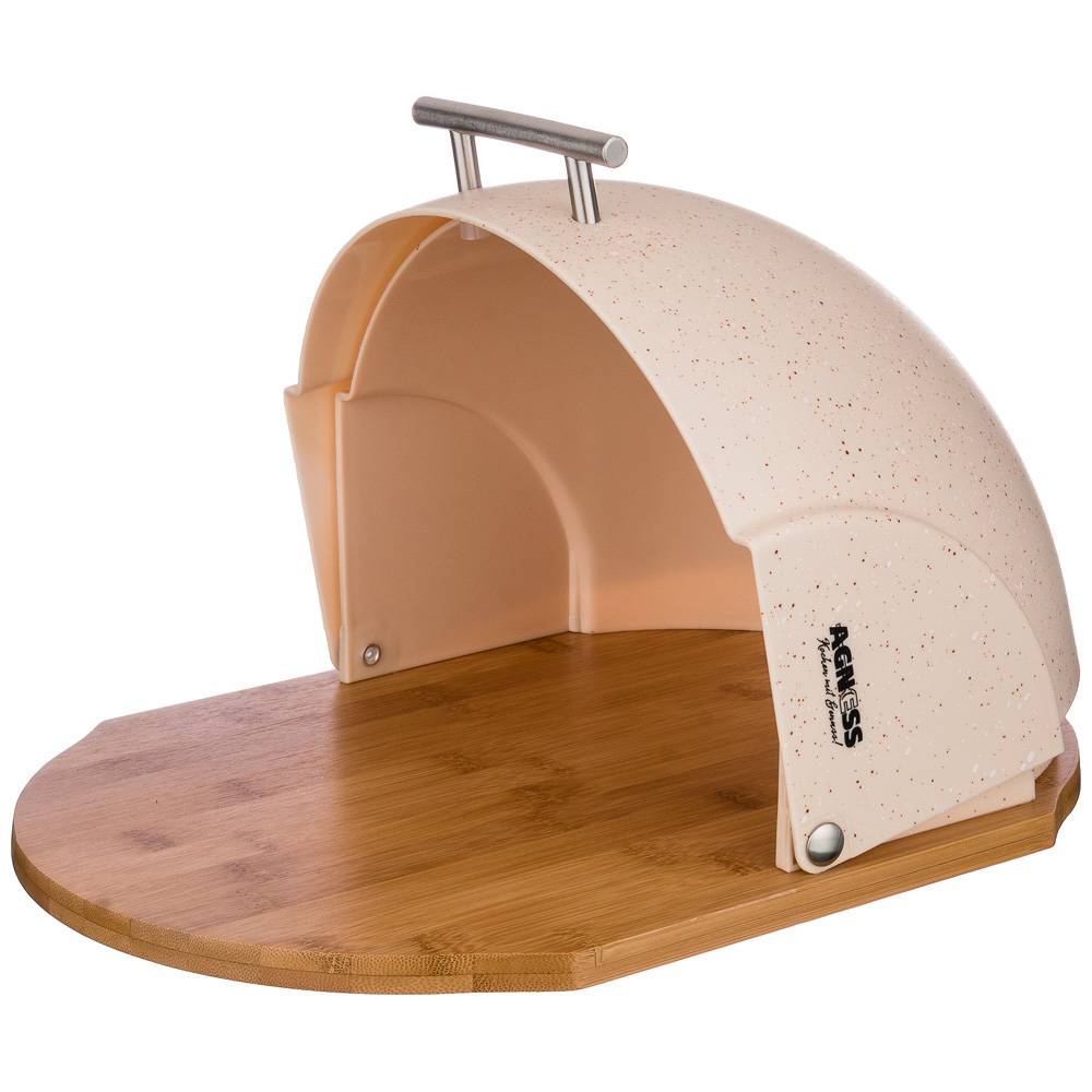 Хлебница имеет деревянное основание, на котором можно сразу нарезать хлеб.