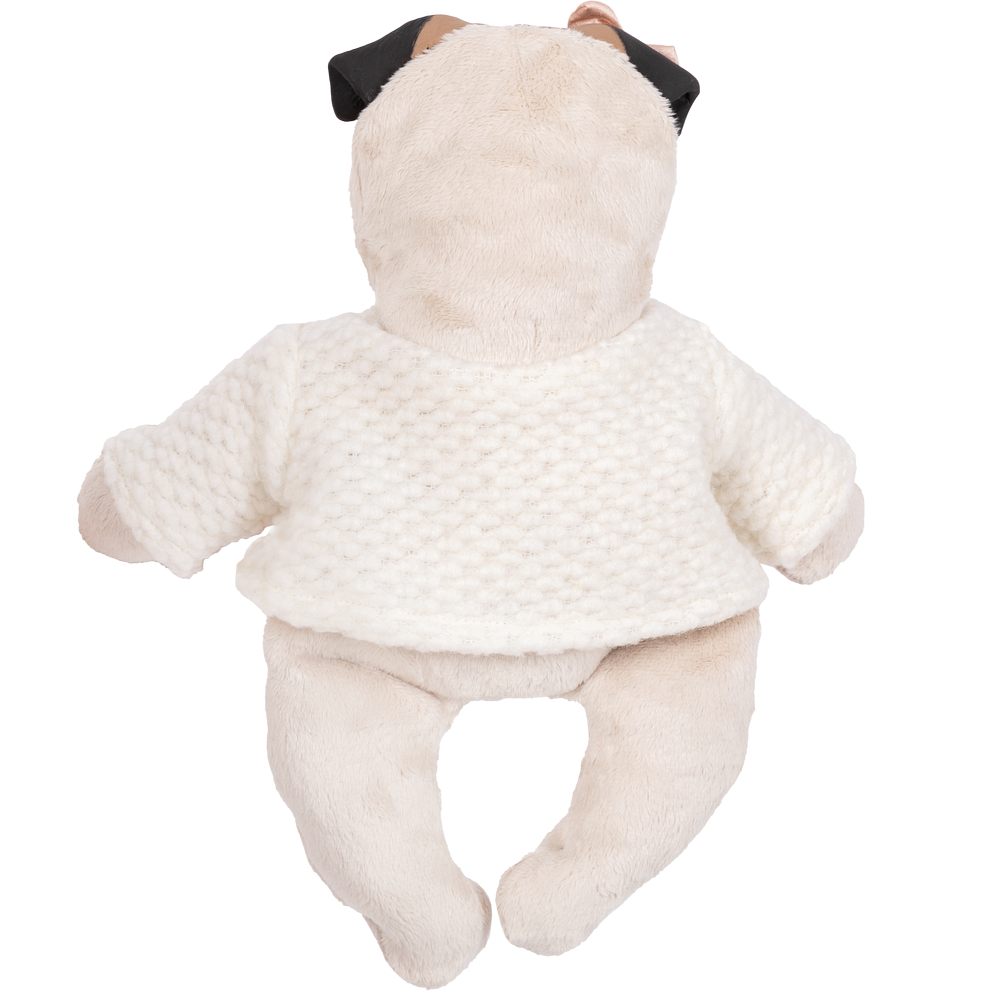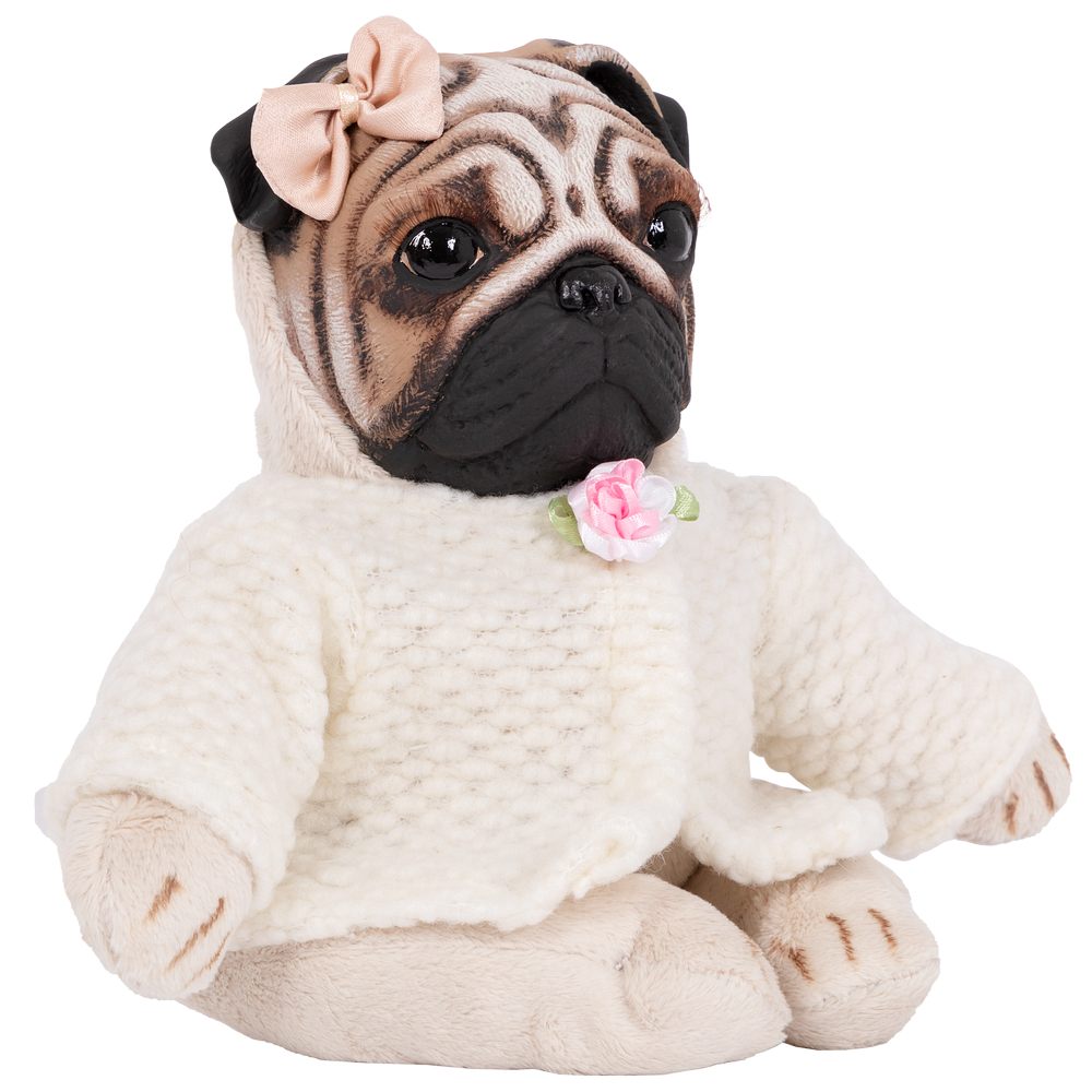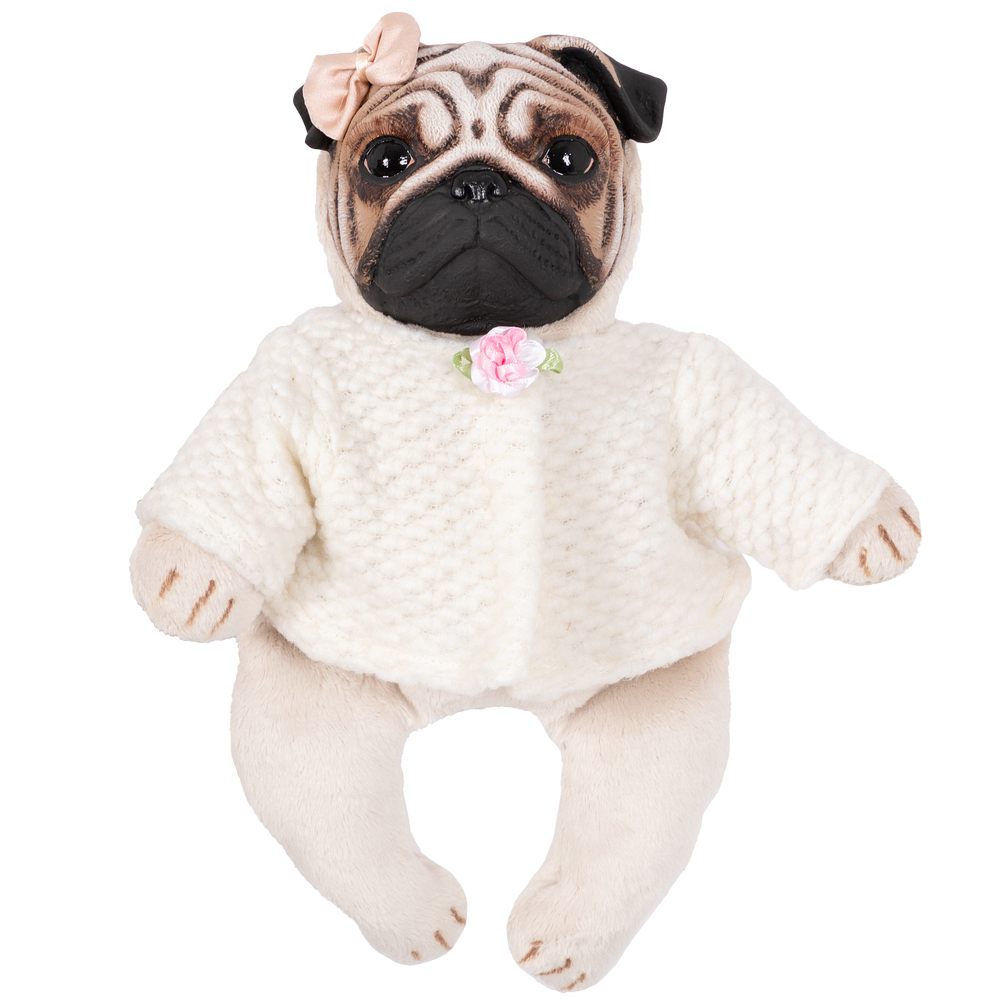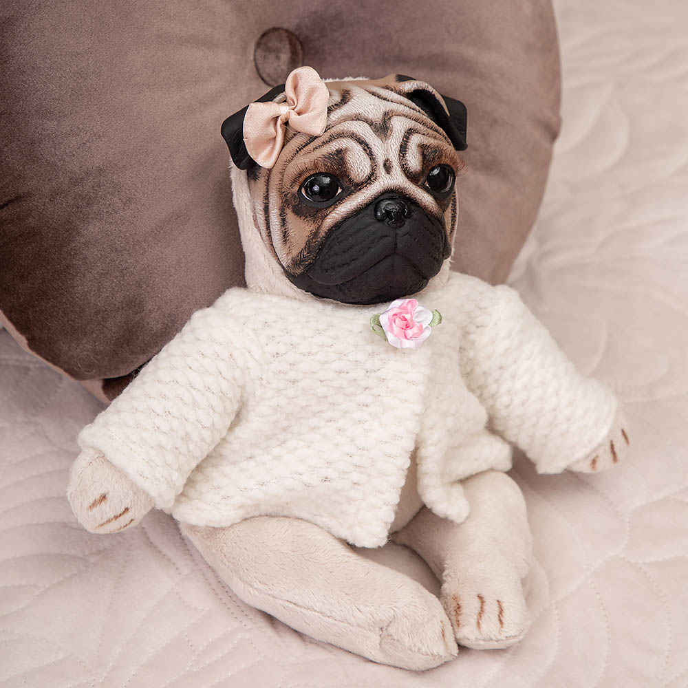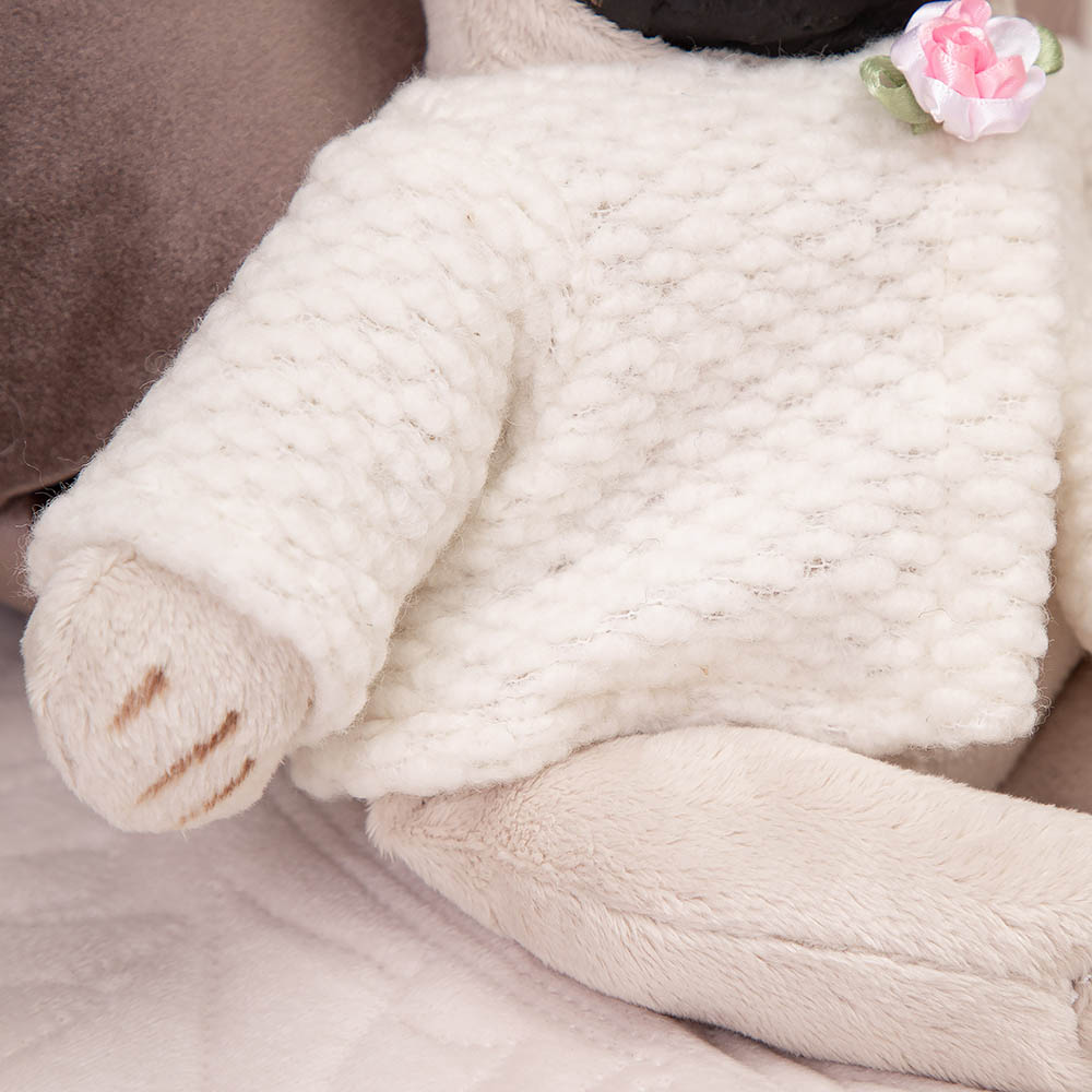 Её отличают милые украшения – розовый бантик, цветок на воротничке и тёплая вязаная кофта нежного молочного цвета. Настоящая принцесса с прекрасными манерами и собственным стилем!