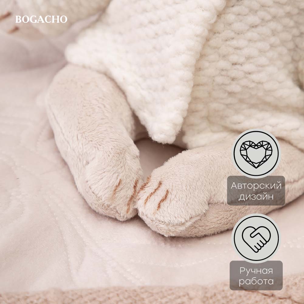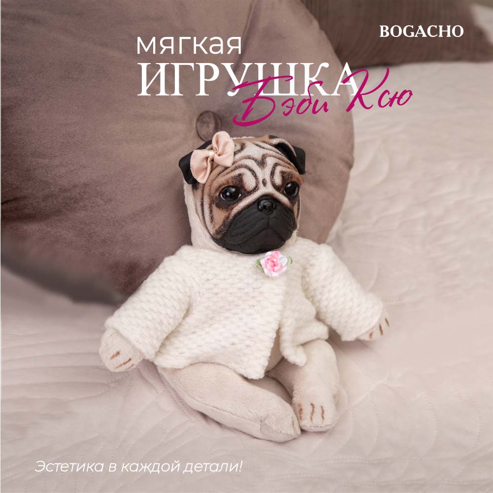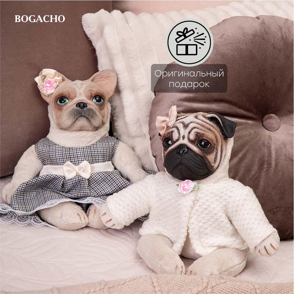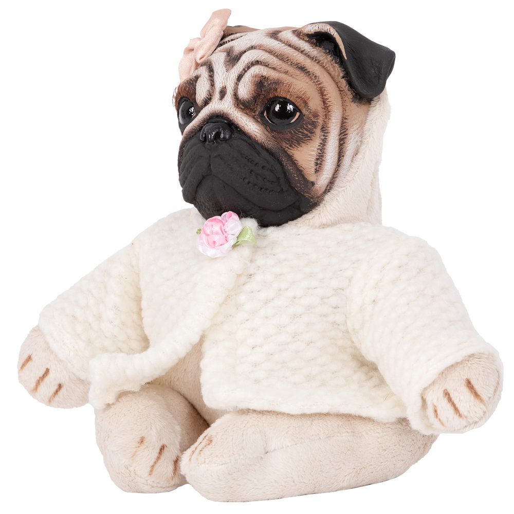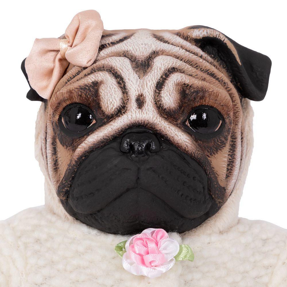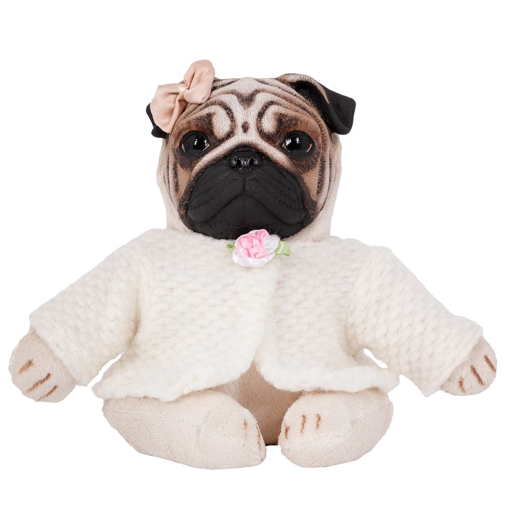 Её отличают милые украшения – розовый бантик, цветок на воротничке и тёплая вязаная кофта нежного молочного цвета. Настоящая принцесса с прекрасными манерами и собственным стилем!