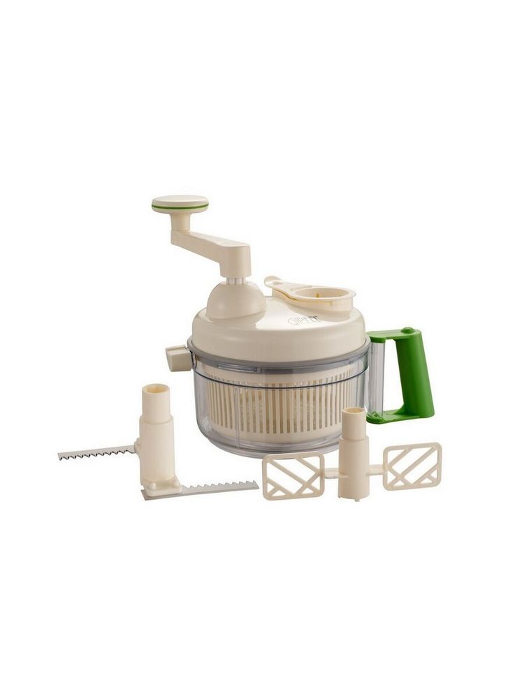 Это миниатюрный ручной кухонный комбайн, который не займет много места, но в то же время справится с рядом задач. Острые ножи из нержавеющей стали делают его пригодным для измельчения твердых овощей и фруктов. Корзинка для мытья и сушки пригодится, например, перед приготовлением салата, чтобы овощи и зелень были без следов воды и салат получился свежим и хрустящим. Также в комплекте есть разделитель для яиц и мешалка для ингредиентов. Ручка снимается для удобства хранения.