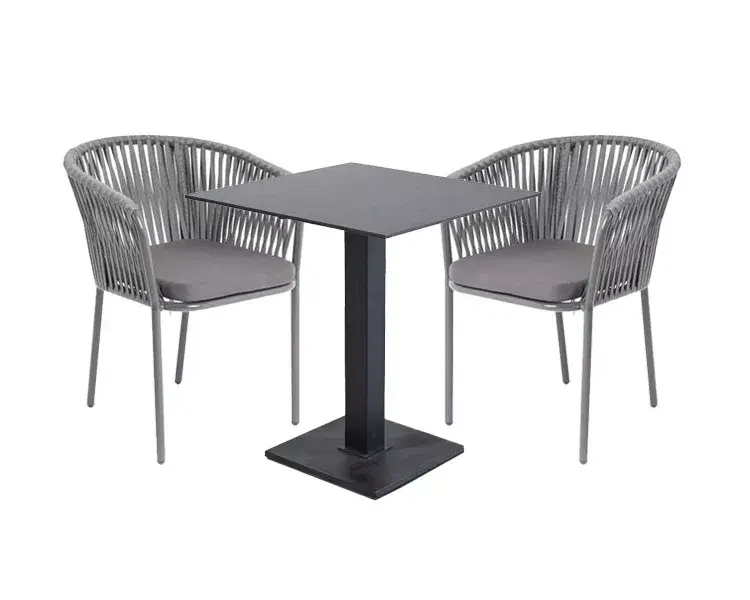 Стулья оснащены алюминиевым каркасом, которые вручную оплетены плоским роупом серого цвета.