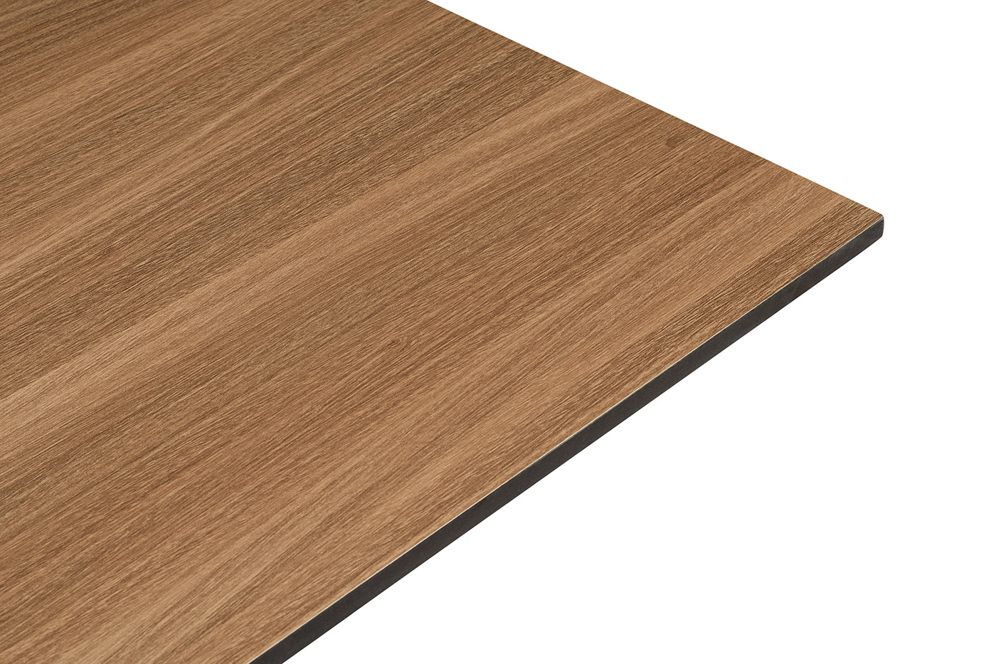 Двойное подстолье изготовлено из стали, столешница - из высококачественного монолитного компакт-пластик HPL, толщиной 12 мм, цвет «дуб».