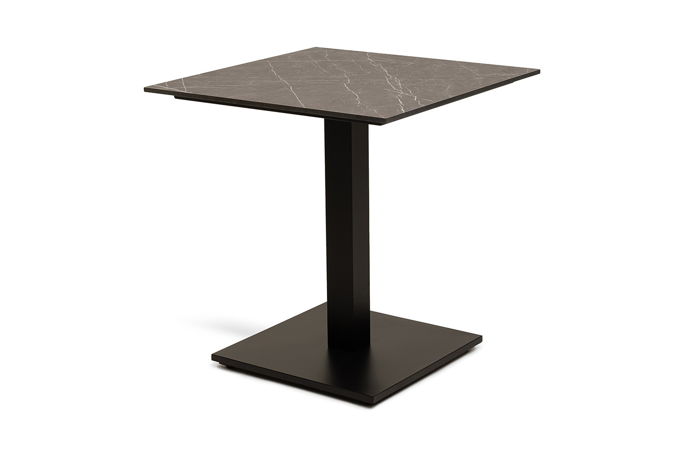 Квадратный стол «Каффе» со столешницей из HPL в цвете «серый мрамор». Это высококачественный ударопрочный компакт-пластик, обладающий низкой пористостью, что предотвращает впитывание жидкостей, поэтому столы из HPL идеально подходит для обеденных зон. Толщина столешницы – 12 мм.
