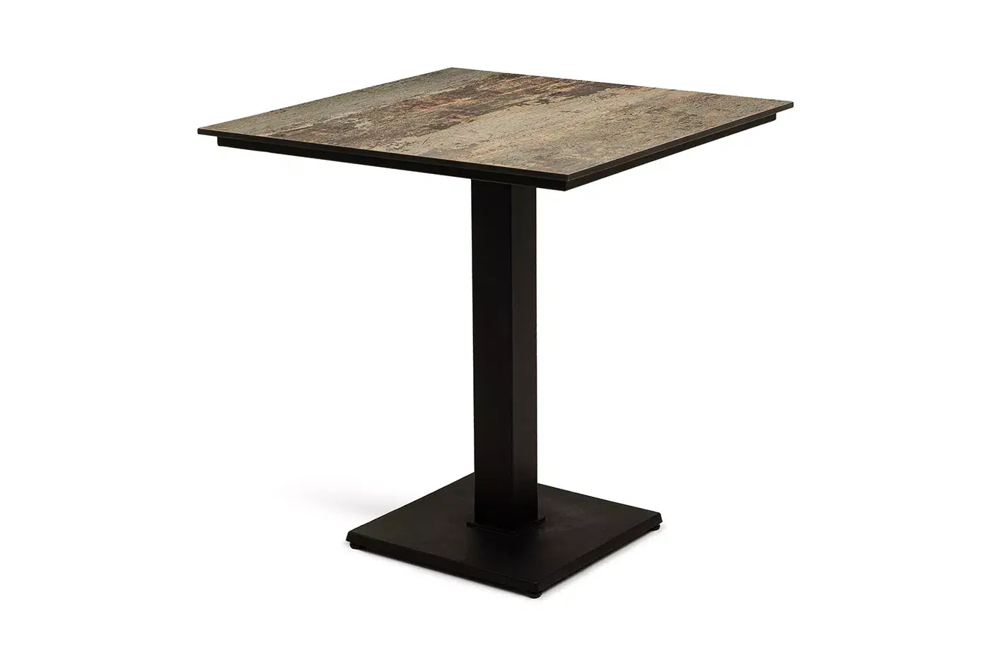 Квадратный интерьерный стол «Каффе» для двоих персон. Столешница выполнена из современного полимерного компакт-пластиком HPL, толщиной 12 мм. Этот материал устойчив к высоким температурам (можно ставить горячую посуду), пролитой жидкости, не требует специального ухода. Подстолье изготовлено из чугуна, благодаря чему столик очень устойчив на любых поверхностях.