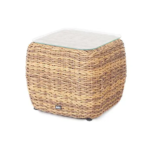 «Кальяри» кофейный столик, алюминиевый каркас, искусственный ротанг вида "гиацинт", ручное плетение, столешница из закаленного стекла толщиной 5 мм, размер: 540×540×430 мм, цвет соломенный, вес: 7,5 кг.