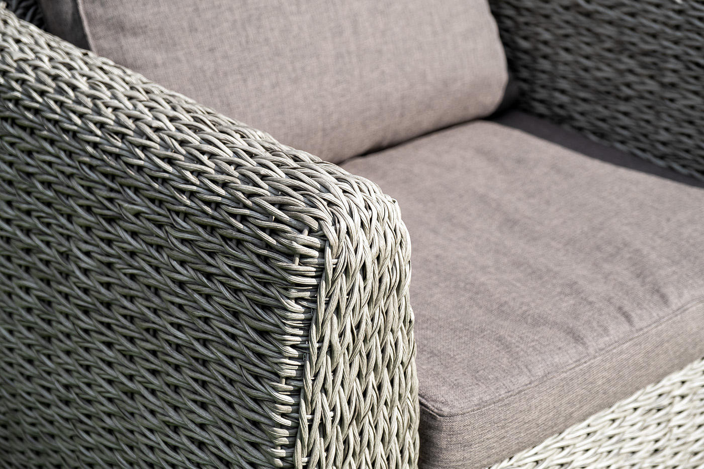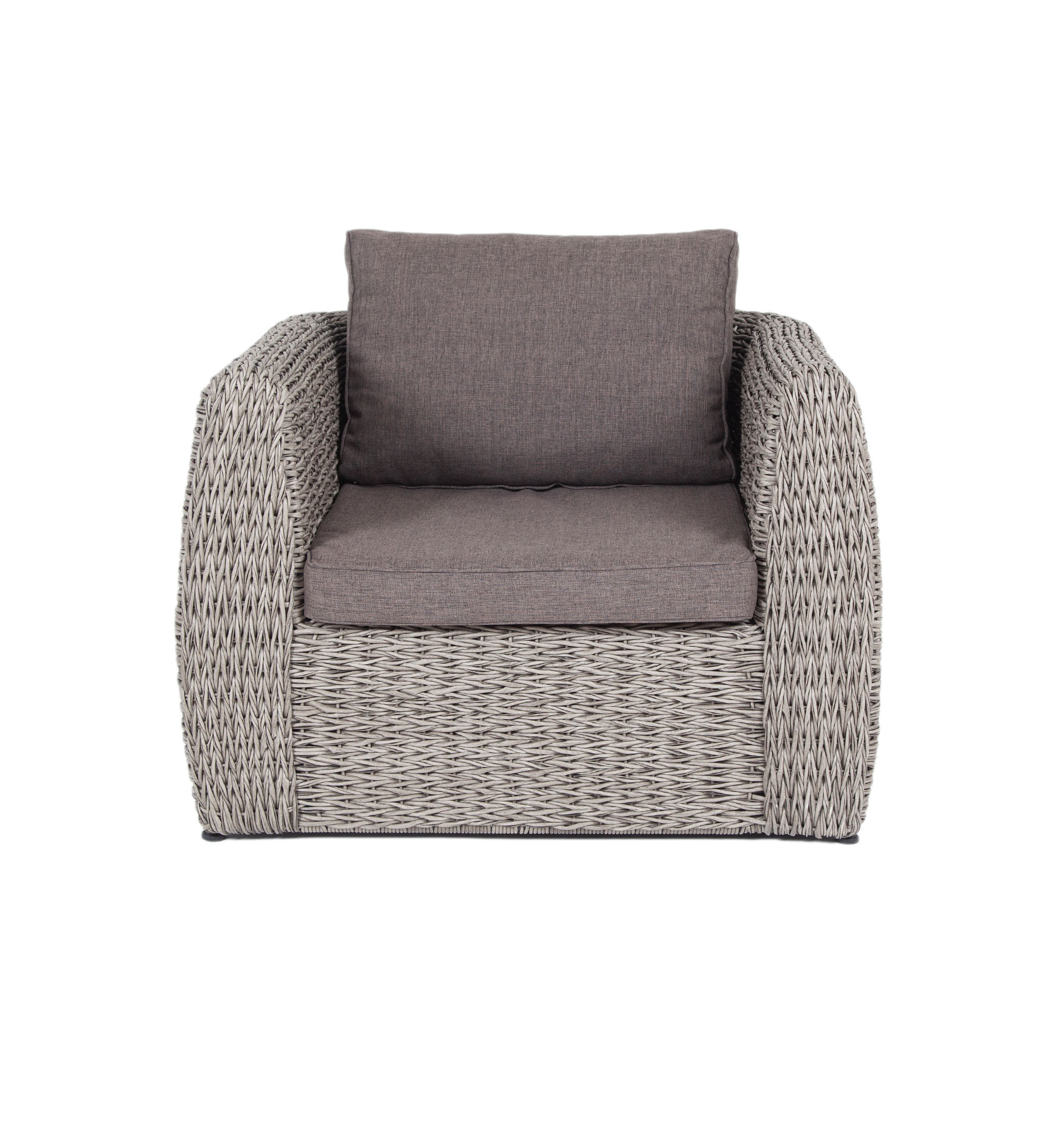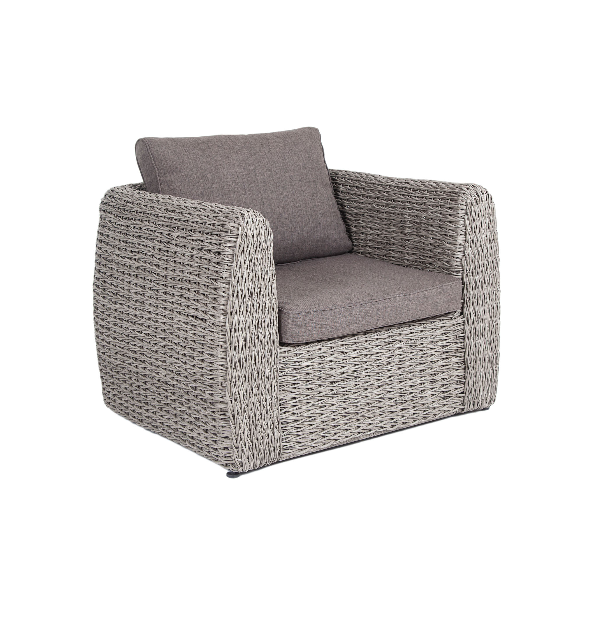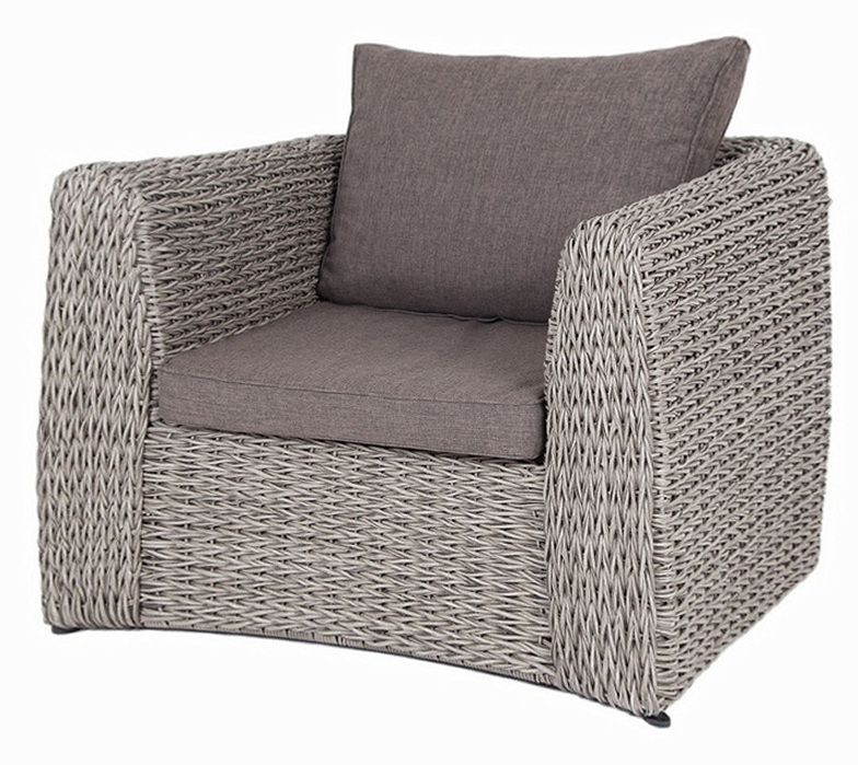 Кресло из искусственного ротанга «Кальяри» оснащено каркасом из прочного алюминия, ручное круглое плетение является основным декоративным элементом мебели. Оно выполнено из искусственного ротанга вида «гиацинт» серого цвета.