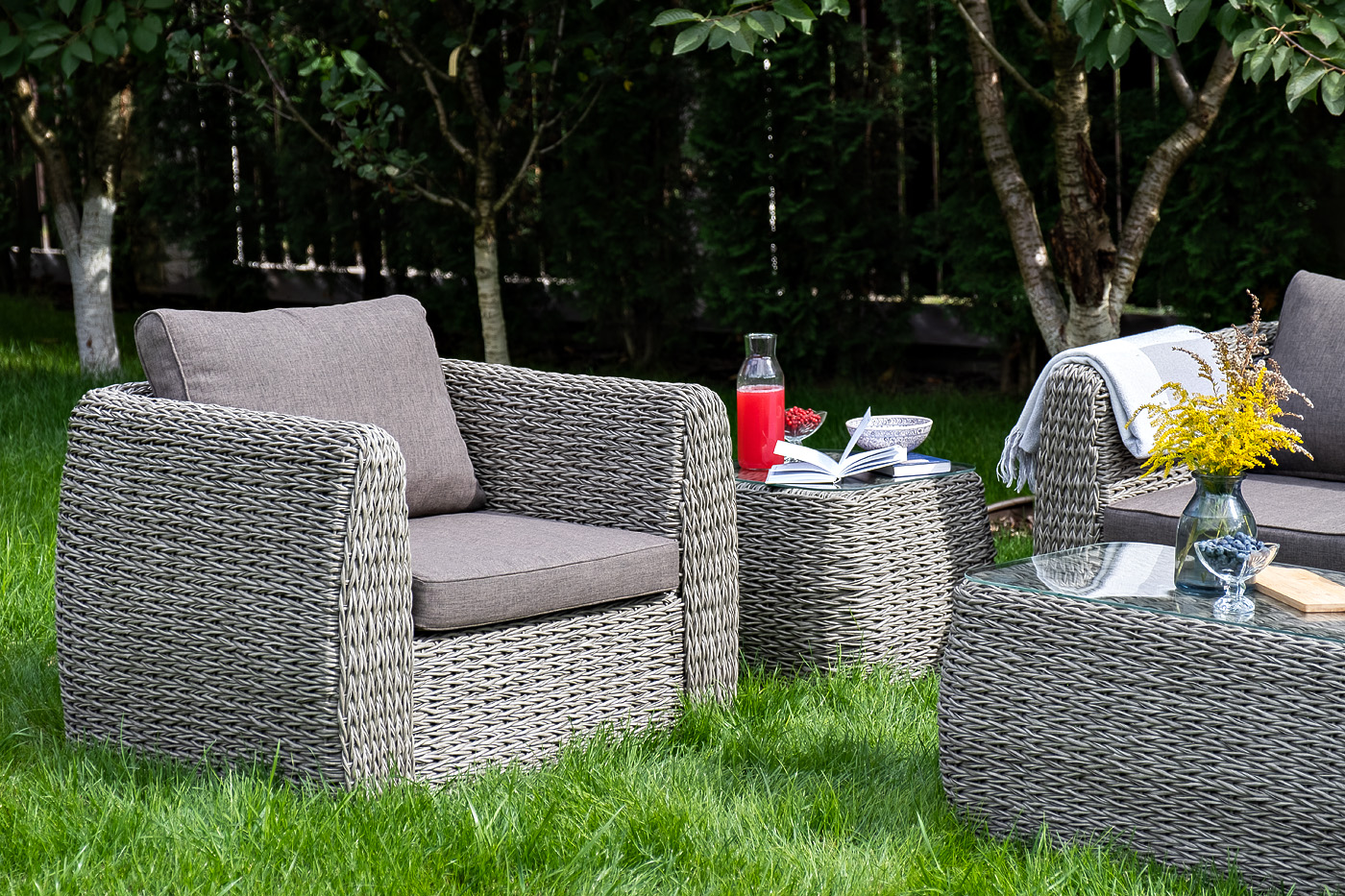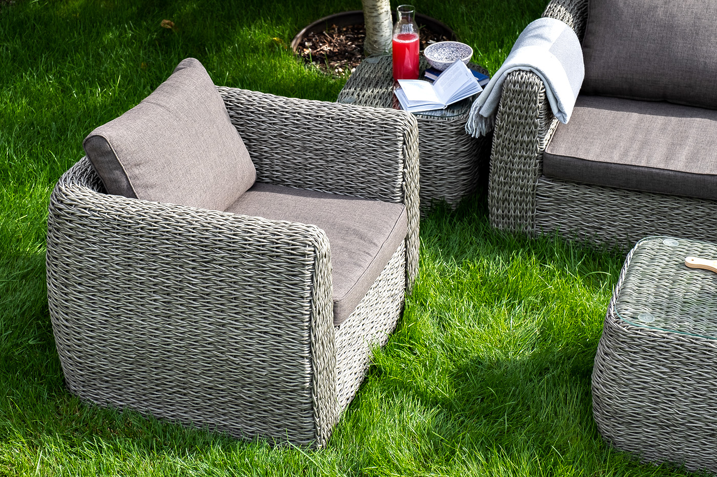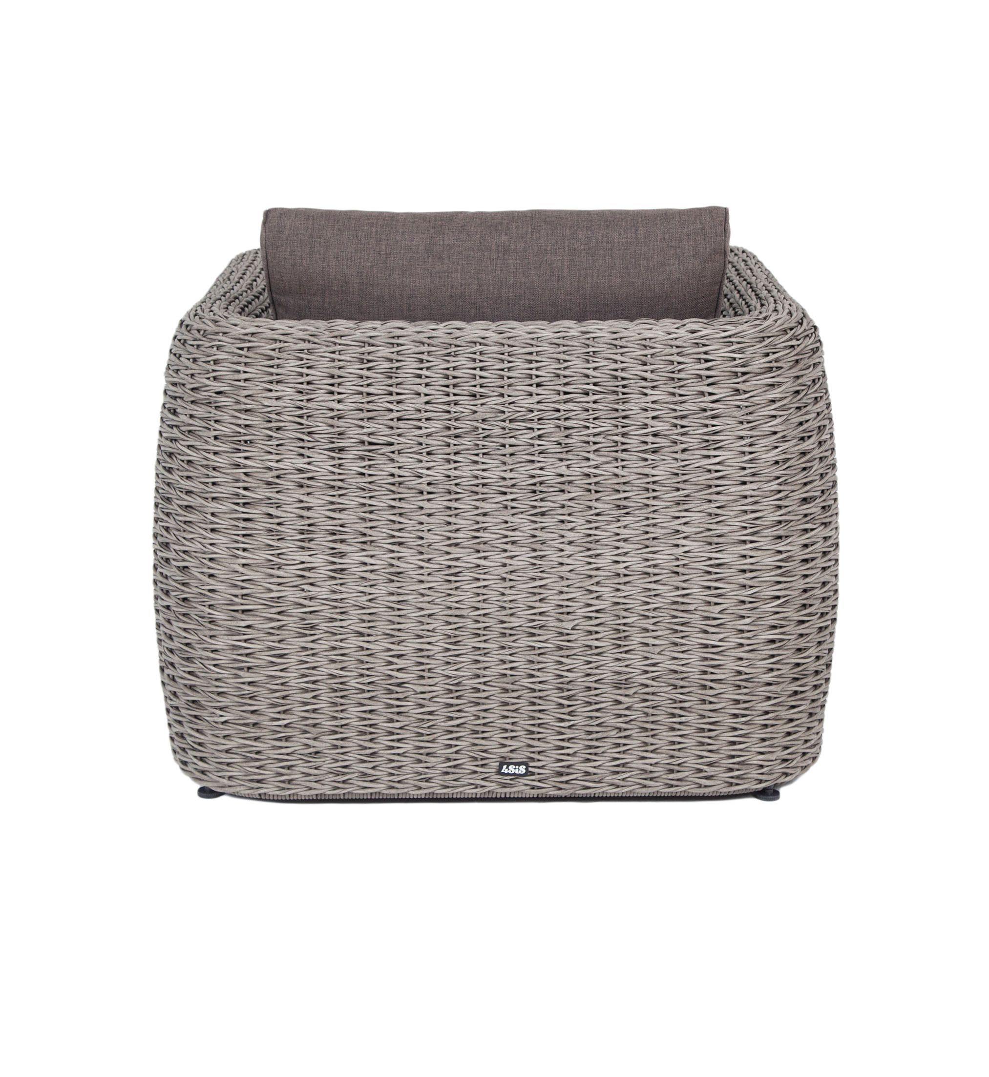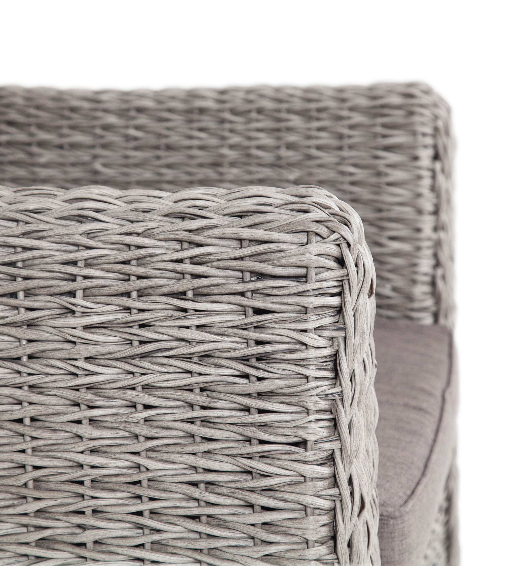 Кресло из искусственного ротанга «Кальяри» оснащено каркасом из прочного алюминия, ручное круглое плетение является основным декоративным элементом мебели. Оно выполнено из искусственного ротанга вида «гиацинт» серого цвета.