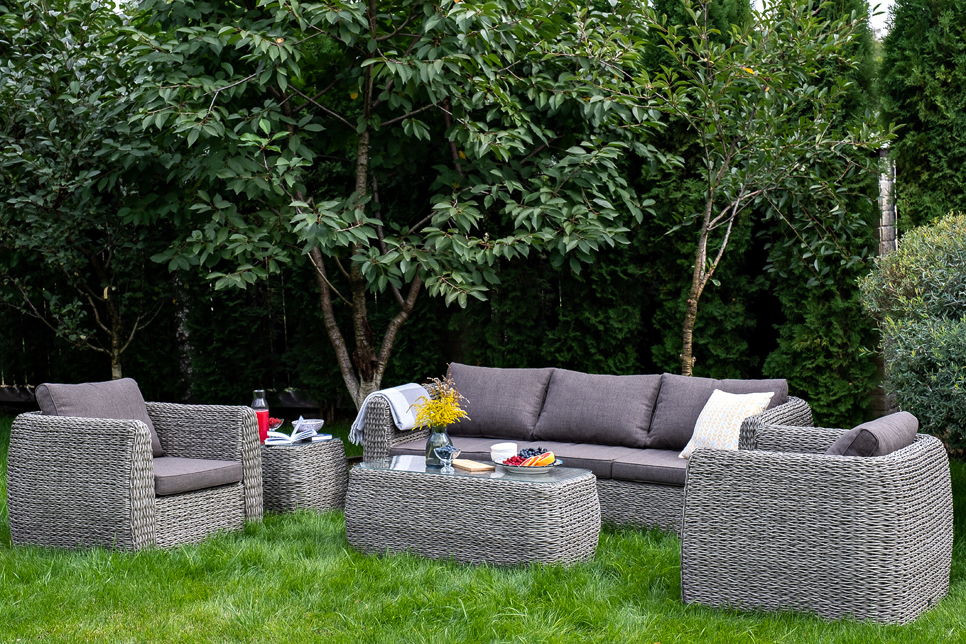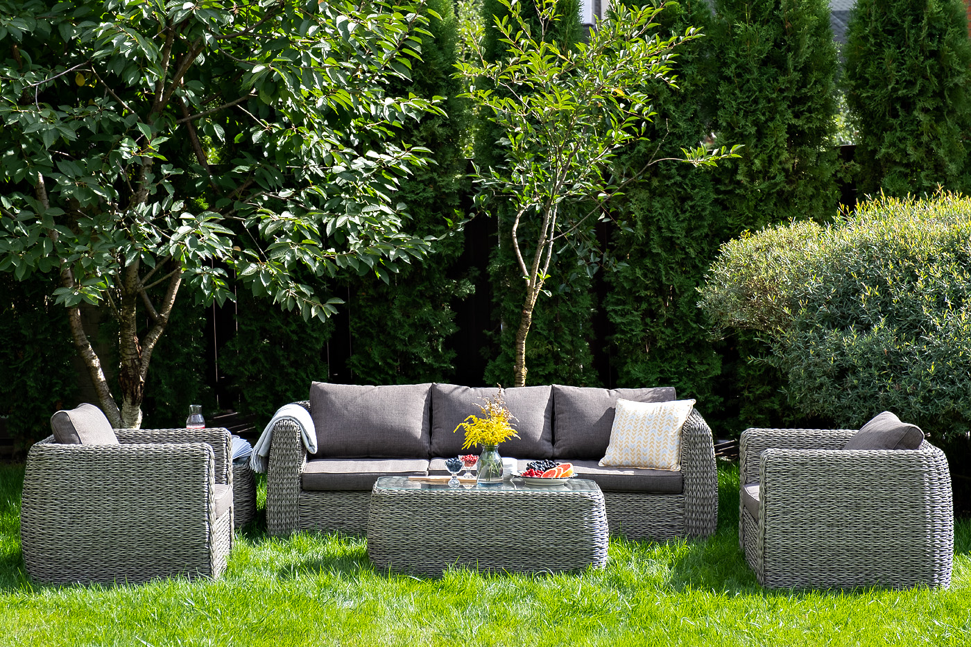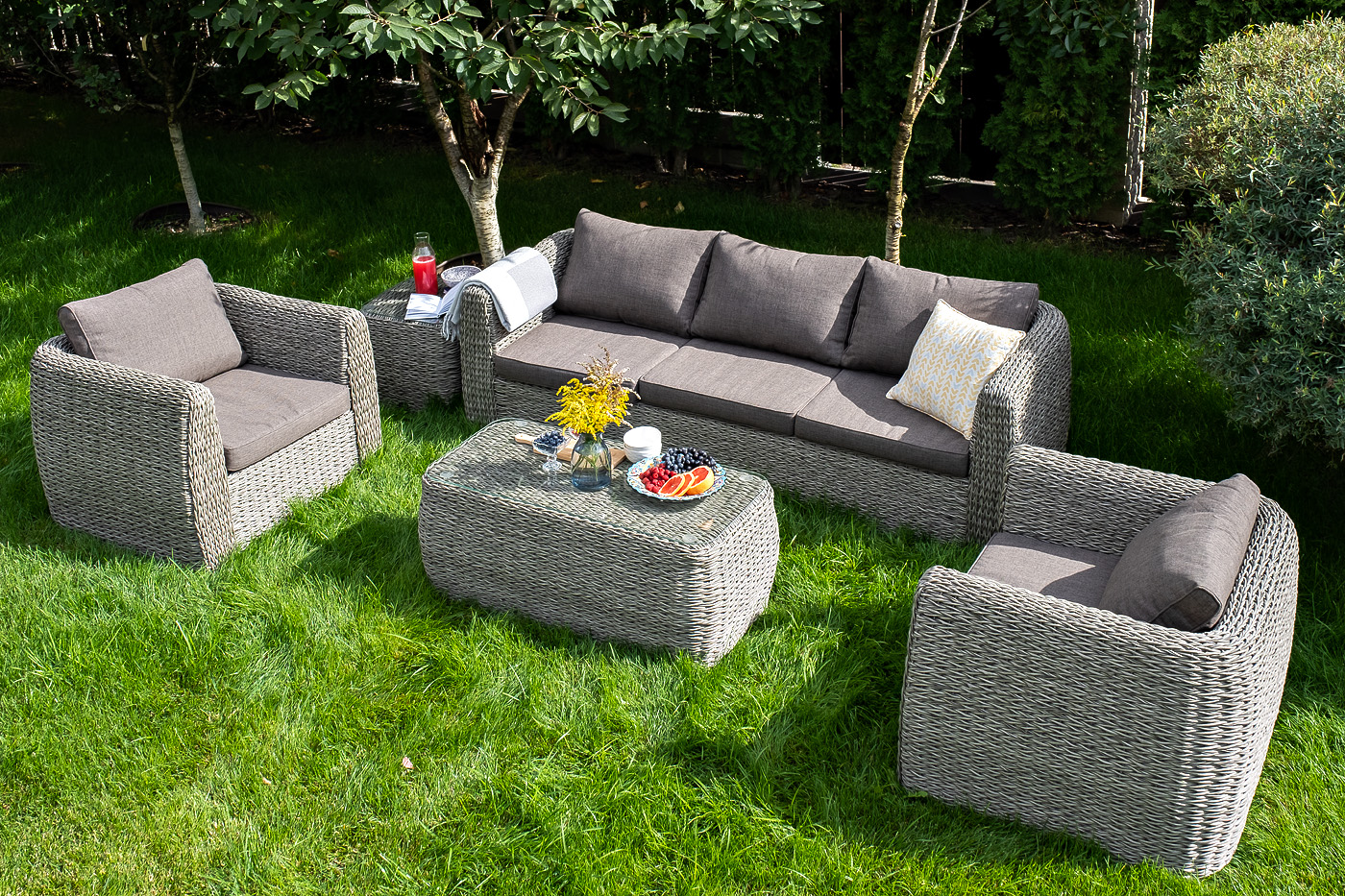 Кресло из искусственного ротанга «Кальяри» оснащено каркасом из прочного алюминия, ручное круглое плетение является основным декоративным элементом мебели. Оно выполнено из искусственного ротанга вида «гиацинт» серого цвета.