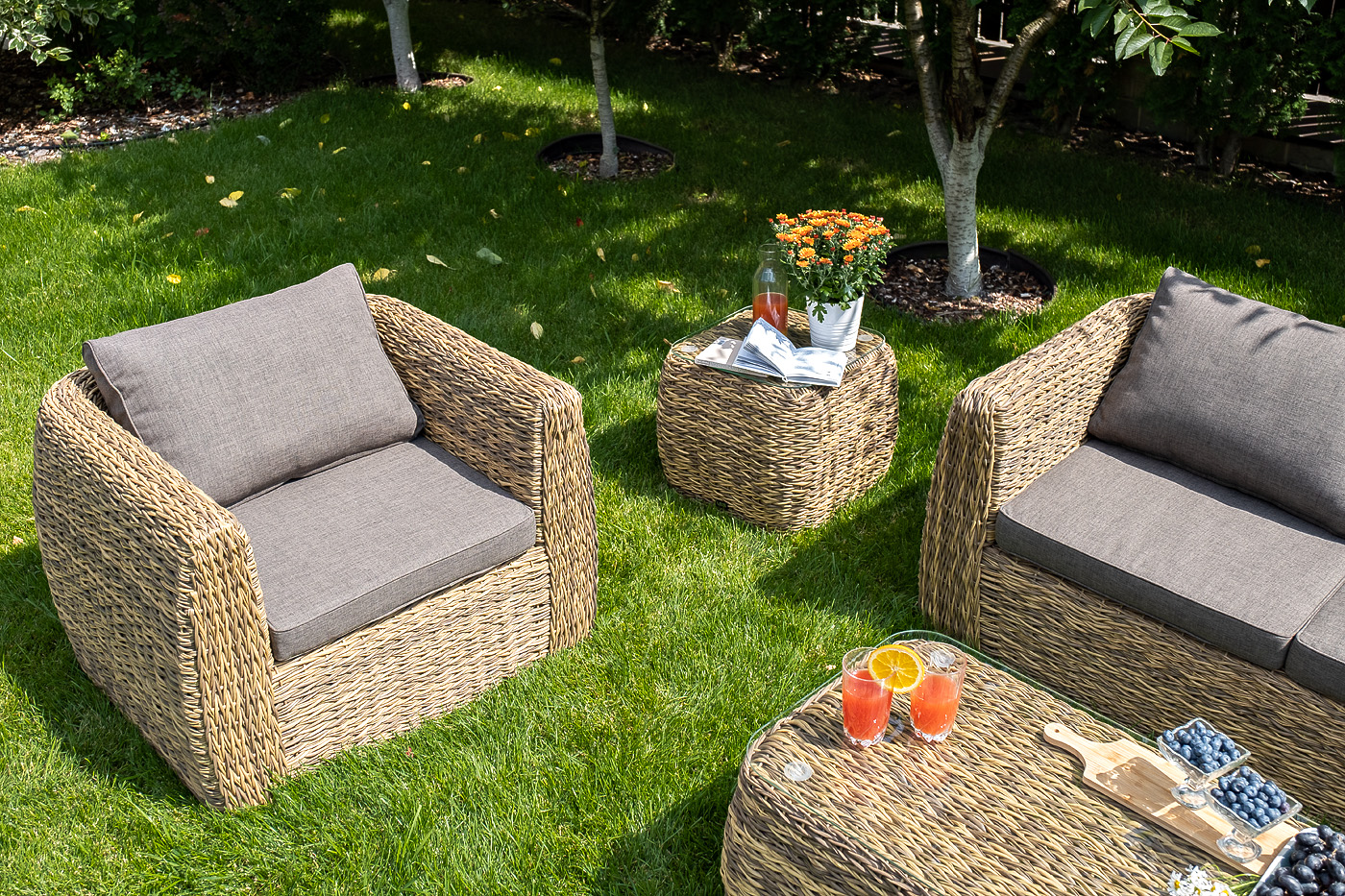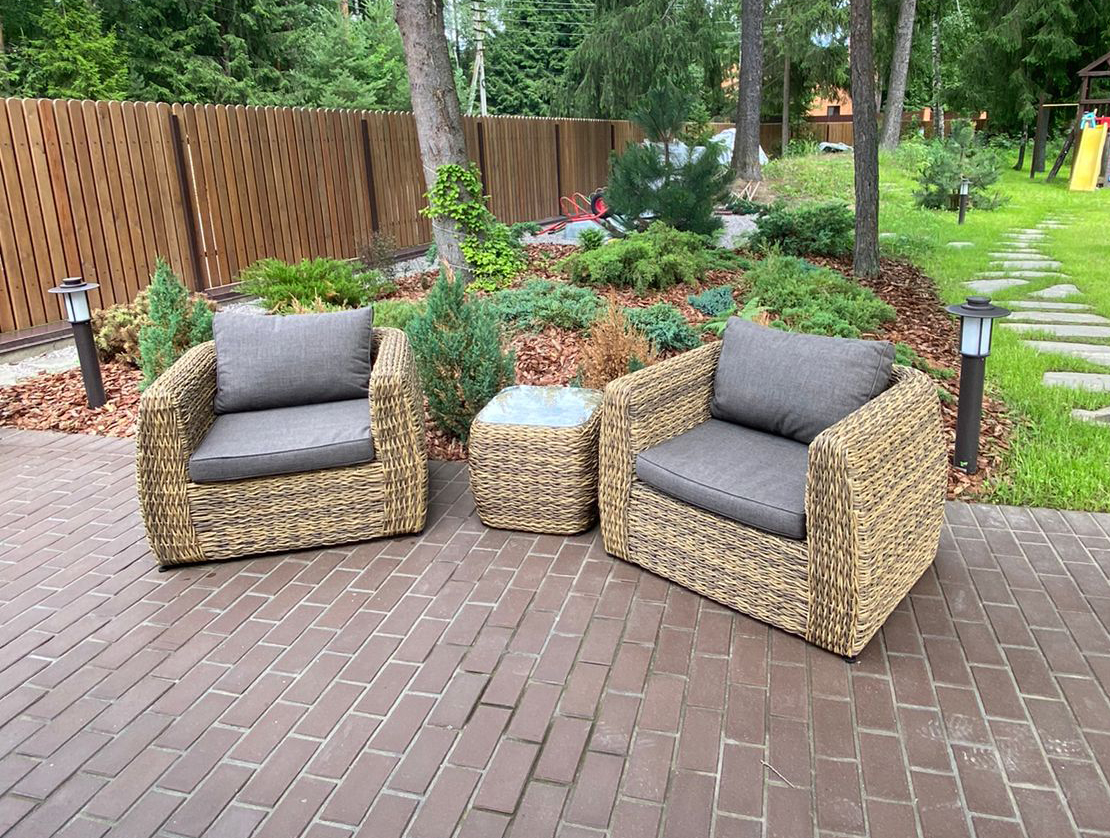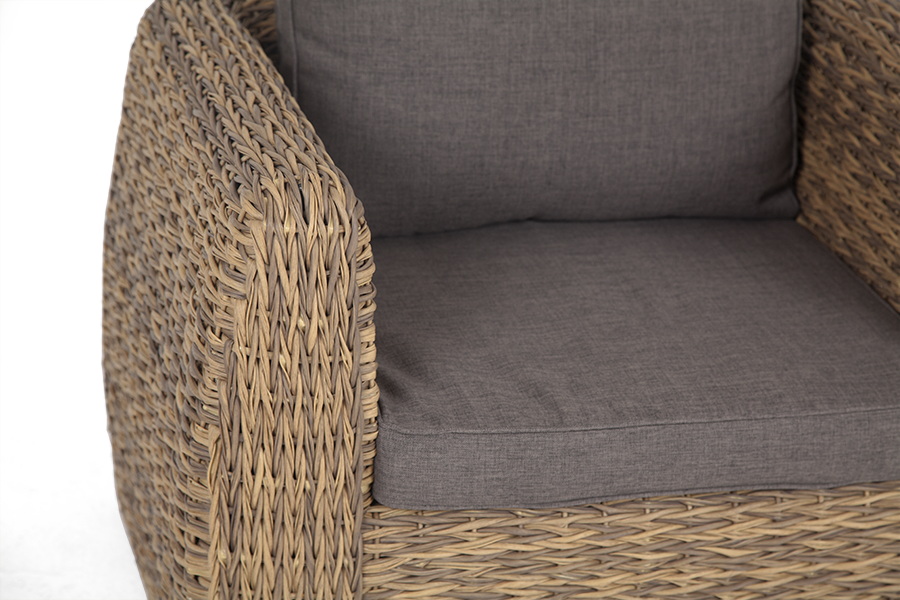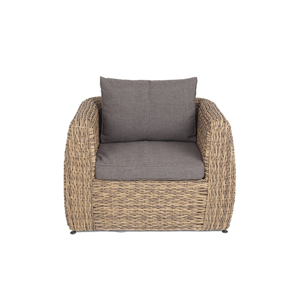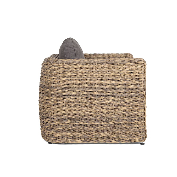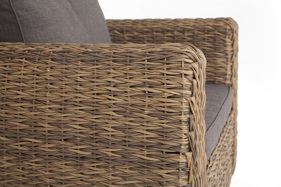 Кресло из искусственного ротанга «Кальяри» оснащено каркасом из прочного алюминия, ручное круглое плетение является основным декоративным элементом мебели. Оно выполнено из искусственного ротанга вида «гиацинт» соломенного цвета.