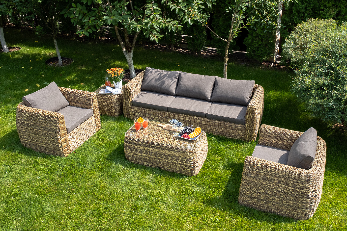 В комплектацию входят мягкие подушки для комфортного расположения. Чехлы съёмные серого цвета из высококлассного полиэстера с плотностью 300гр/м2. Габариты модели составляют 980×880×680 мм, толщина подушки: 80 мм, вес: 18 кг.