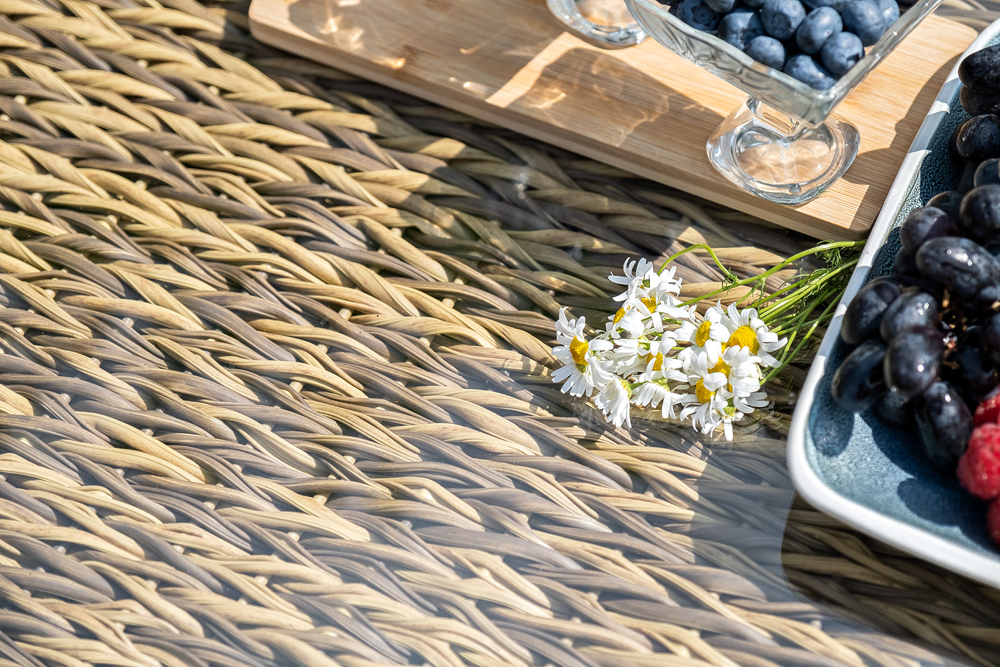 Каркас столика изготовлен из алюминия, вручную оплетенного круглым искусственным ротангом "гиацинт".