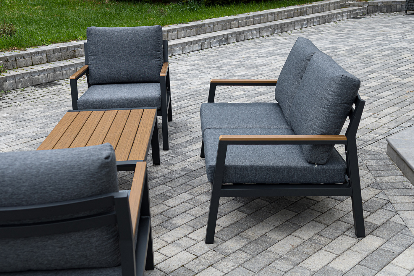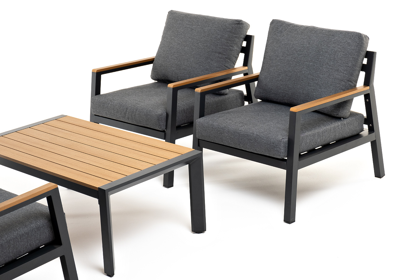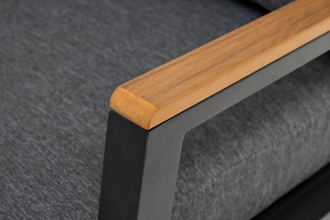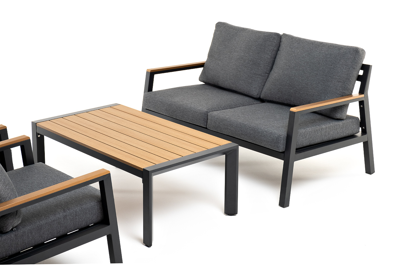 Каркас мебели выполнен из прочного алюминия темно-серого цвета. На подлокотниках дивана и двух кресел установлен облицовочный материал из древесно полимерного композита (ДПК) цвет «дерево». Крепление к каркасу осуществляется на болтах с пластиковыми заглушками темно-серого цвета, которые не ржавеют. Комплект дополняют подушки со съёмными чехлами. Материал чехлов - 100% полиэстер плотностью 190гр/м2.