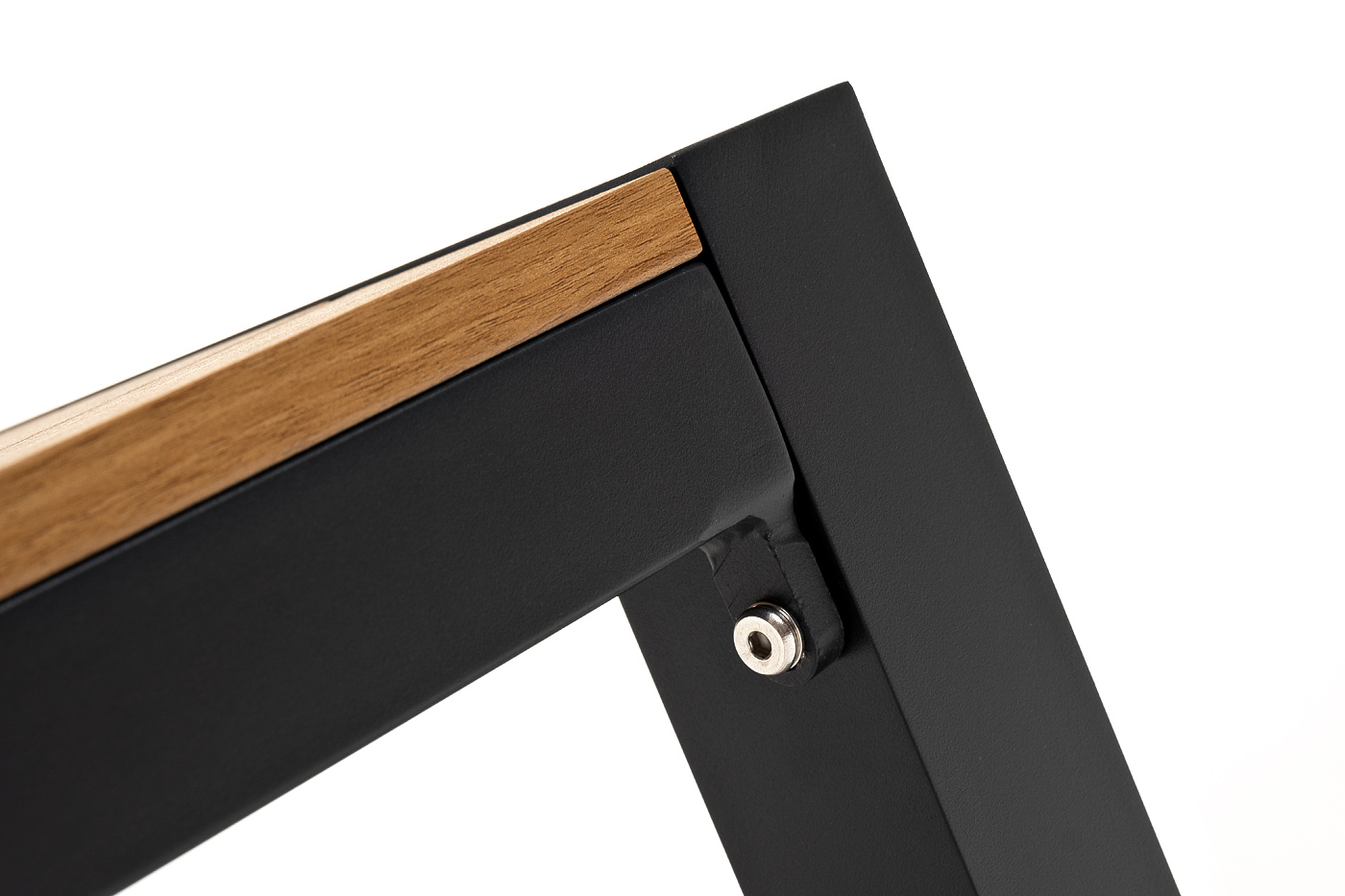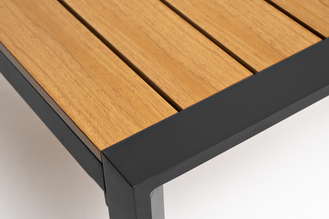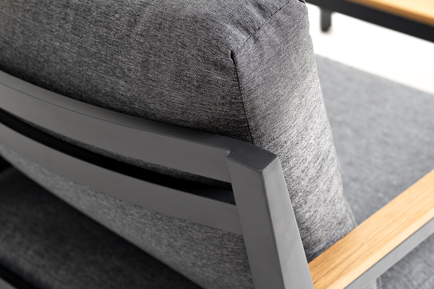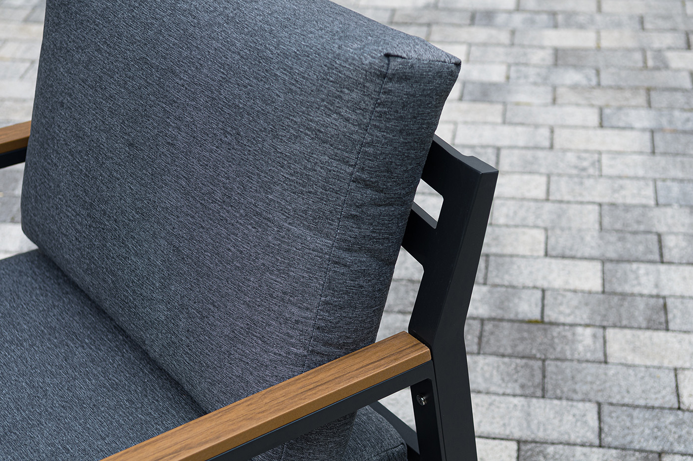 Каркас мебели выполнен из прочного алюминия темно-серого цвета. На подлокотниках дивана и двух кресел установлен облицовочный материал из древесно полимерного композита (ДПК) цвет «дерево». Крепление к каркасу осуществляется на болтах с пластиковыми заглушками темно-серого цвета, которые не ржавеют. Комплект дополняют подушки со съёмными чехлами. Материал чехлов - 100% полиэстер плотностью 190гр/м2.