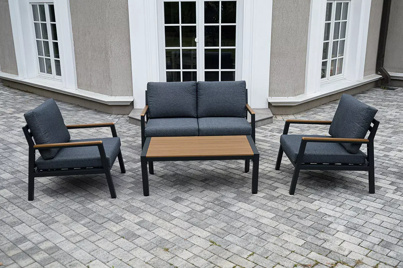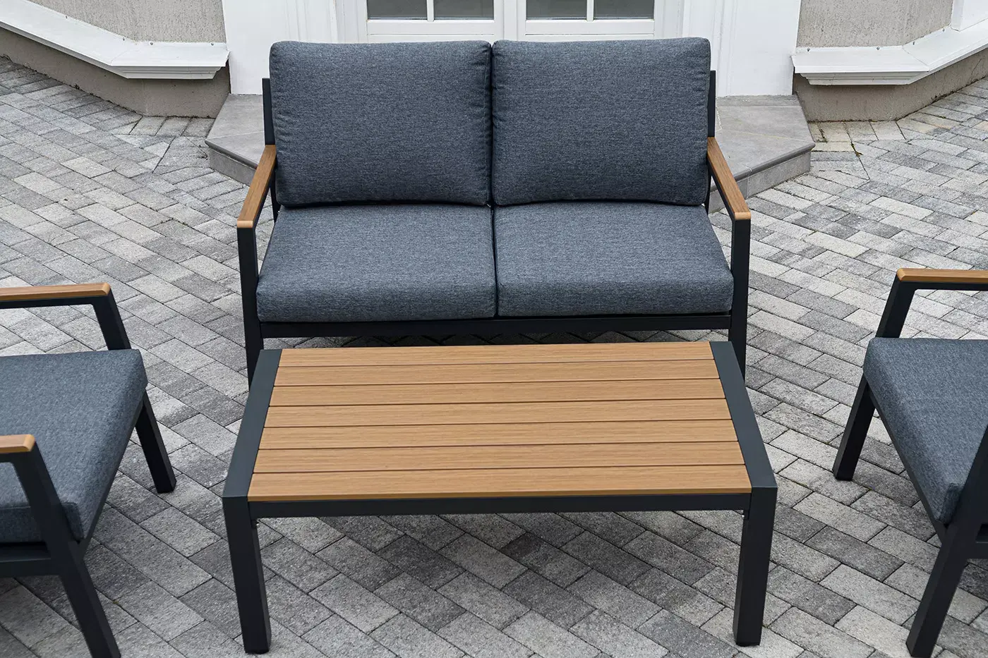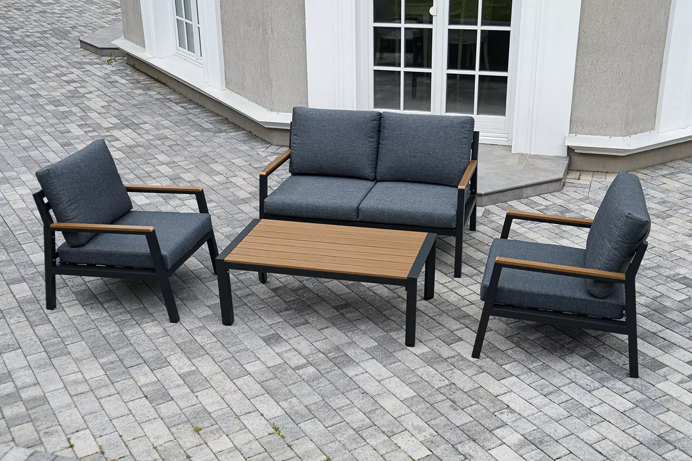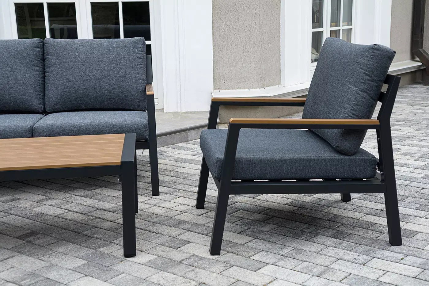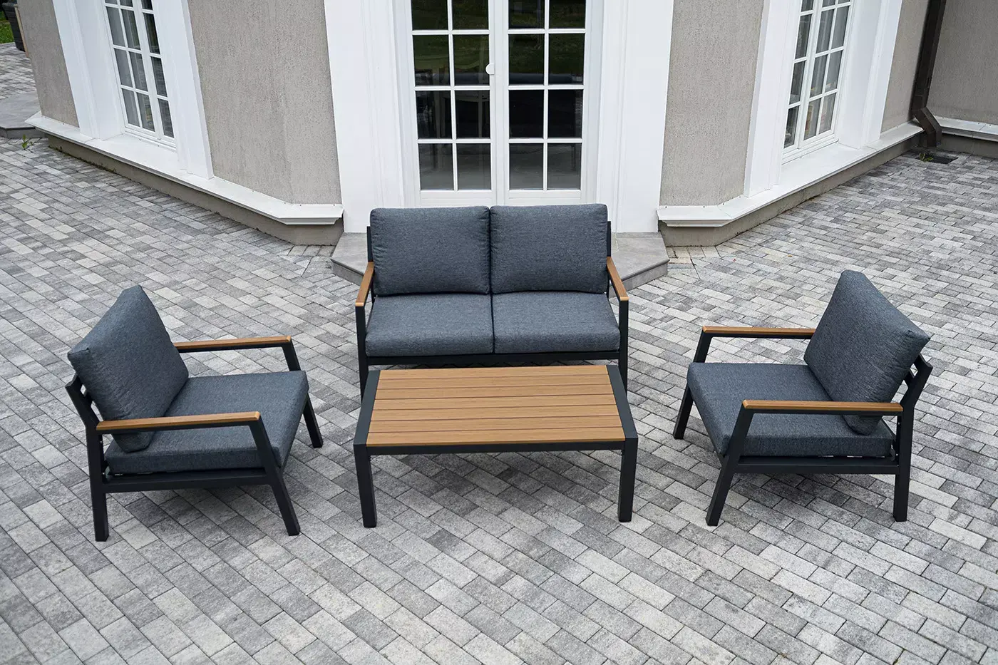 Каркас мебели выполнен из прочного алюминия темно-серого цвета. На подлокотниках дивана и двух кресел установлен облицовочный материал из древесно полимерного композита (ДПК) цвет «дерево». Крепление к каркасу осуществляется на болтах с пластиковыми заглушками темно-серого цвета, которые не ржавеют. Комплект дополняют подушки со съёмными чехлами. Материал чехлов - 100% полиэстер плотностью 190гр/м2.
