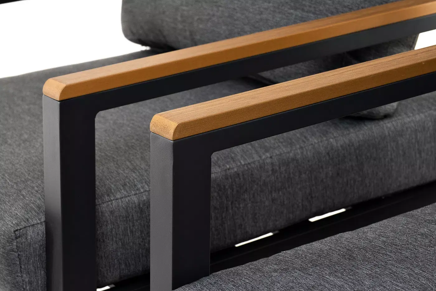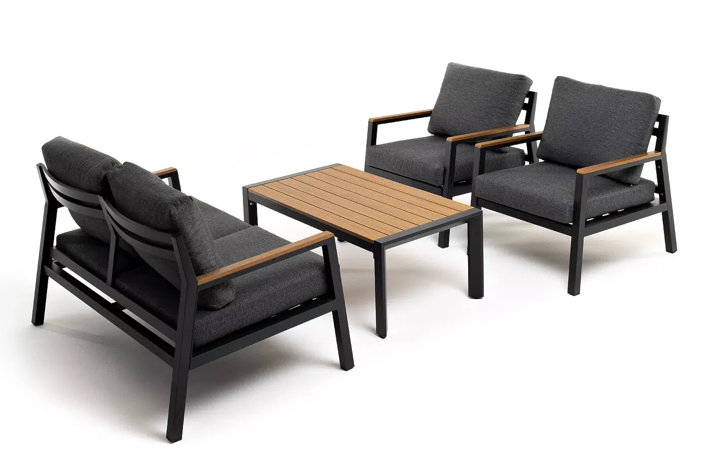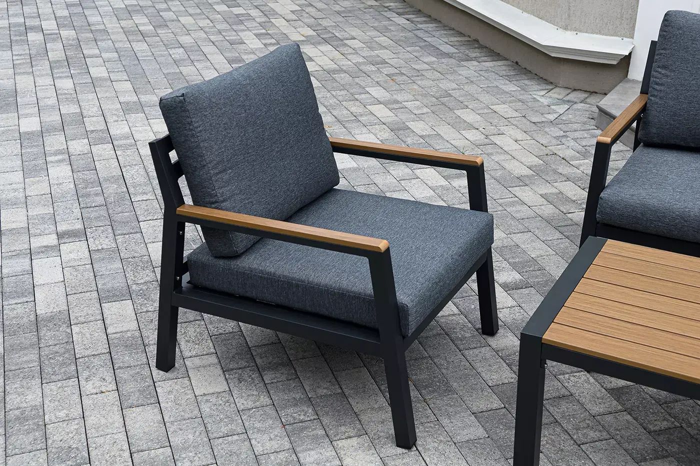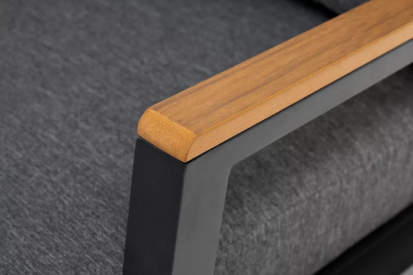Каркас мебели выполнен из прочного алюминия темно-серого цвета. На подлокотниках дивана и двух кресел установлен облицовочный материал из древесно полимерного композита (ДПК) цвет «дерево». Крепление к каркасу осуществляется на болтах с пластиковыми заглушками темно-серого цвета, которые не ржавеют. Комплект дополняют подушки со съёмными чехлами. Материал чехлов - 100% полиэстер плотностью 190гр/м2.