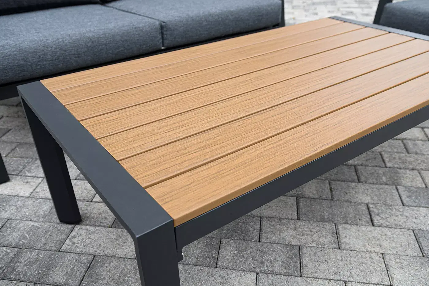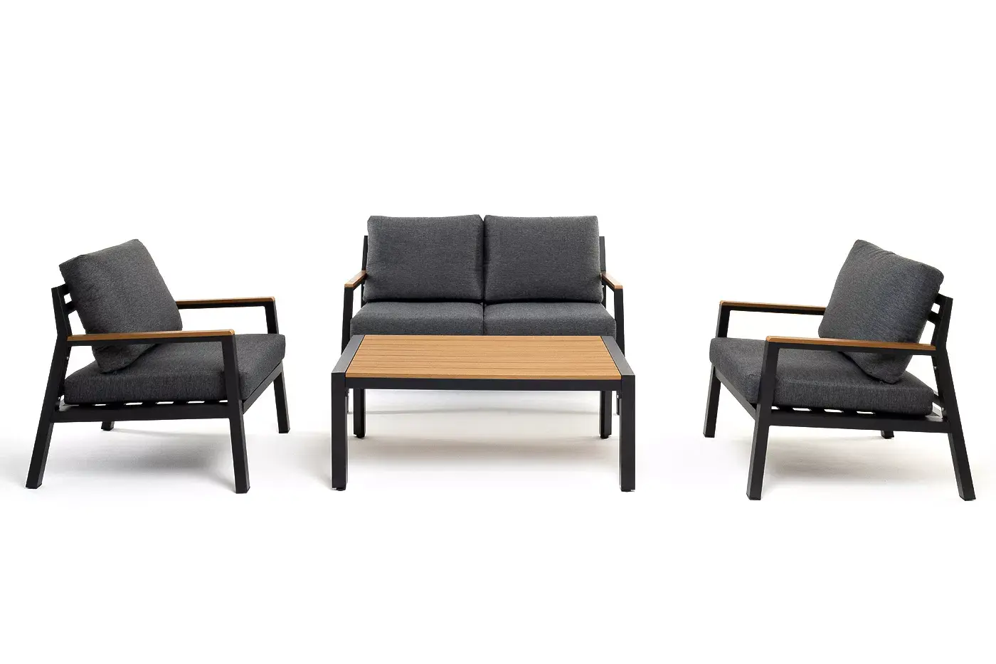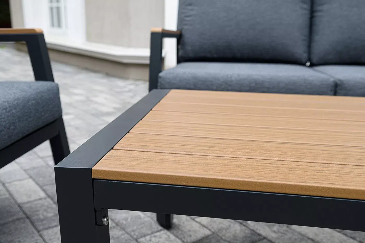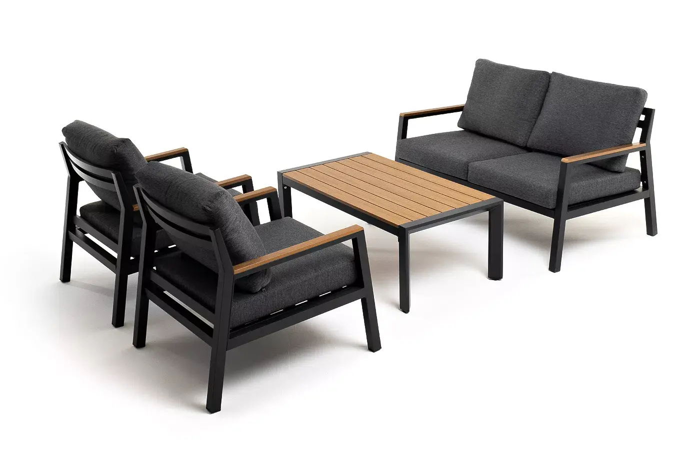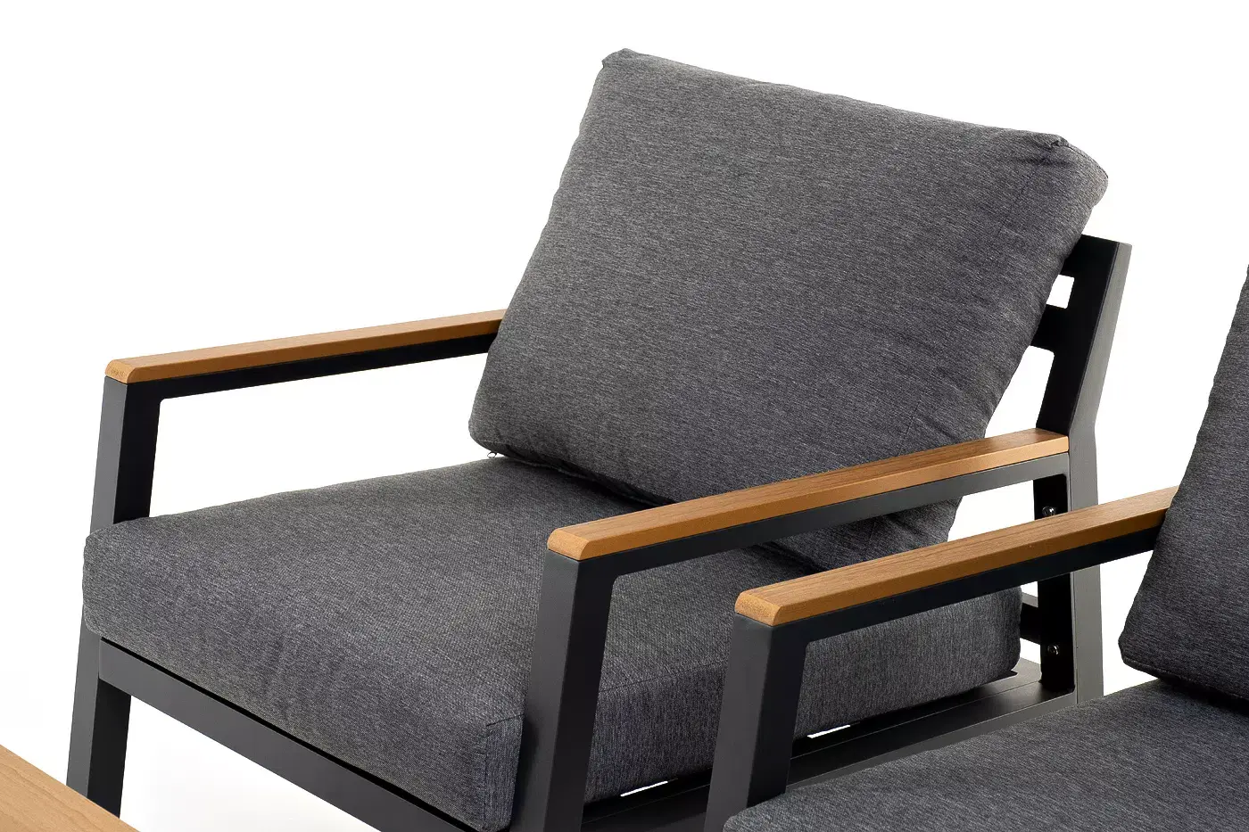 Каркас мебели выполнен из прочного алюминия темно-серого цвета. На подлокотниках дивана и двух кресел установлен облицовочный материал из древесно полимерного композита (ДПК) цвет «дерево». Крепление к каркасу осуществляется на болтах с пластиковыми заглушками темно-серого цвета, которые не ржавеют. Комплект дополняют подушки со съёмными чехлами. Материал чехлов - 100% полиэстер плотностью 190гр/м2.