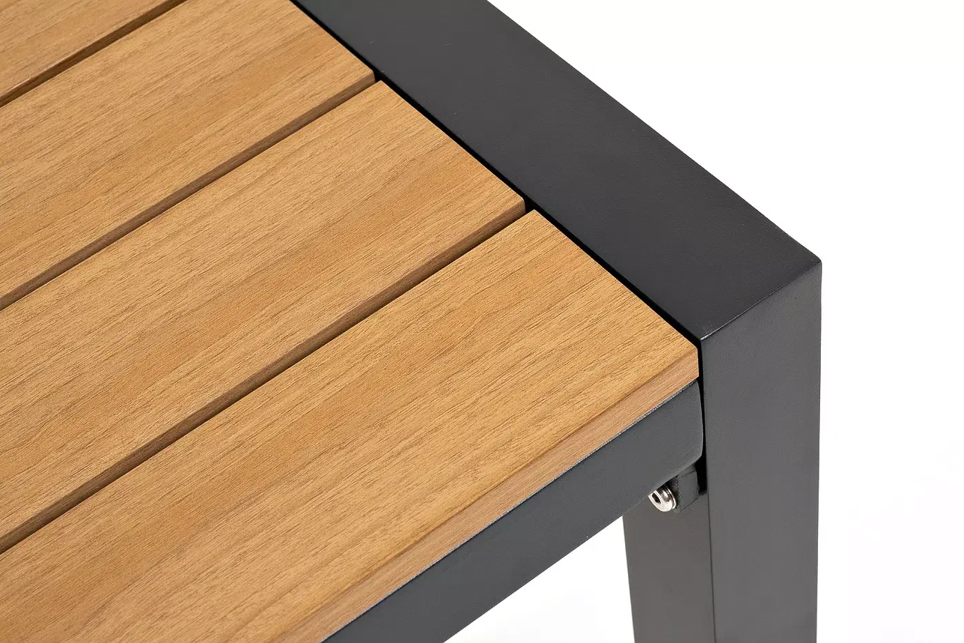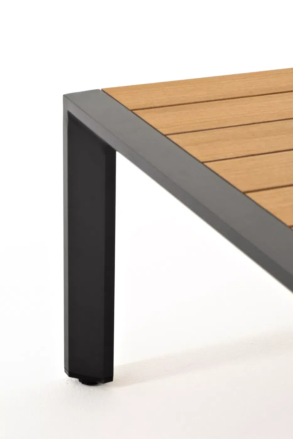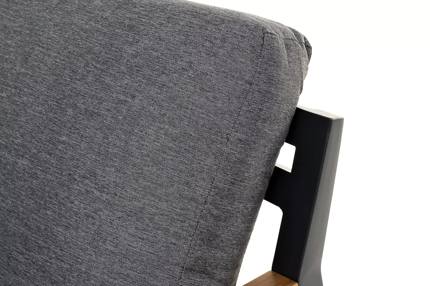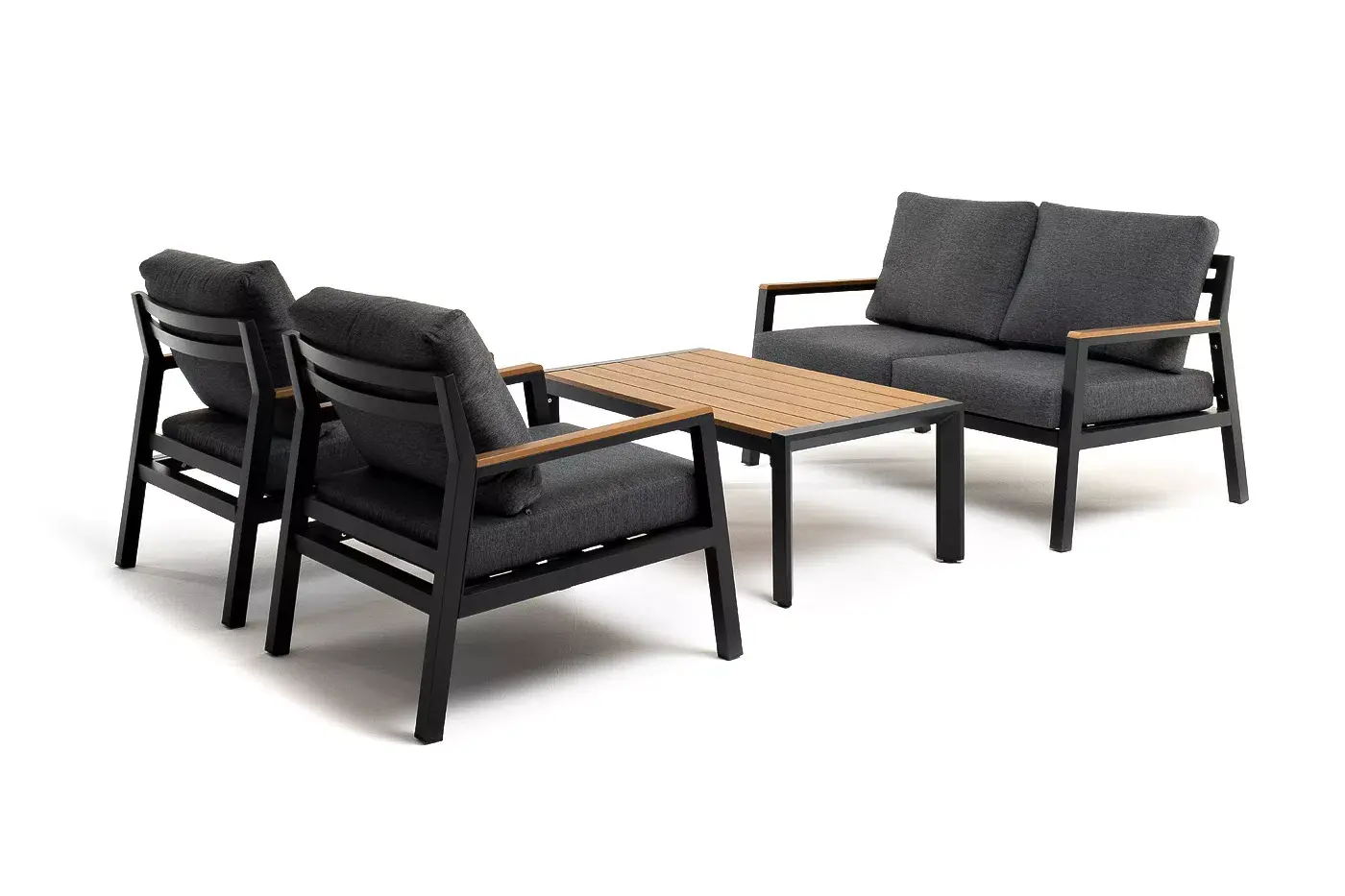 Каркас мебели выполнен из прочного алюминия темно-серого цвета. На подлокотниках дивана и двух кресел установлен облицовочный материал из древесно полимерного композита (ДПК) цвет «дерево». Крепление к каркасу осуществляется на болтах с пластиковыми заглушками темно-серого цвета, которые не ржавеют. Комплект дополняют подушки со съёмными чехлами. Материал чехлов - 100% полиэстер плотностью 190гр/м2.