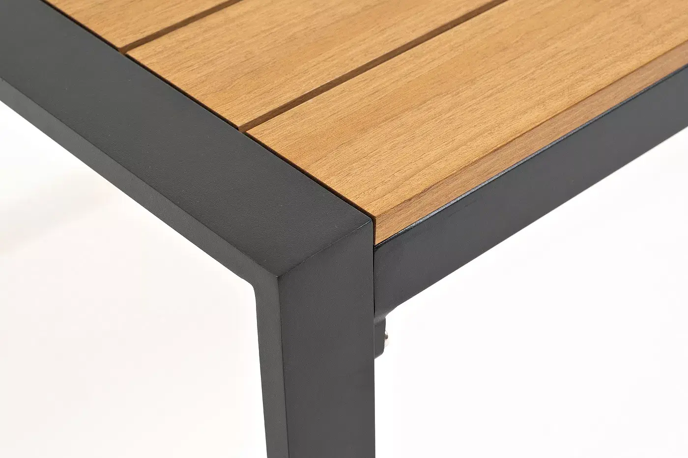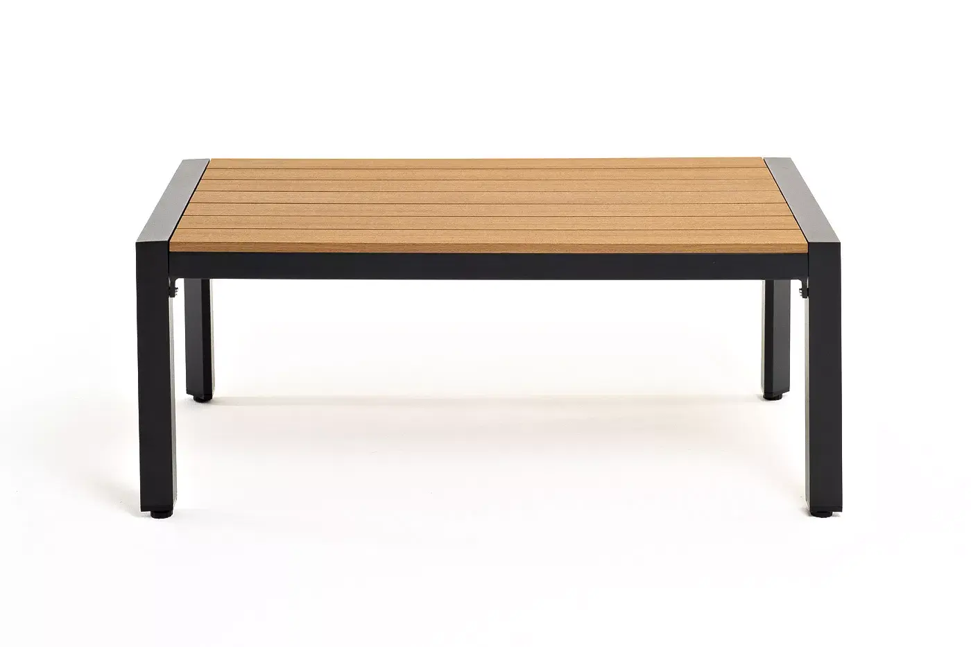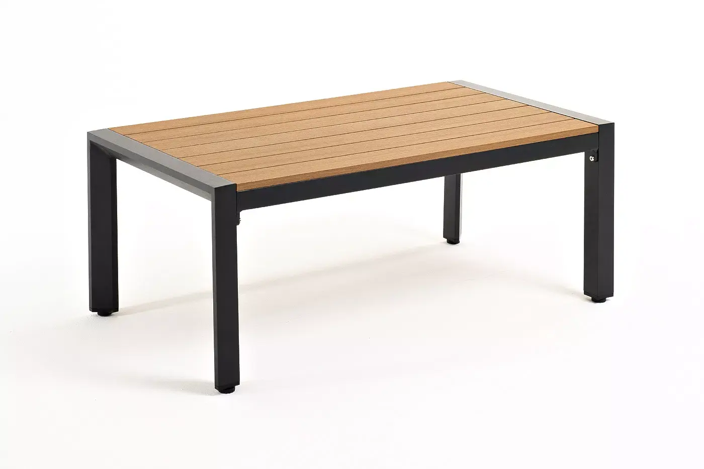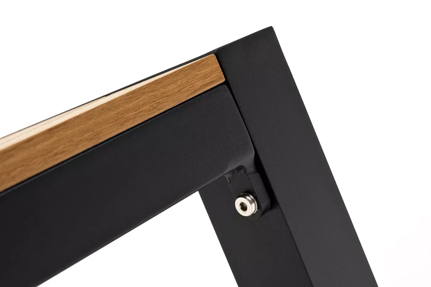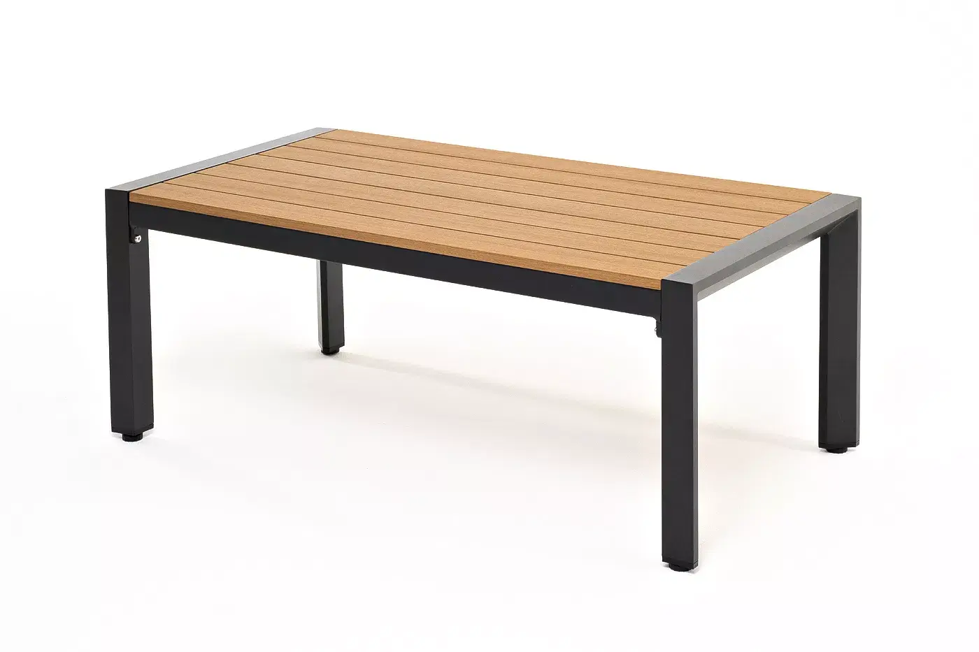 Каркас мебели выполнен из прочного алюминия темно-серого цвета. На подлокотниках дивана и двух кресел установлен облицовочный материал из древесно полимерного композита (ДПК) цвет «дерево». Крепление к каркасу осуществляется на болтах с пластиковыми заглушками темно-серого цвета, которые не ржавеют. Комплект дополняют подушки со съёмными чехлами. Материал чехлов - 100% полиэстер плотностью 190гр/м2.