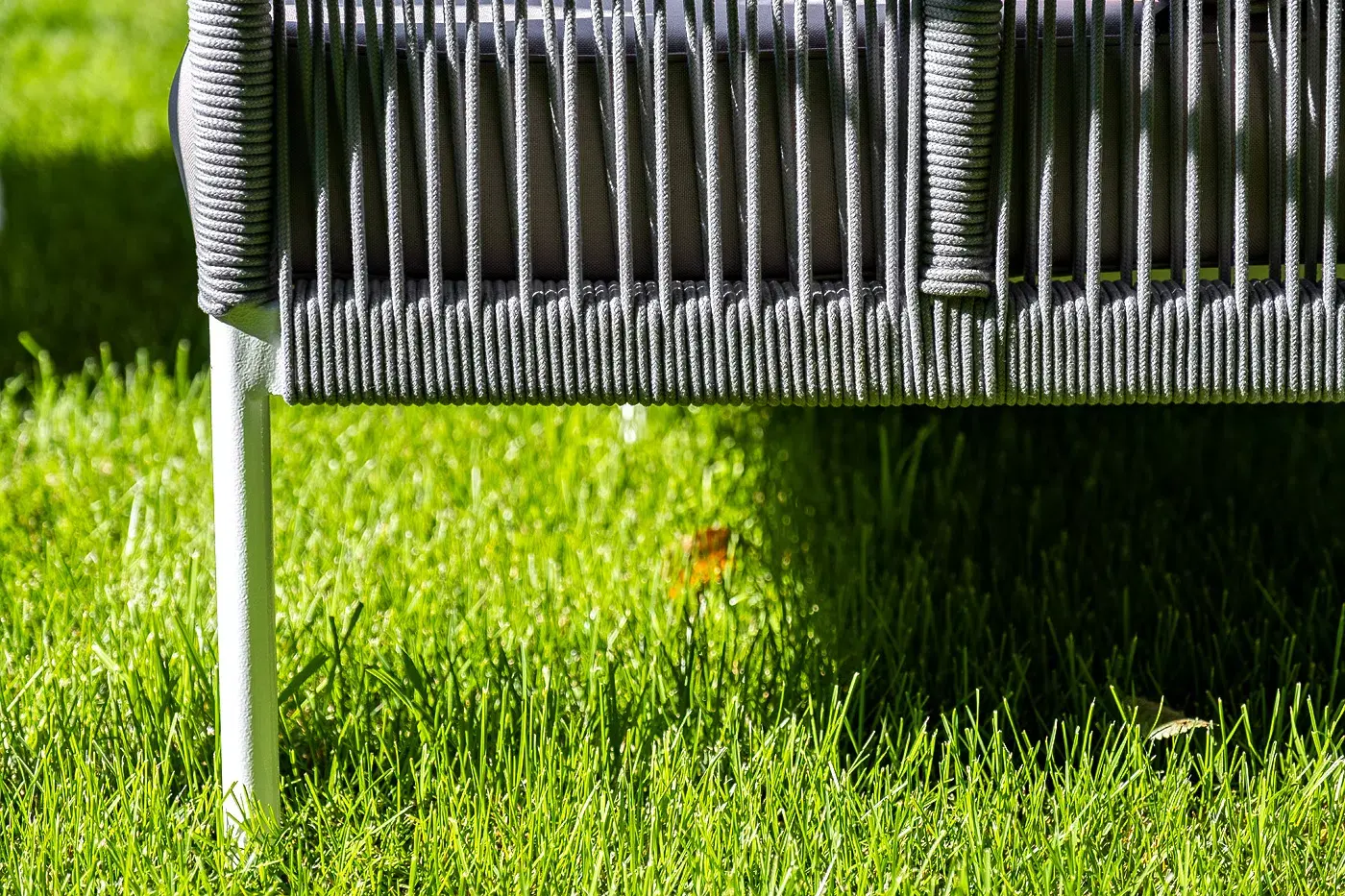 Диван имеет алюминиевый каркас, окрашенный порошковой краской в белый цвет. Боковины каркаса и спинка вручную оплетены роупом - эластичными синтетическими лентами, изготовленными из высокопрочных полиэфирных волокон. Цвет оплетки - светло-серый.