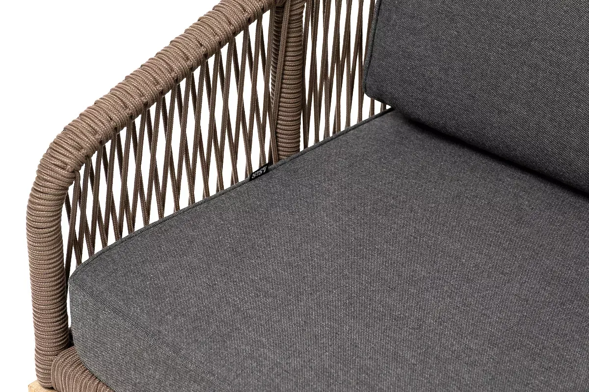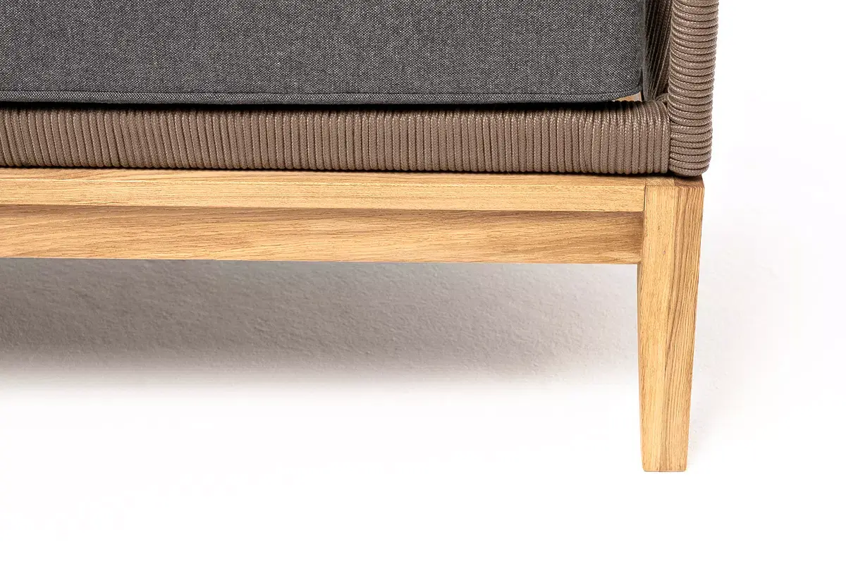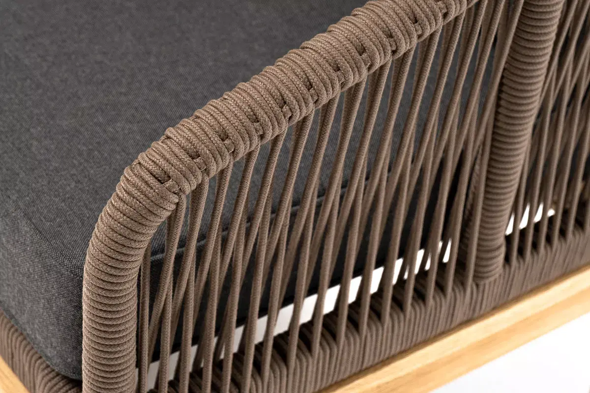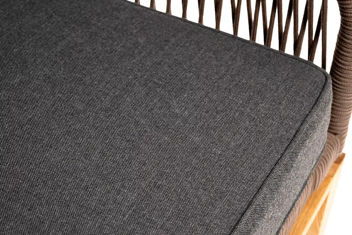 Боковины каркаса и спинка вручную оплетены роупом коричневого цвета. Это эластичные синтетические ленты, изготовленные из высокопрочных полиэфирных волокон. Основание дивана - натуральный дуб.