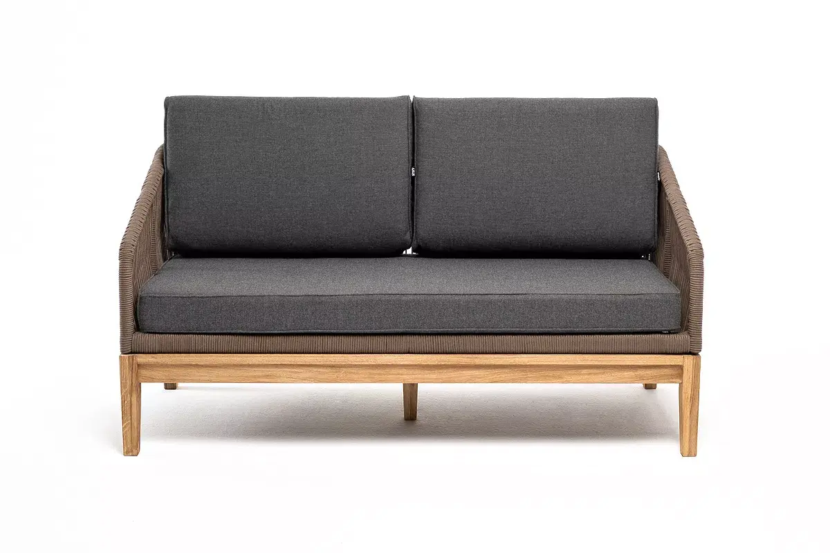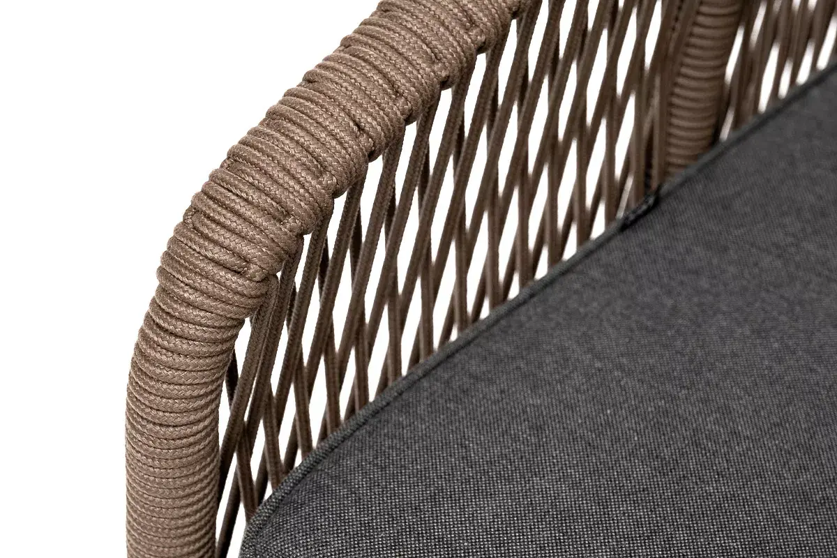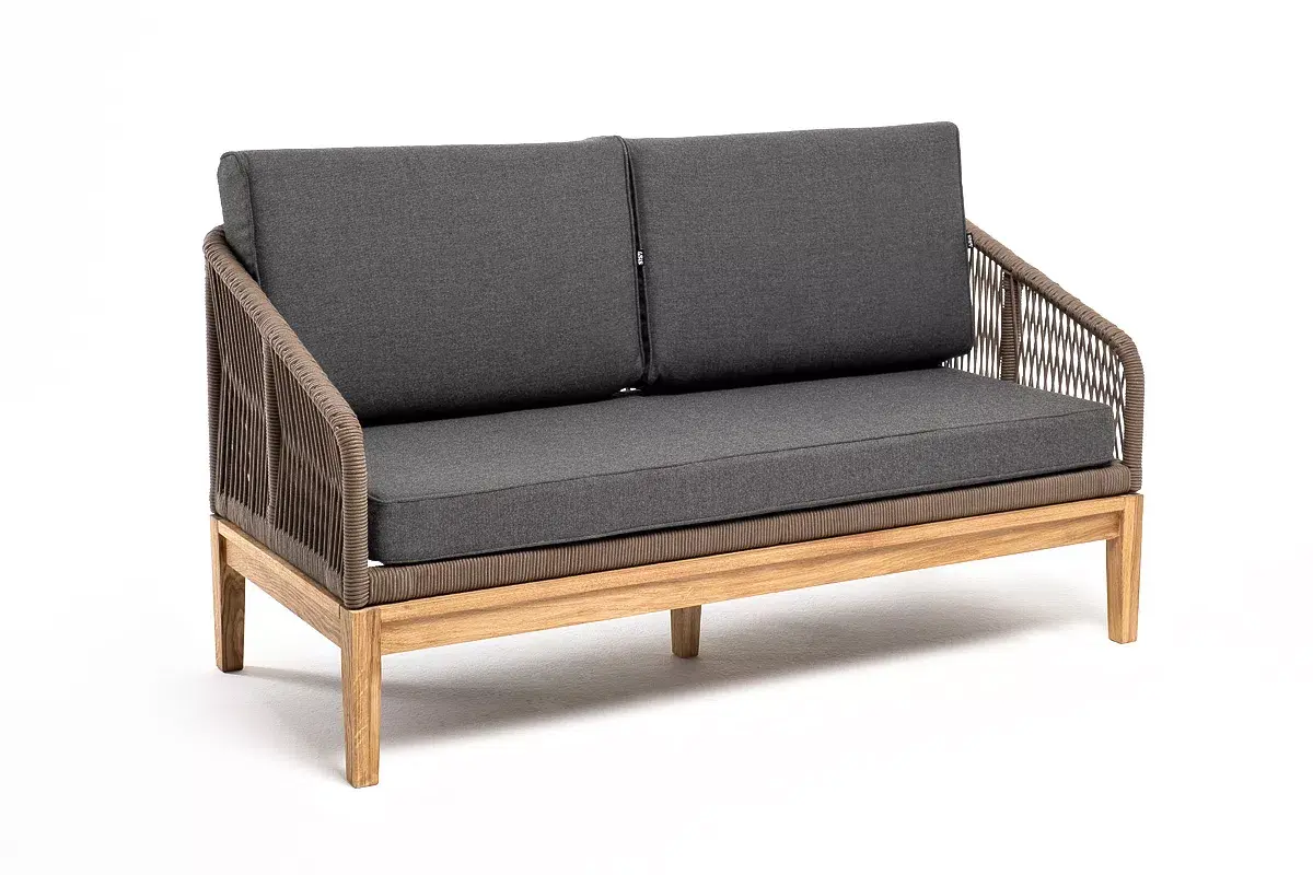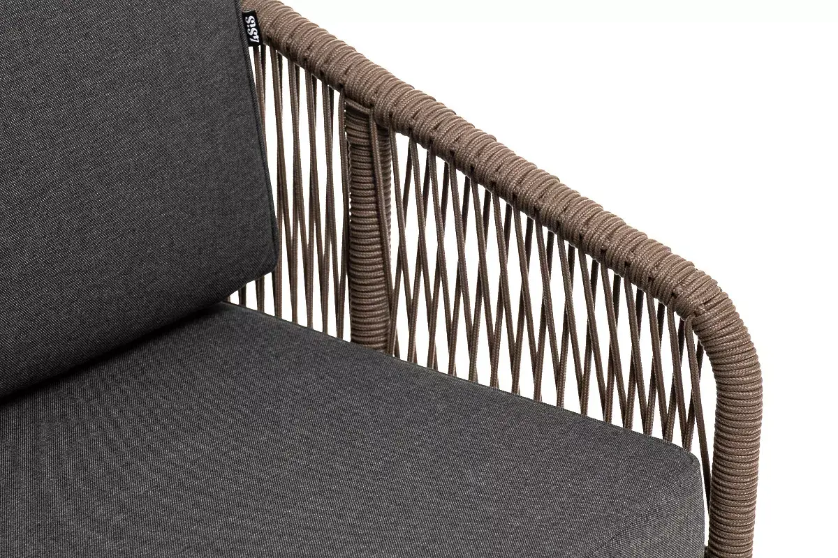 Боковины каркаса и спинка вручную оплетены роупом коричневого цвета. Это эластичные синтетические ленты, изготовленные из высокопрочных полиэфирных волокон. Основание дивана - натуральный дуб.