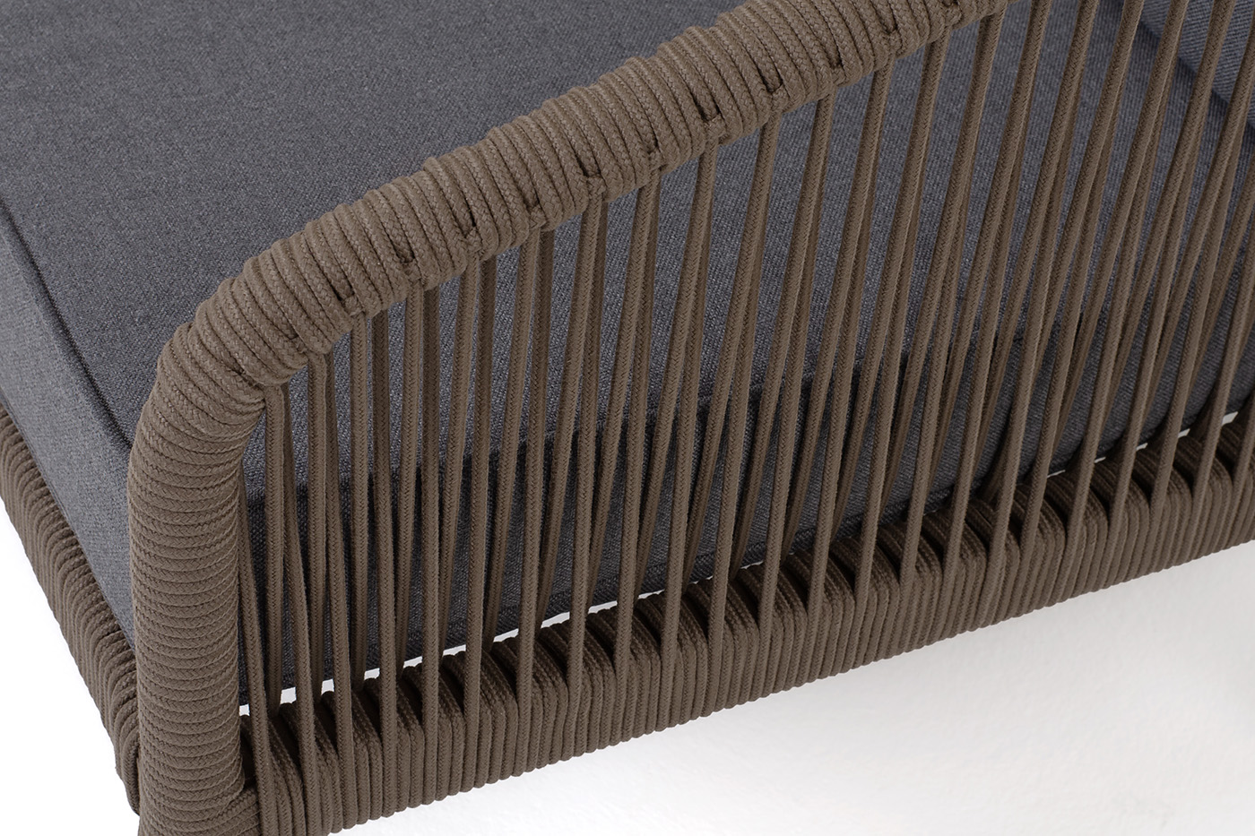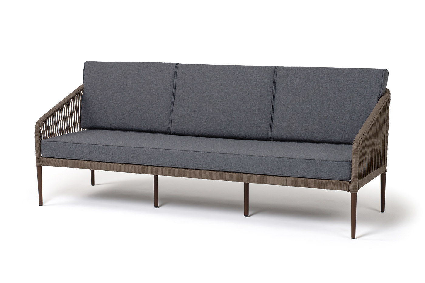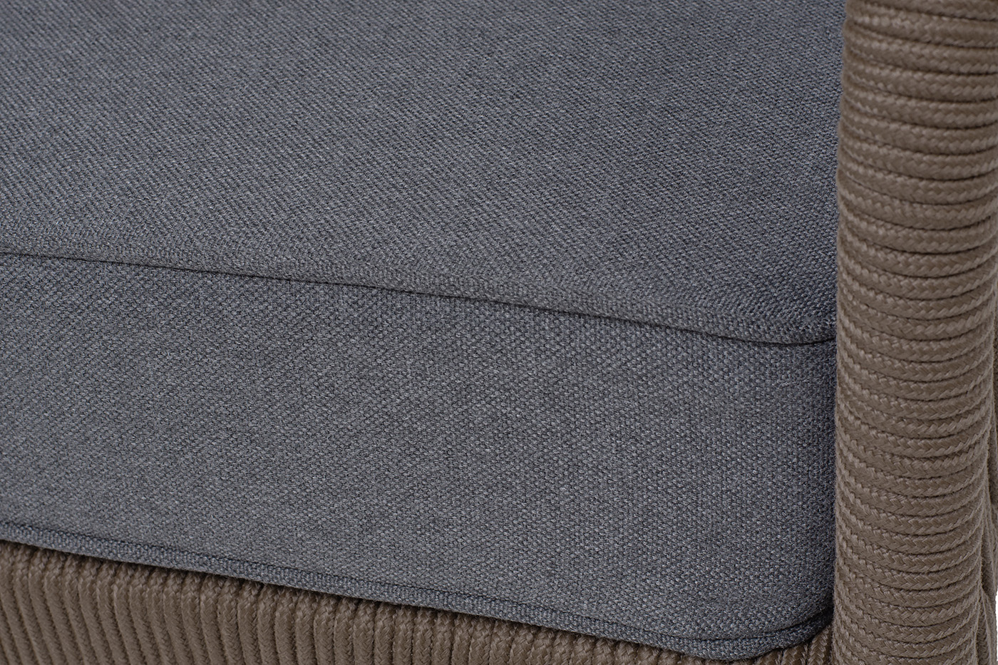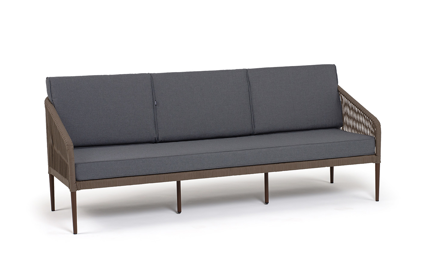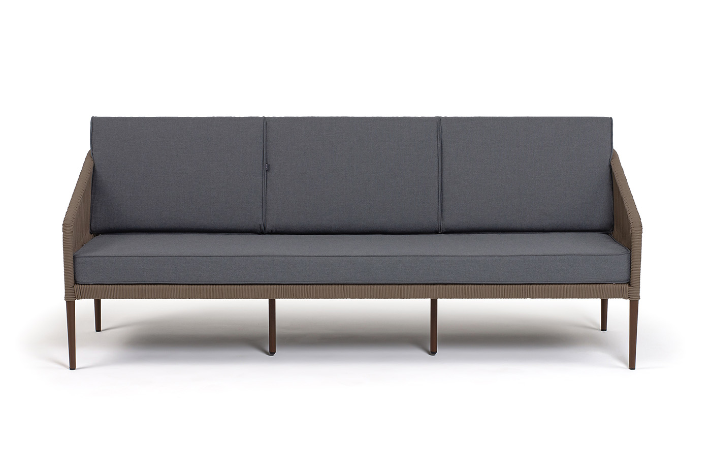 Диван имеет алюминиевый каркас, окрашенный порошковой краской в коричневый (RAL8016) цвет. Боковины каркаса и спинка вручную оплетены роупом - эластичными синтетическими лентами, изготовленными из высокопрочных полиэфирных волокон. Цвет оплетки в тон каркасу - коричневый.
