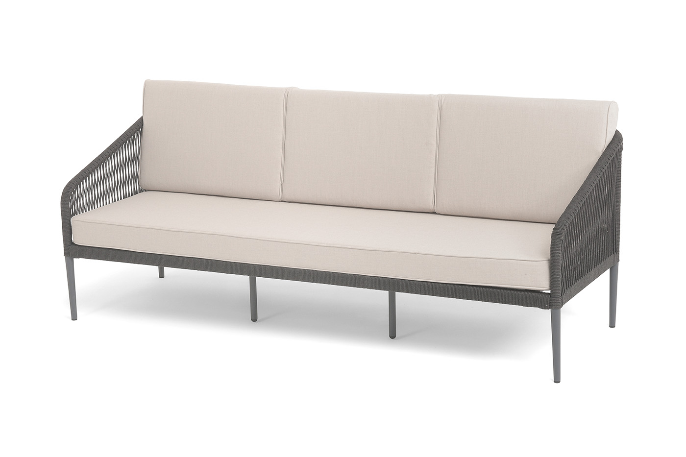 Диван имеет алюминиевый каркас, окрашенный порошковой краской в темно-серый (RAL7024) цвет. Боковины каркаса и спинка вручную оплетены роупом - эластичными синтетическими лентами, изготовленными из высокопрочных полиэфирных волокон. Цвет оплетки в тон каркасу - темно-серый.