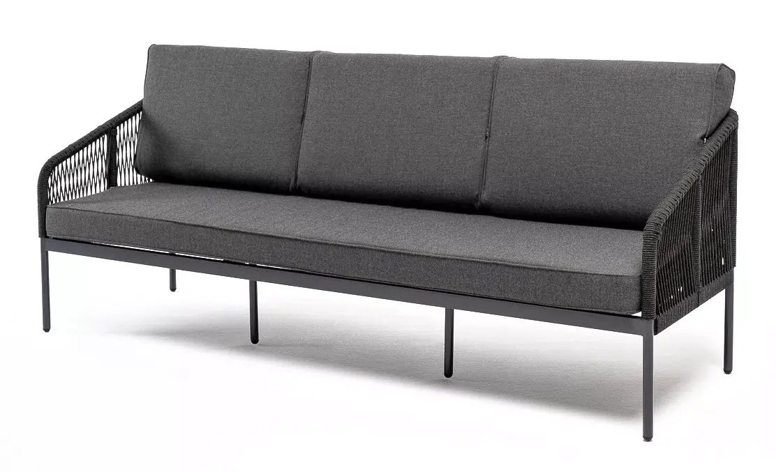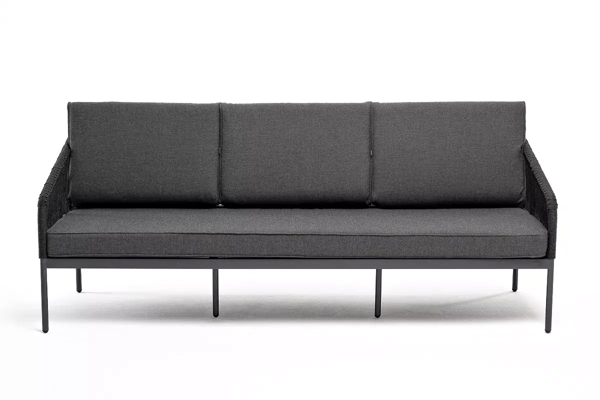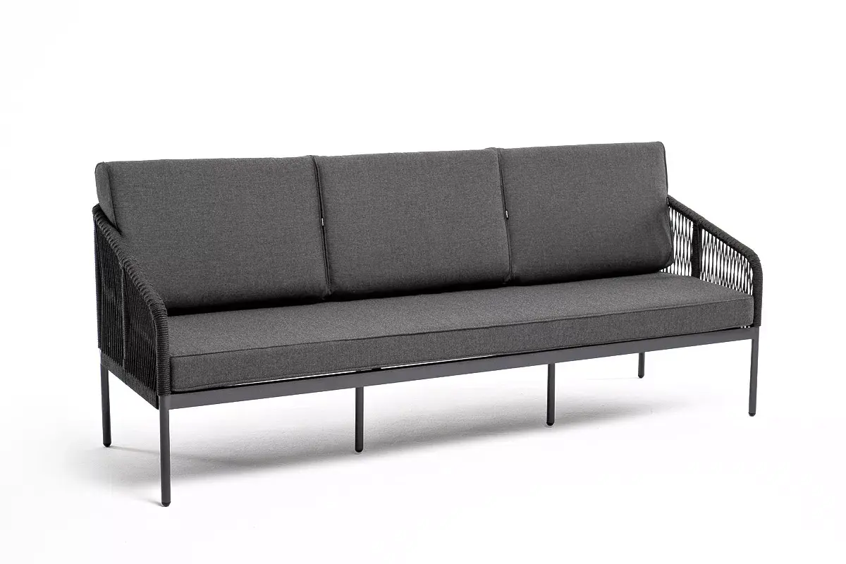 Диван имеет алюминиевый каркас, окрашенный порошковой краской в темно-серый (RAL7024) цвет. Боковины каркаса и спинка вручную оплетены роупом - эластичными синтетическими лентами, изготовленными из высокопрочных полиэфирных волокон. Цвет оплетки в тон каркасу - темно-серый.