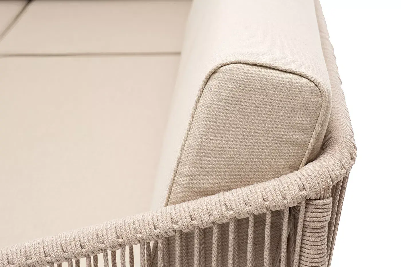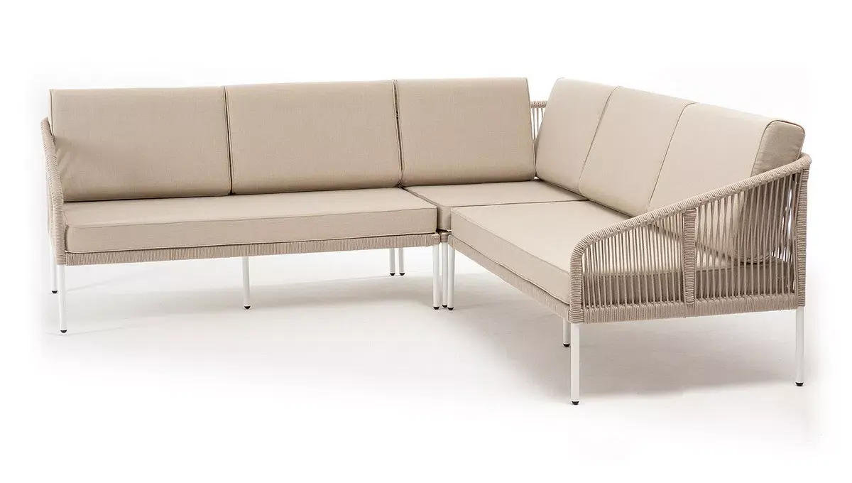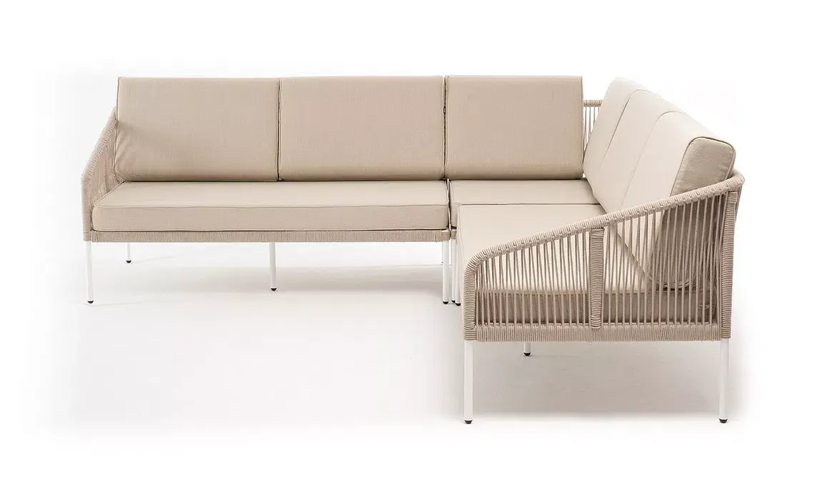 Диван имеет алюминиевый каркас, окрашенный порошковой краской в белый цвет. Боковины каркаса вручную оплетены роупом - эластичными синтетическими лентами, изготовленными из высокопрочных полиэфирных волокон. Цвет оплетки - бежевый.
