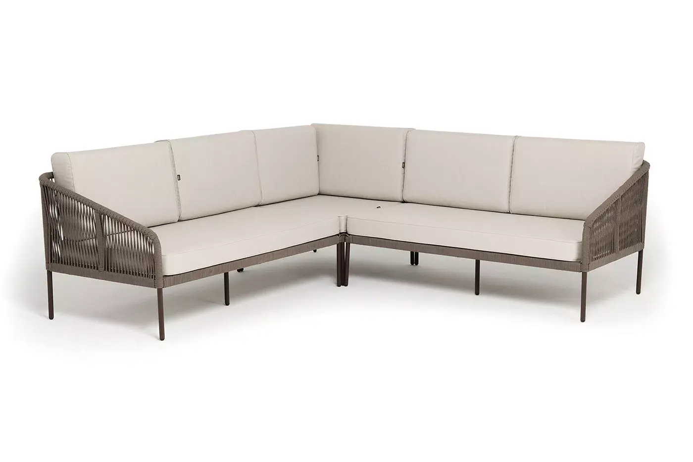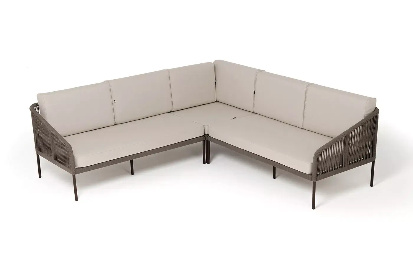 Диван имеет алюминиевый каркас, окрашенный порошковой краской в коричневый (RAL8016) цвет. Боковины каркаса вручную оплетены роупом - эластичными синтетическими лентами, изготовленными из высокопрочных полиэфирных волокон. Цвет оплетки - коричневый.