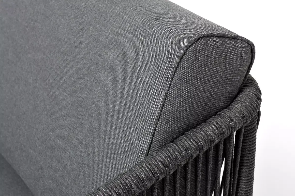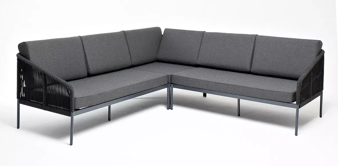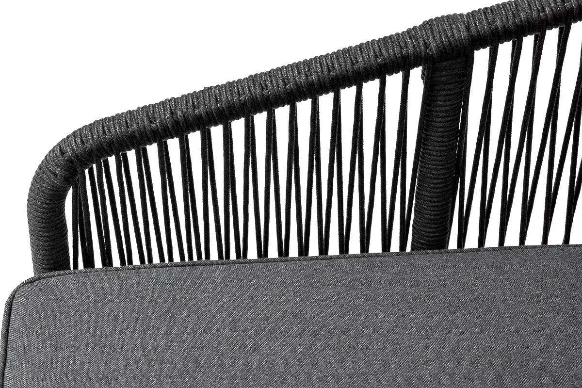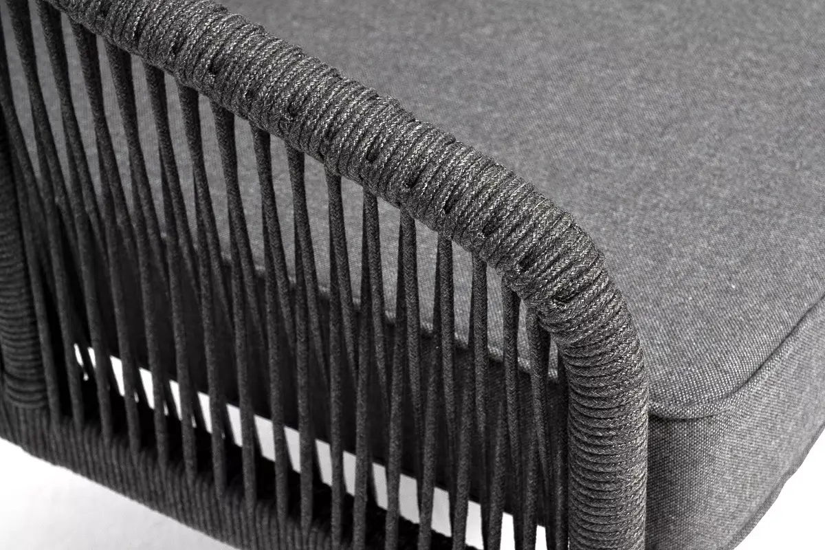Диван имеет алюминиевый каркас, окрашенный порошковой краской в темно-серый (RAL7024) цвет. Боковины каркаса вручную оплетены роупом - эластичными синтетическими лентами, изготовленными из высокопрочных полиэфирных волокон. Цвет оплетки - темно-серый.