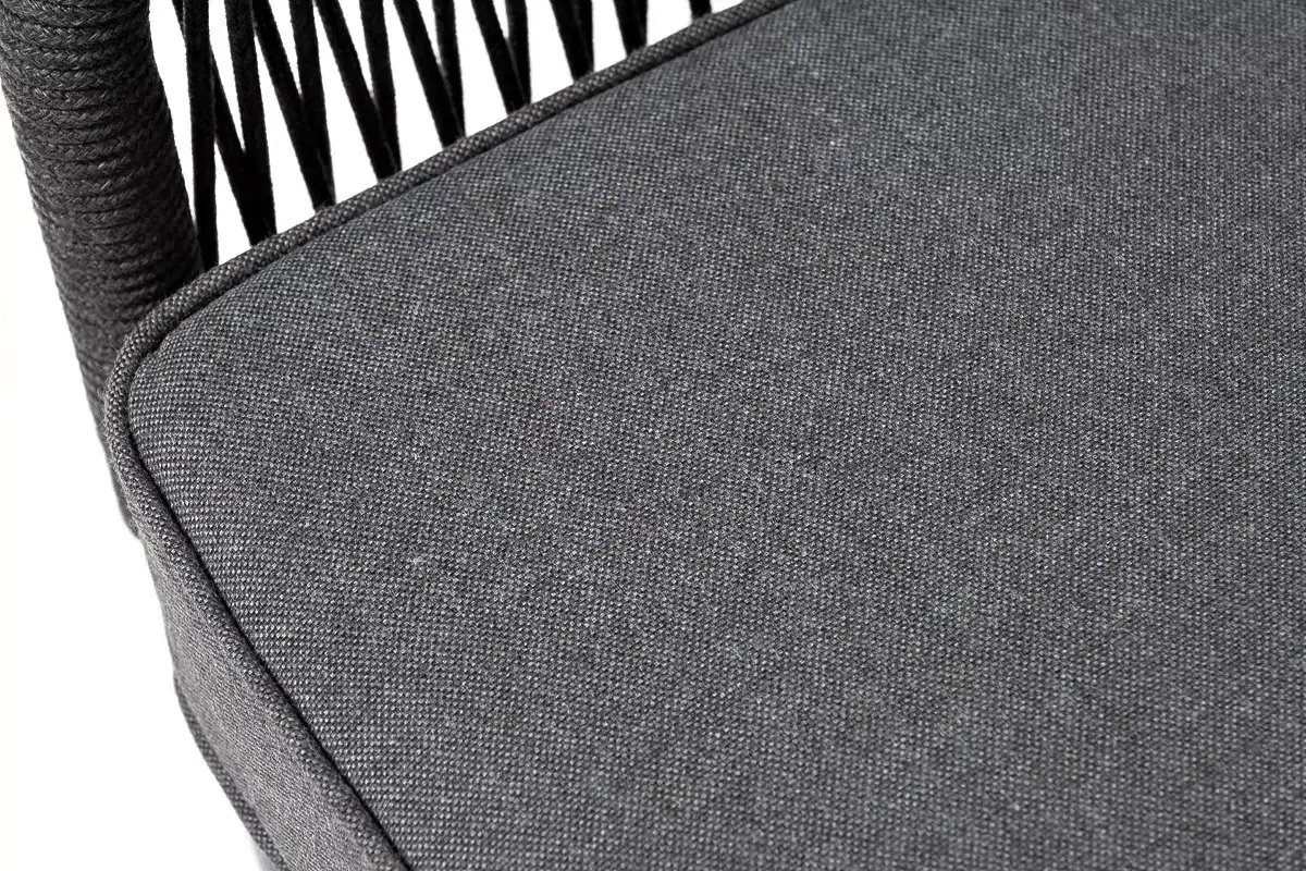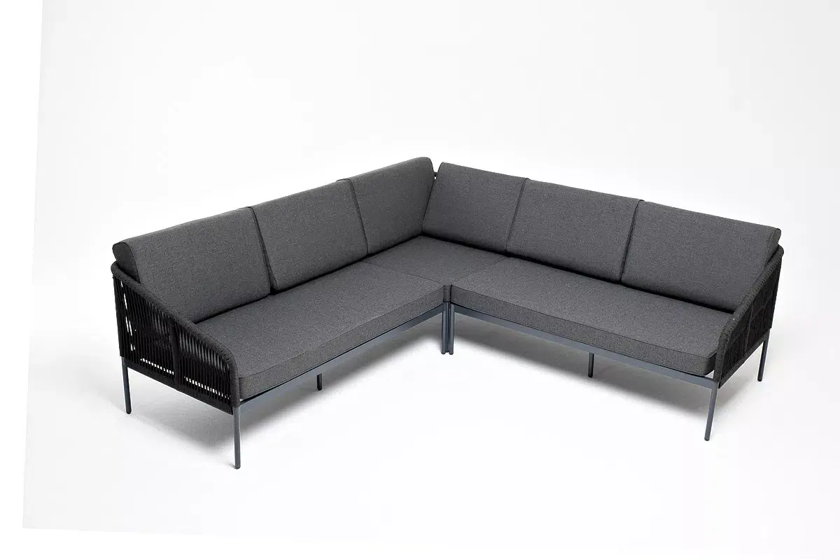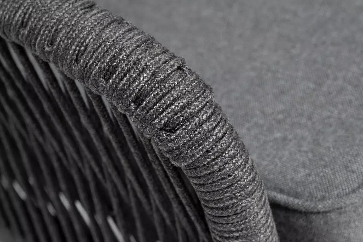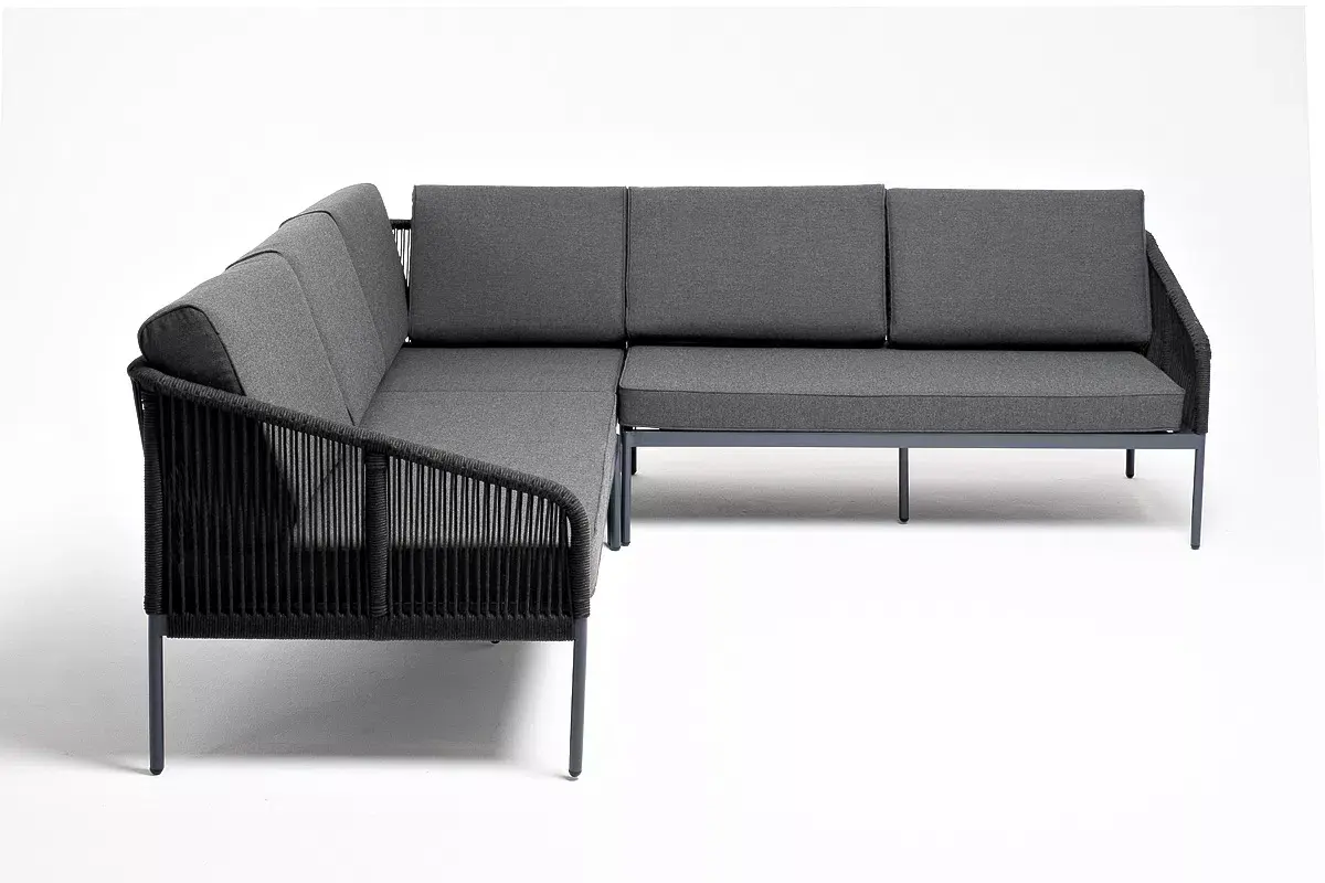 Диван имеет алюминиевый каркас, окрашенный порошковой краской в темно-серый (RAL7024) цвет. Боковины каркаса вручную оплетены роупом - эластичными синтетическими лентами, изготовленными из высокопрочных полиэфирных волокон. Цвет оплетки - темно-серый.