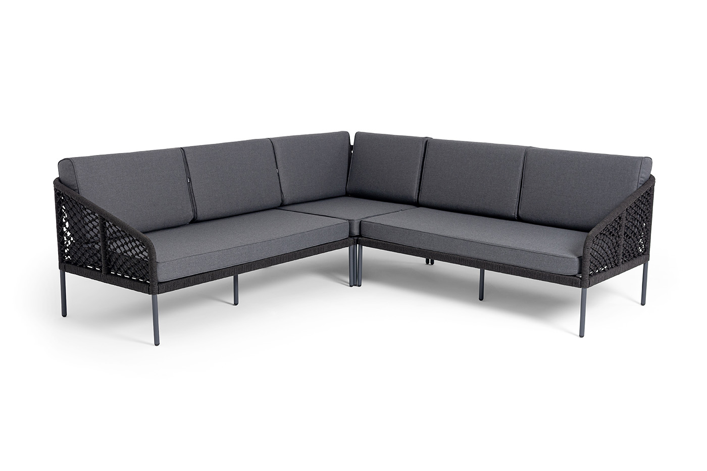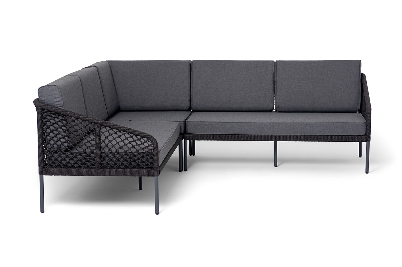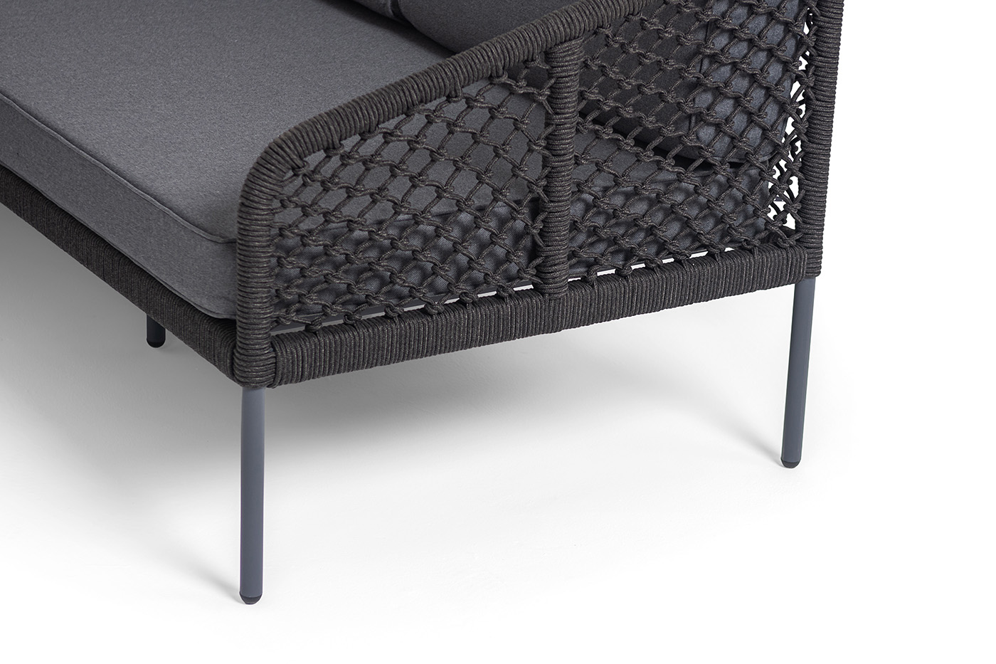 Прочная основа дивана — алюминиевый каркас, окрашенный порошковой краской в благородный тёмно‑серый цвет (RAL7024). Особую изюминку дизайну придают боковины, вручную оплетённые роупом — эластичными синтетическими лентами из высокопрочных полиэфирных волокон. Аккуратные узелки создают фактурный акцент, подчёркивающий авторскую эстетику модели.