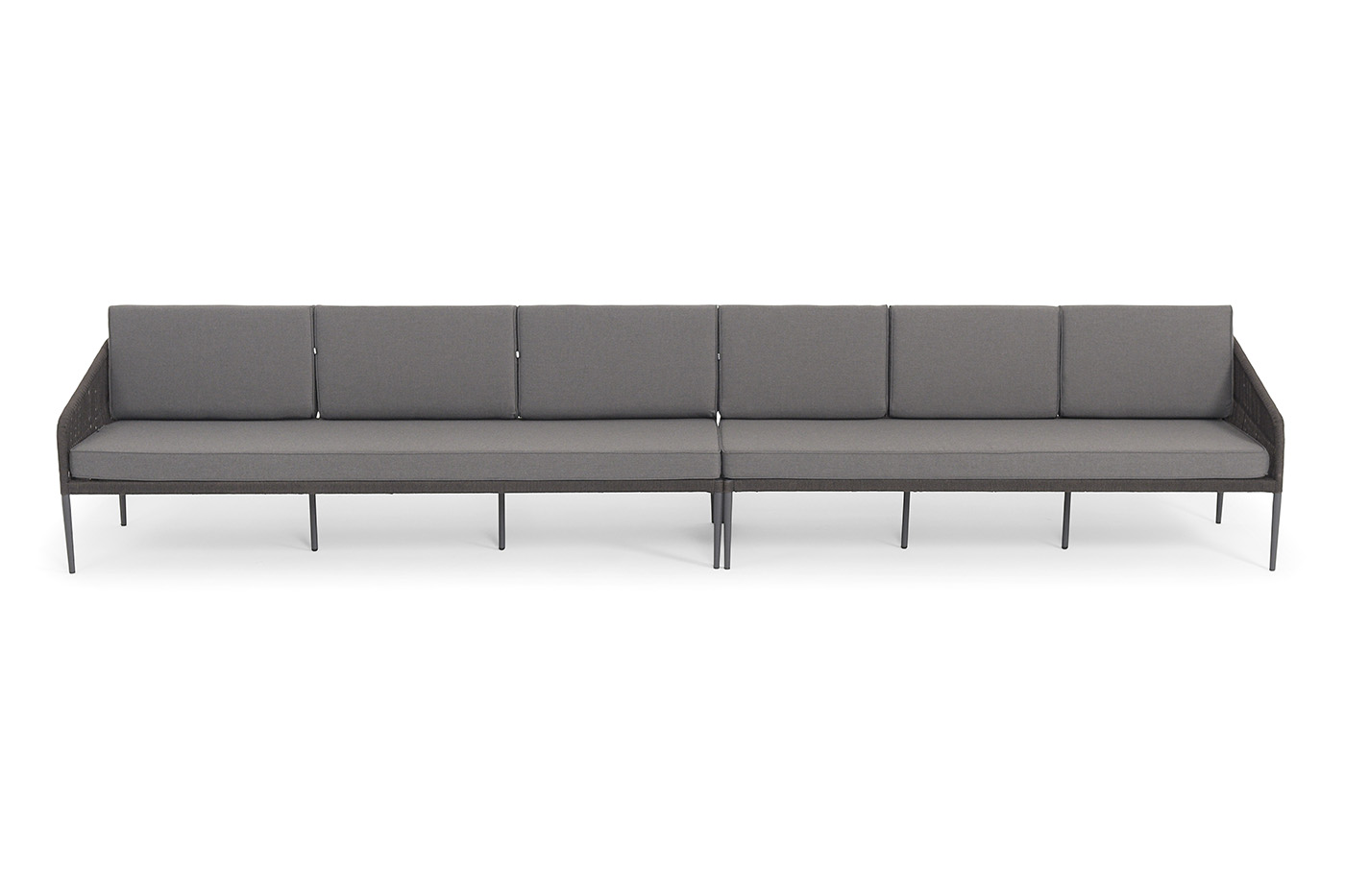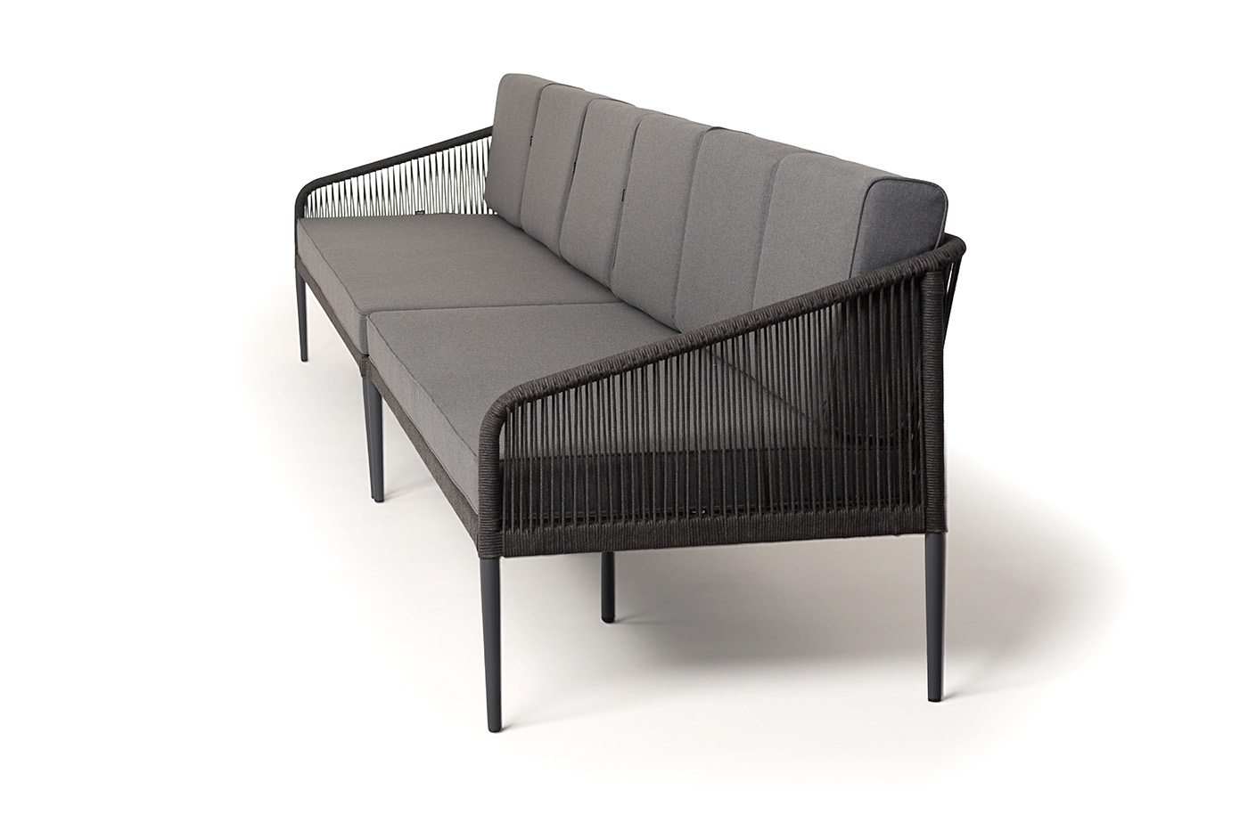 Диван имеет алюминиевый каркас, окрашенный порошковой краской в темно-серый (RAL7024) цвет. Боковины каркаса вручную оплетены роупом - эластичными синтетическими лентами, изготовленными из высокопрочных полиэфирных волокон. Цвет оплетки - темно-серый.