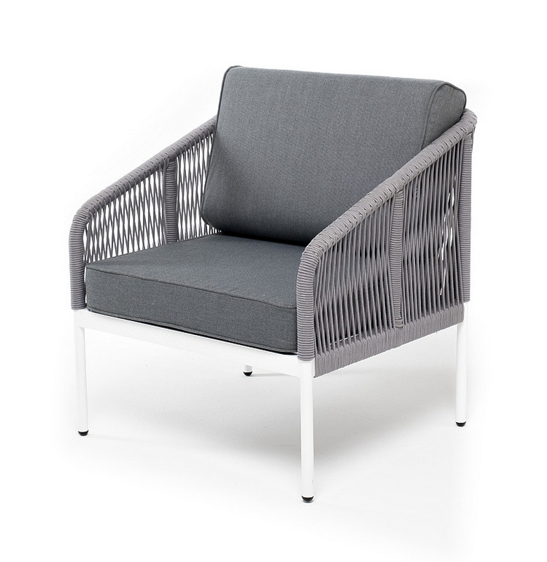 Каркас кресла изготовлен из прочного алюминиевого сплава и окрашен в серый (RAL7022) цвет, который предотвращает возникновение коррозии и обеспечивает долгий срок службы. На боковинах кресла выполнена оплетка из роупа серого оттенка. Такое плетение обладает высокой стойкостью к износу и долговечностью, сохраняя свои свойства даже при активном использовании.