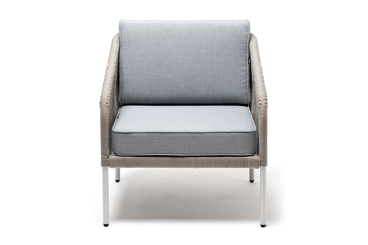 Это кресло обладает каркасом, выполненным из алюминия и окрашенным в светло-серый цвет с использованием порошковой краски. Это дает креслу надежность и обеспечивает его долгий срок службы. Изюминкой является фактура каркаса, напоминающая текстуру муар, что придает ему оригинальность и выделяет его среди другой мебели.