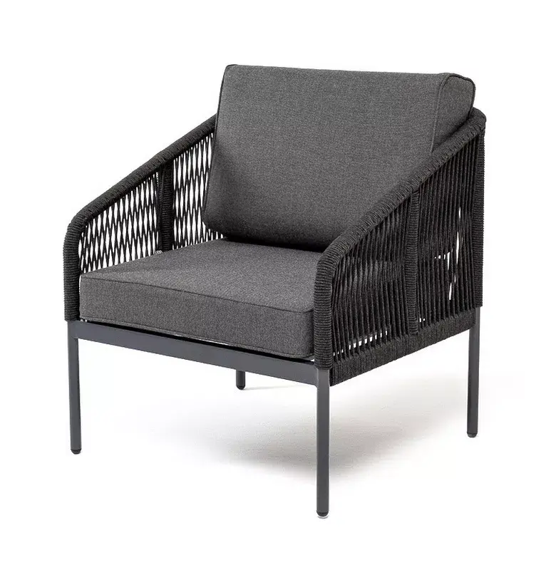 Плетеное кресло «Канны» идеально подходит для комфортного отдыха в саду или на балконе. Прочный каркас из алюминия окрашен в насыщенный темно-серый (RAL7024) цвет порошковой износостойкой краской.