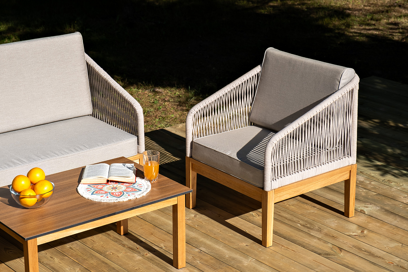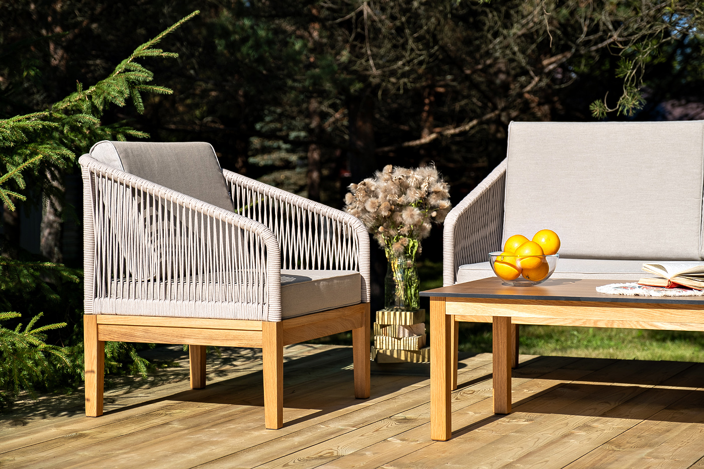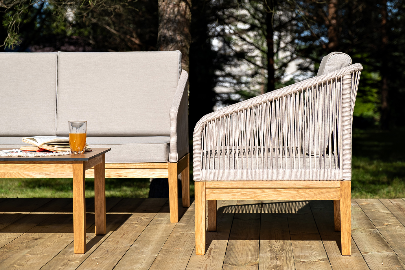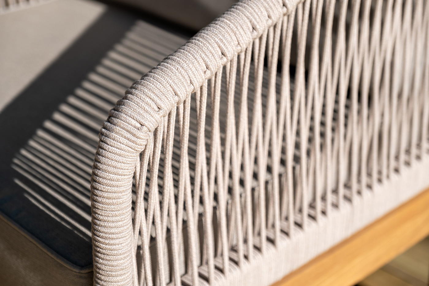 На боковинах - оплетка из синтетических лент, выполненных из полиэфирных волокон высокой прочности. Цвет плетения - бежевый. Основание - дуб.