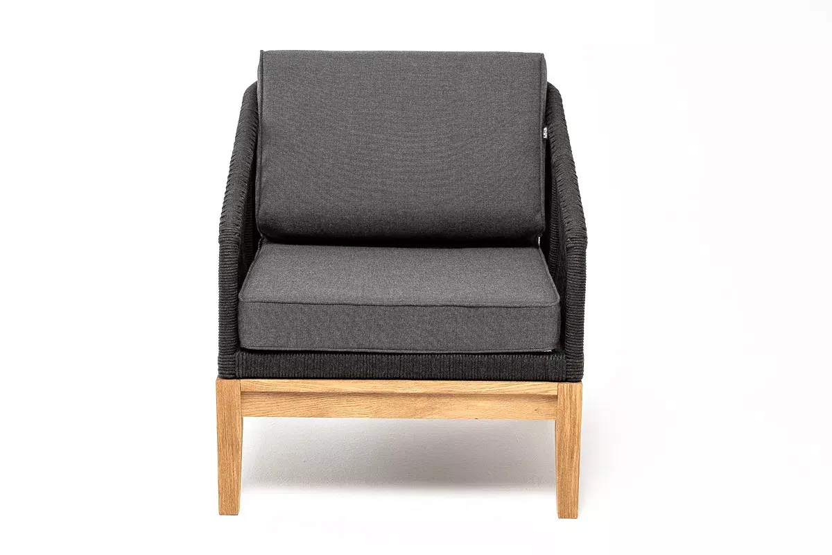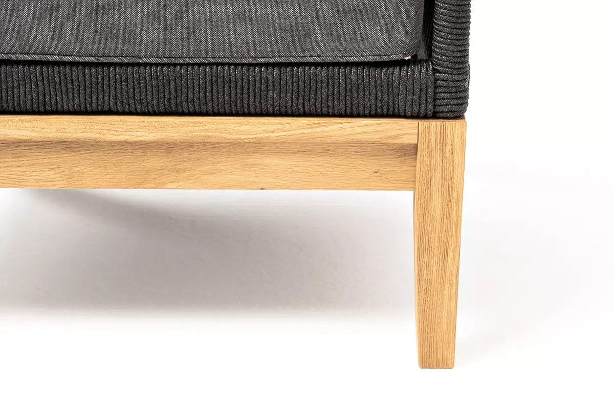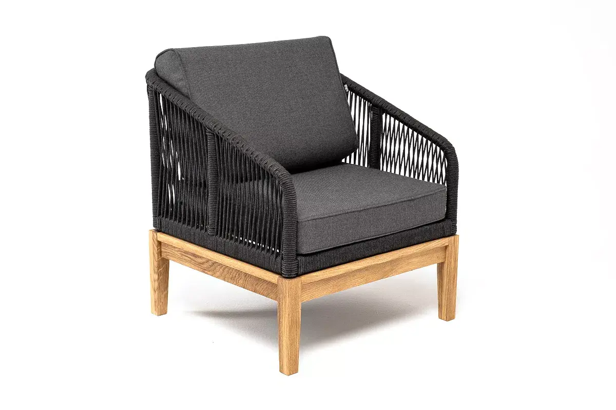 Каркас кресла оплетен синтетическими лентами, выполненных из полиэфирных волокон высокой прочности (роуп). Цвет плетения - темно-серый. Основание - натуральный дуб.