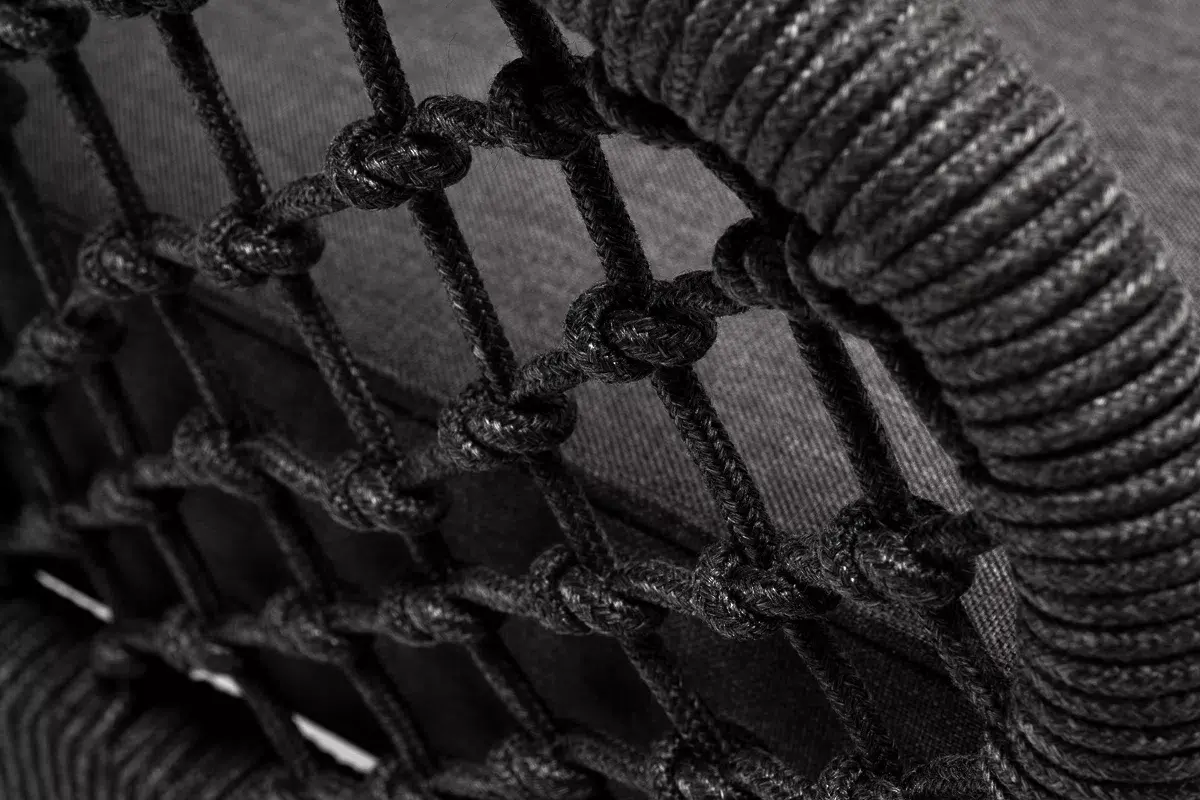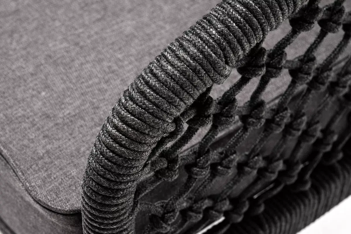 На боковинах - оплетка из синтетических лент, выполненных из полиэфирных волокон высокой прочности. Цвет плетения - темно-серый (RAL7024). Вид плетения - узелковый, создавался вручную.