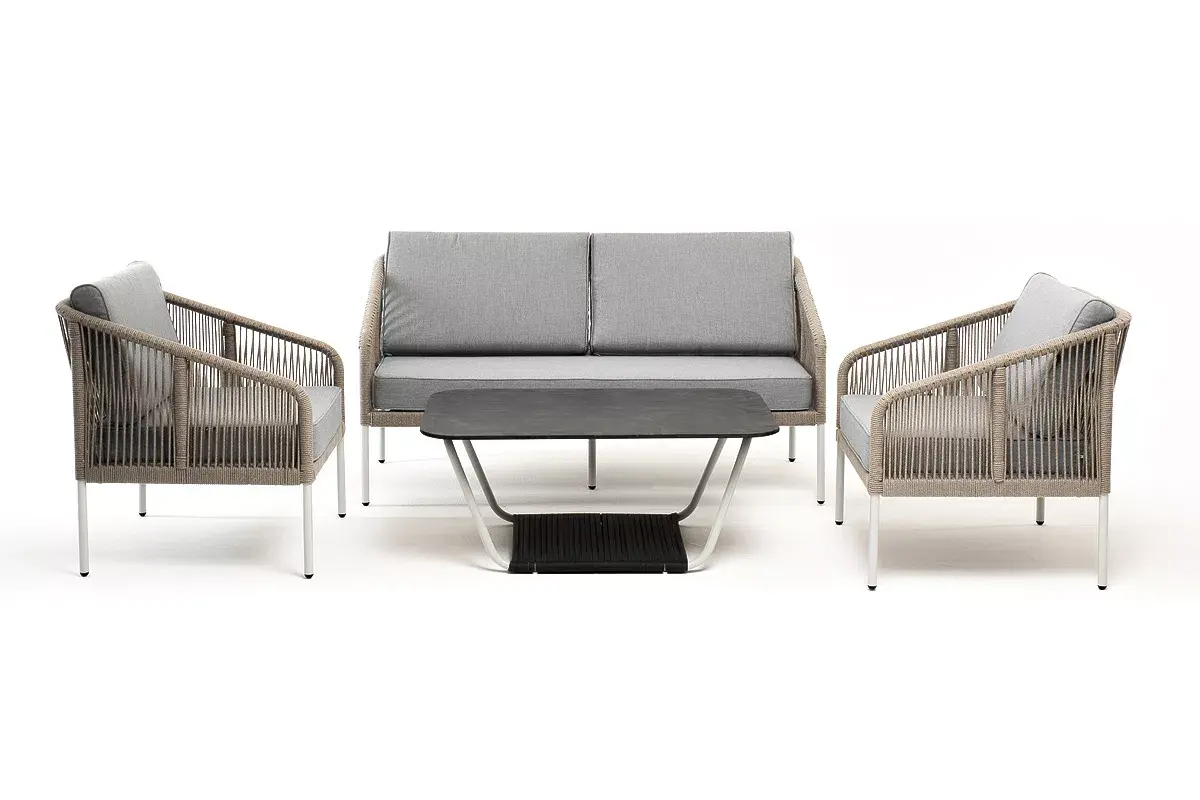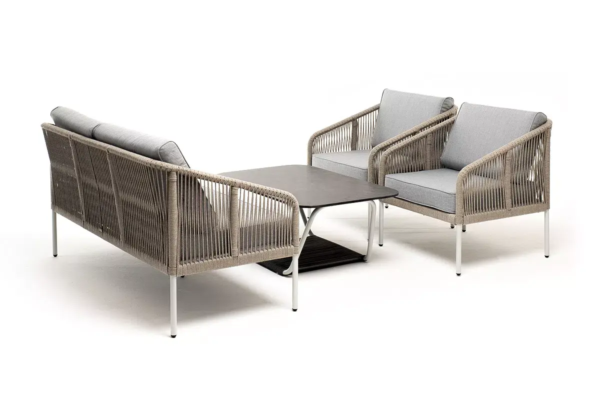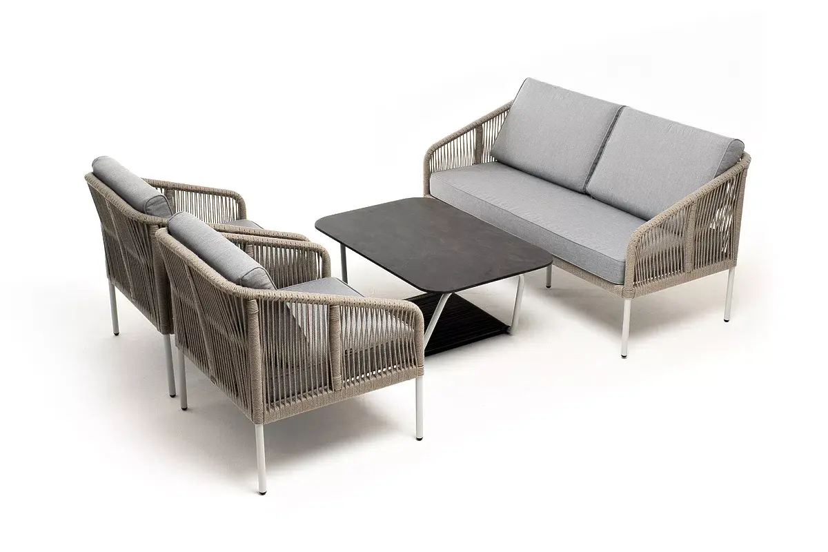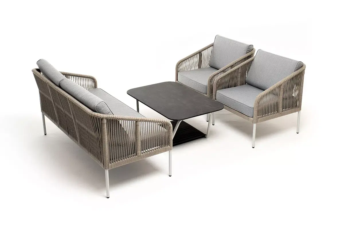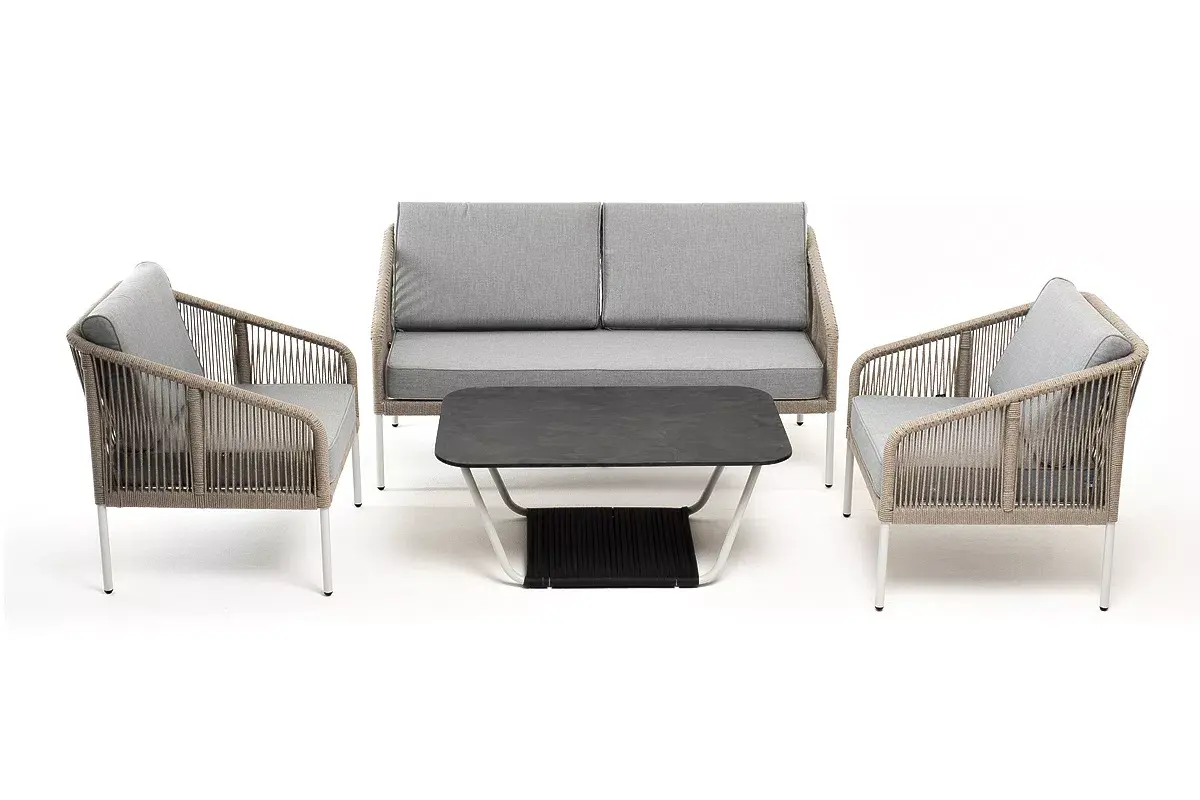 Каркас уличной мебели выполнен из алюминия. Его дополняет оплетка цвета серый меланж, изготовленная на основе эластичных синтетических лент из полиэфирных волокон высокой прочности.
