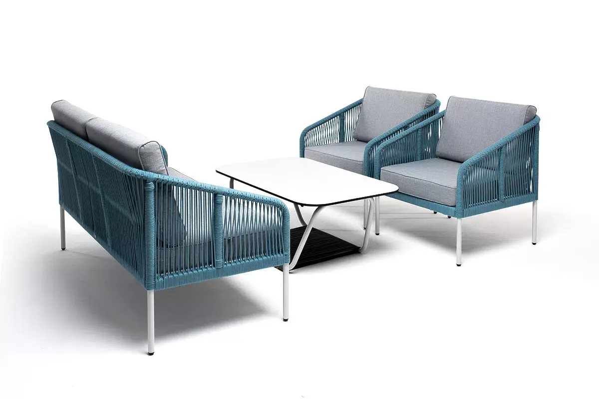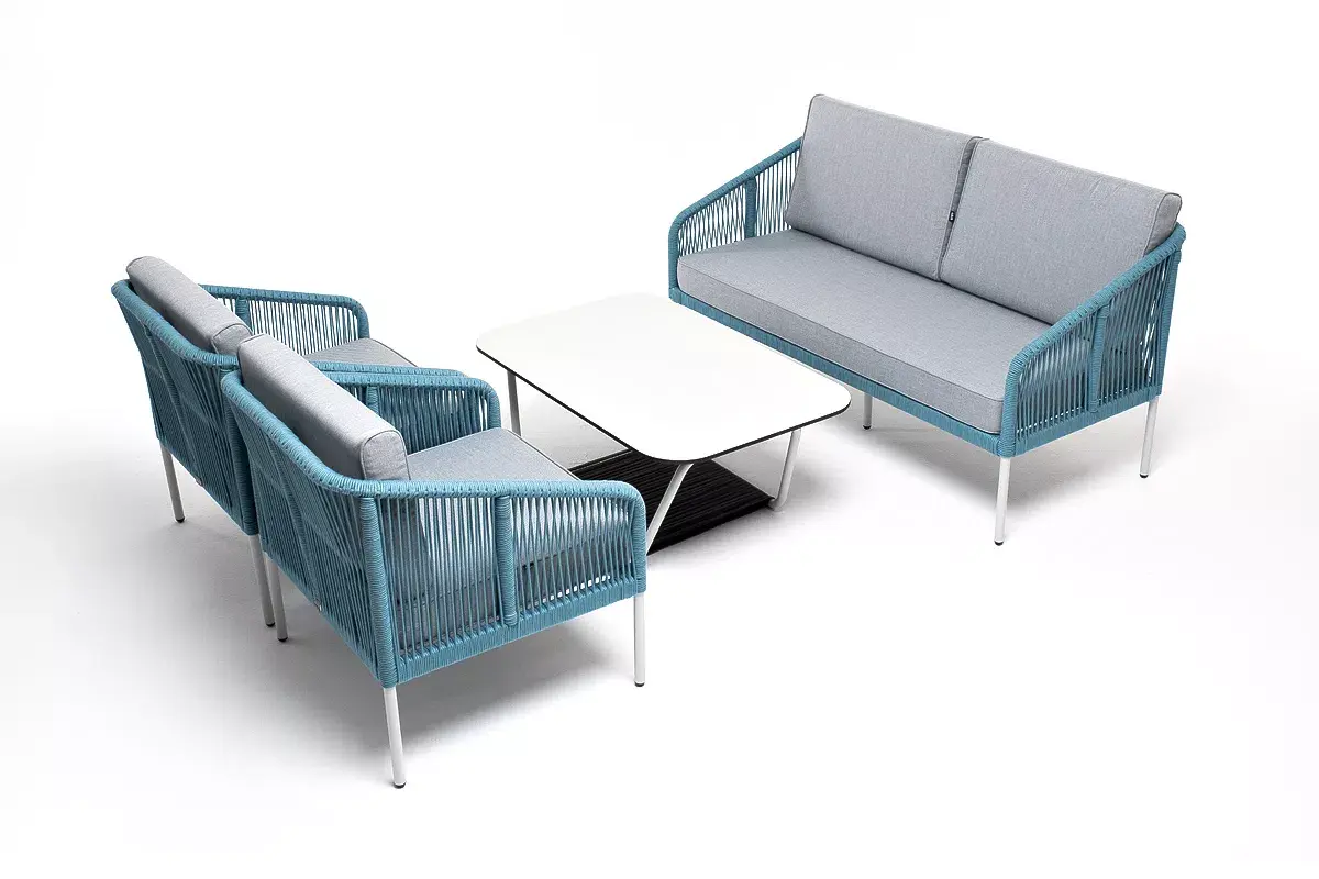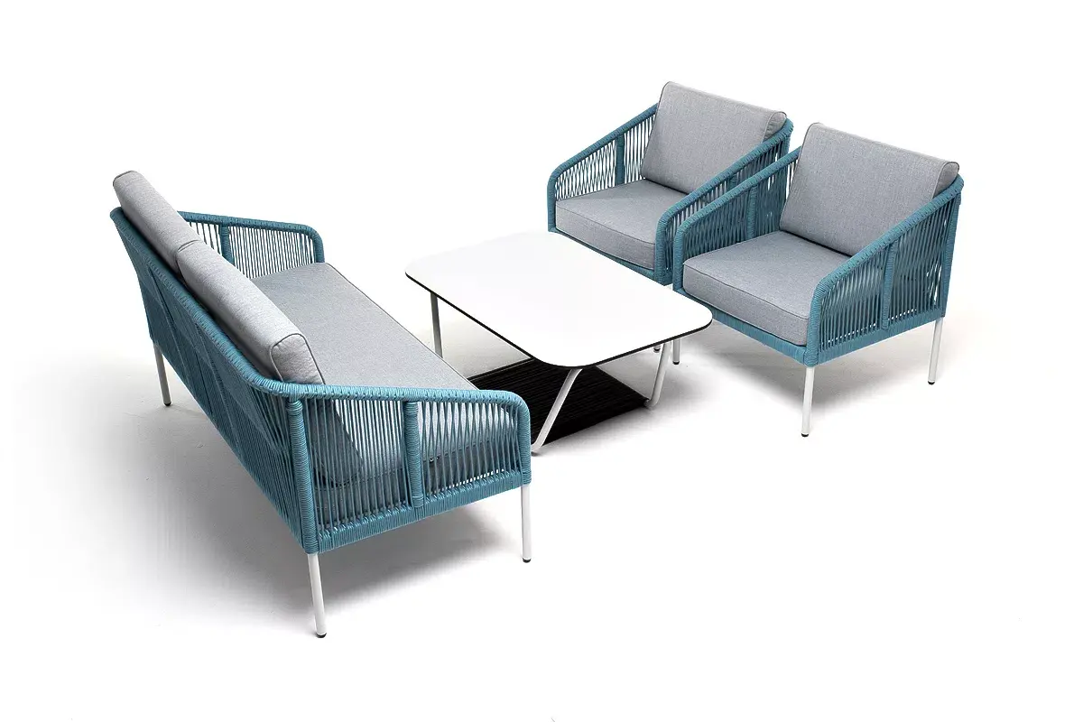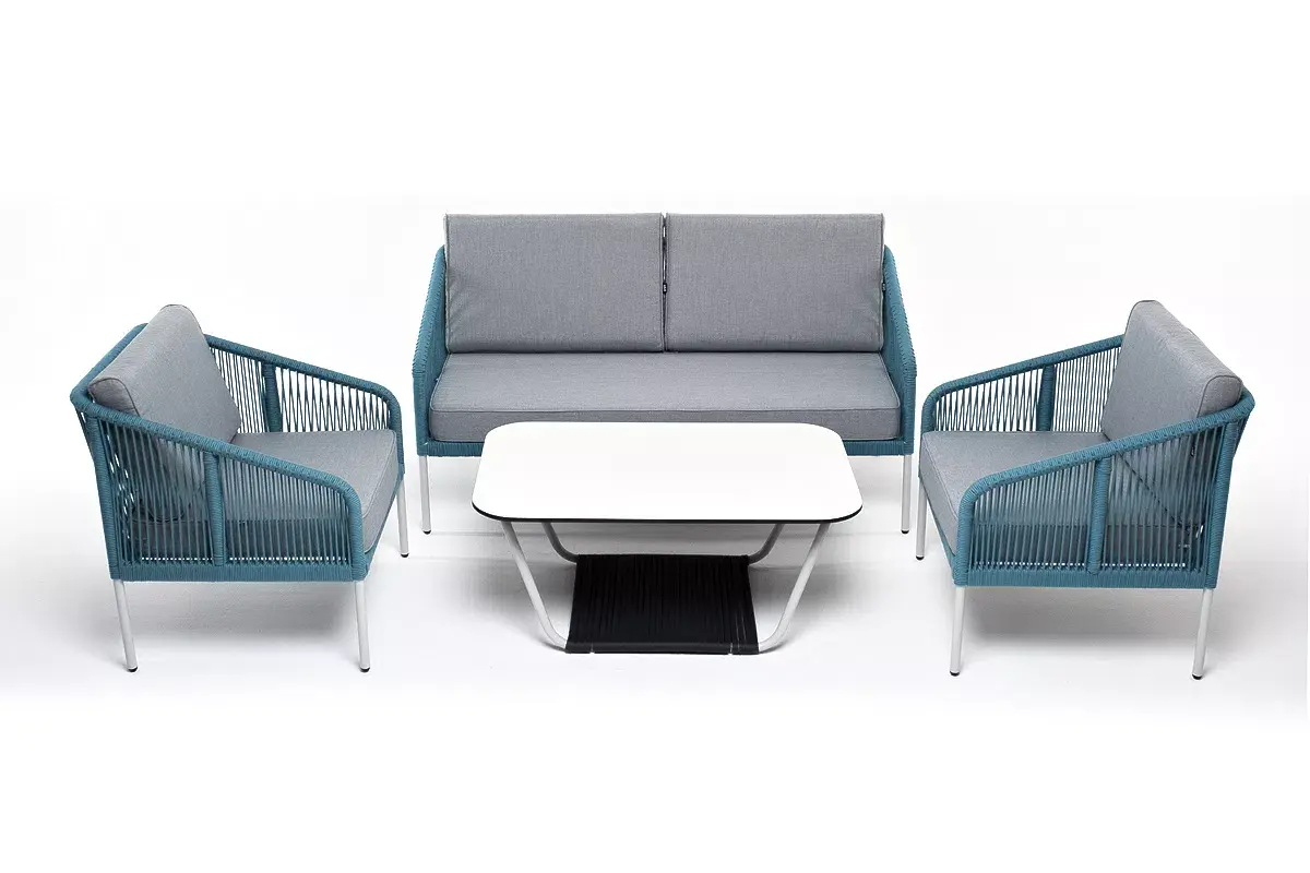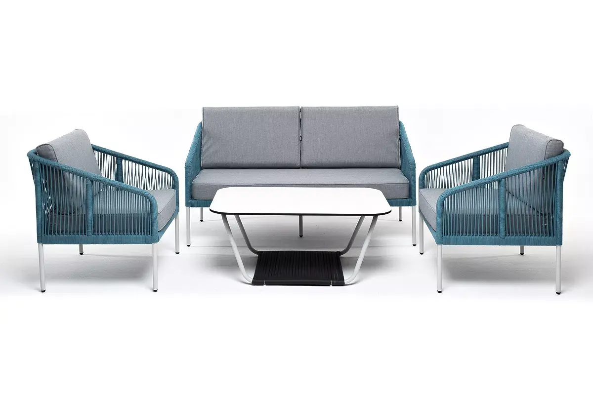 Каркас уличной мебели выполнен из алюминия. Его дополняет бирюзовая оплетка, изготовленная на основе эластичных синтетических лент из полиэфирных волокон высокой прочности.