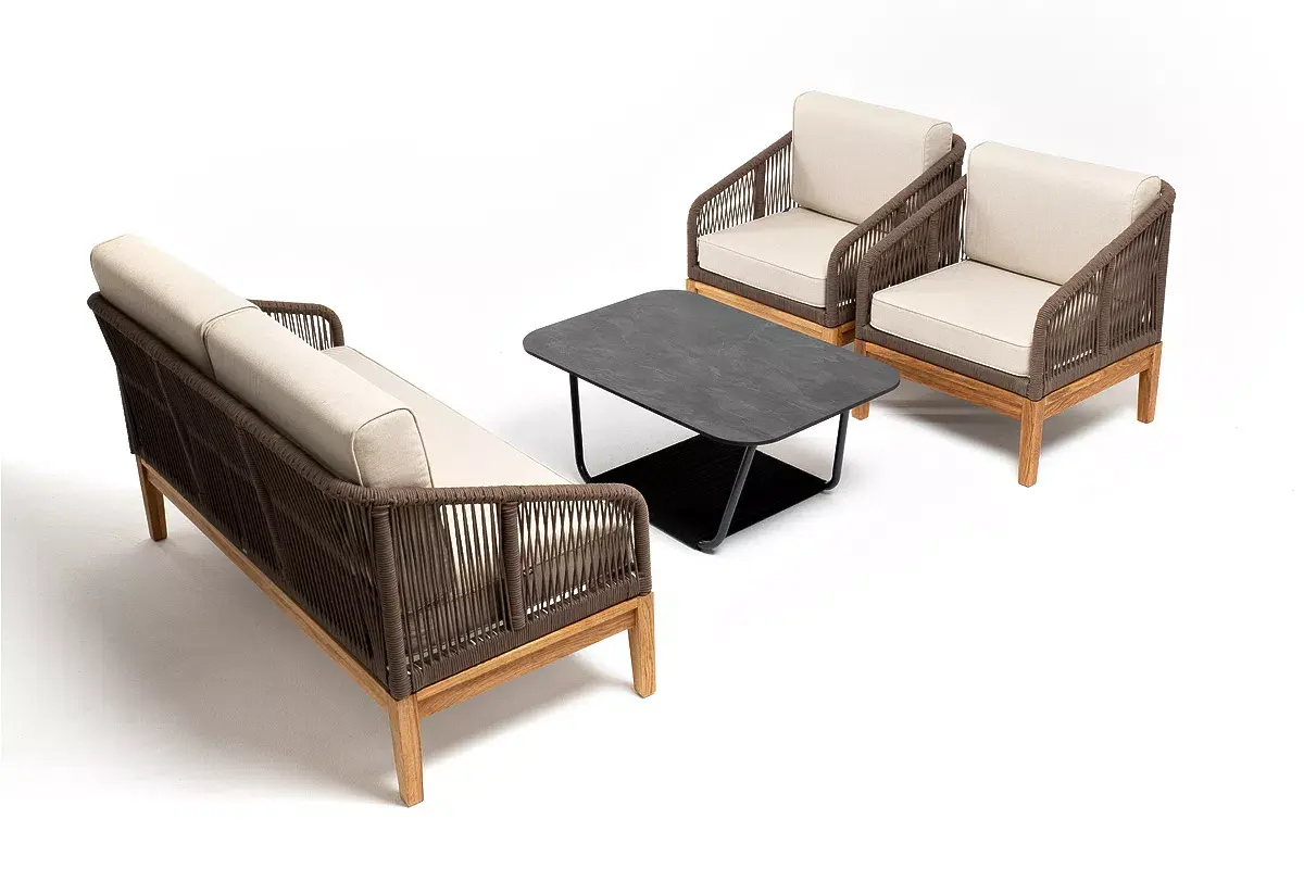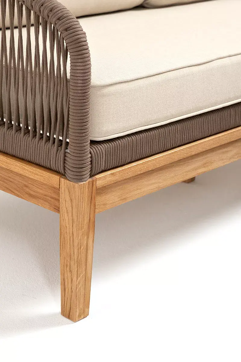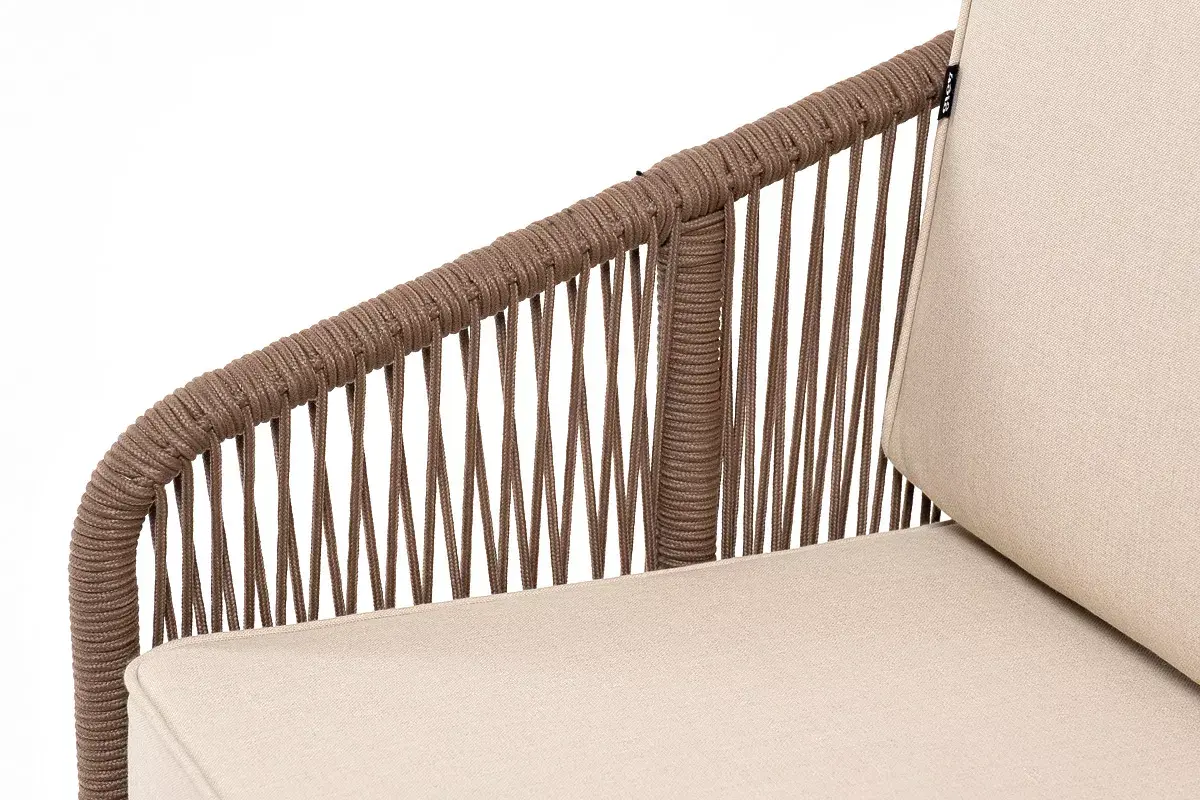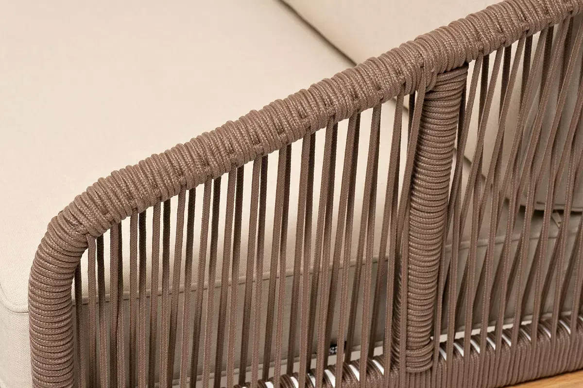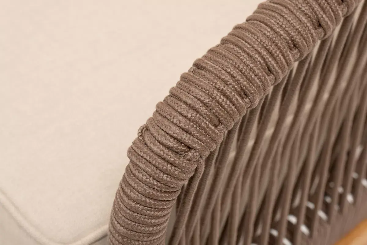 Каркас уличной мебели выполнен из дуба. Его дополняет коричневая оплетка, изготовленная на основе эластичных синтетических лент из полиэфирных волокон высокой прочности.