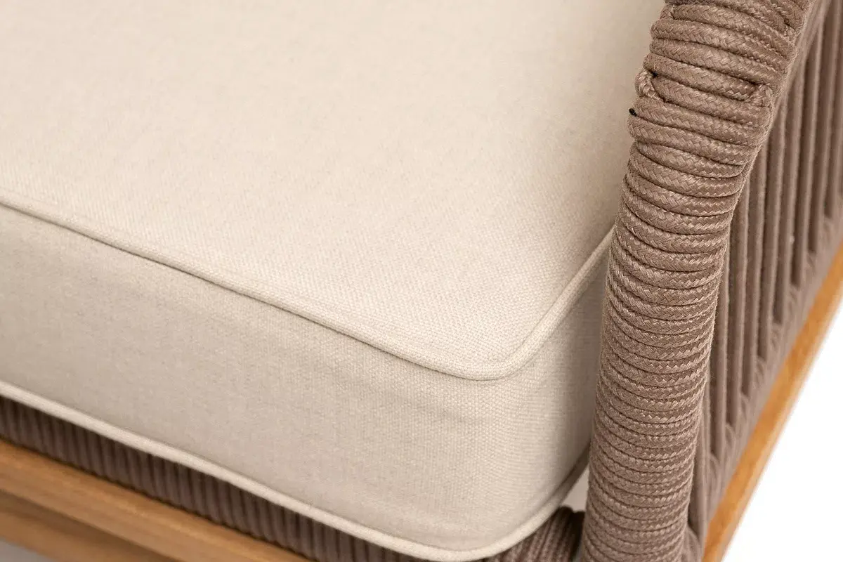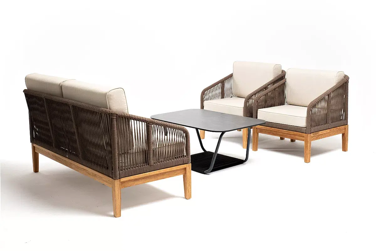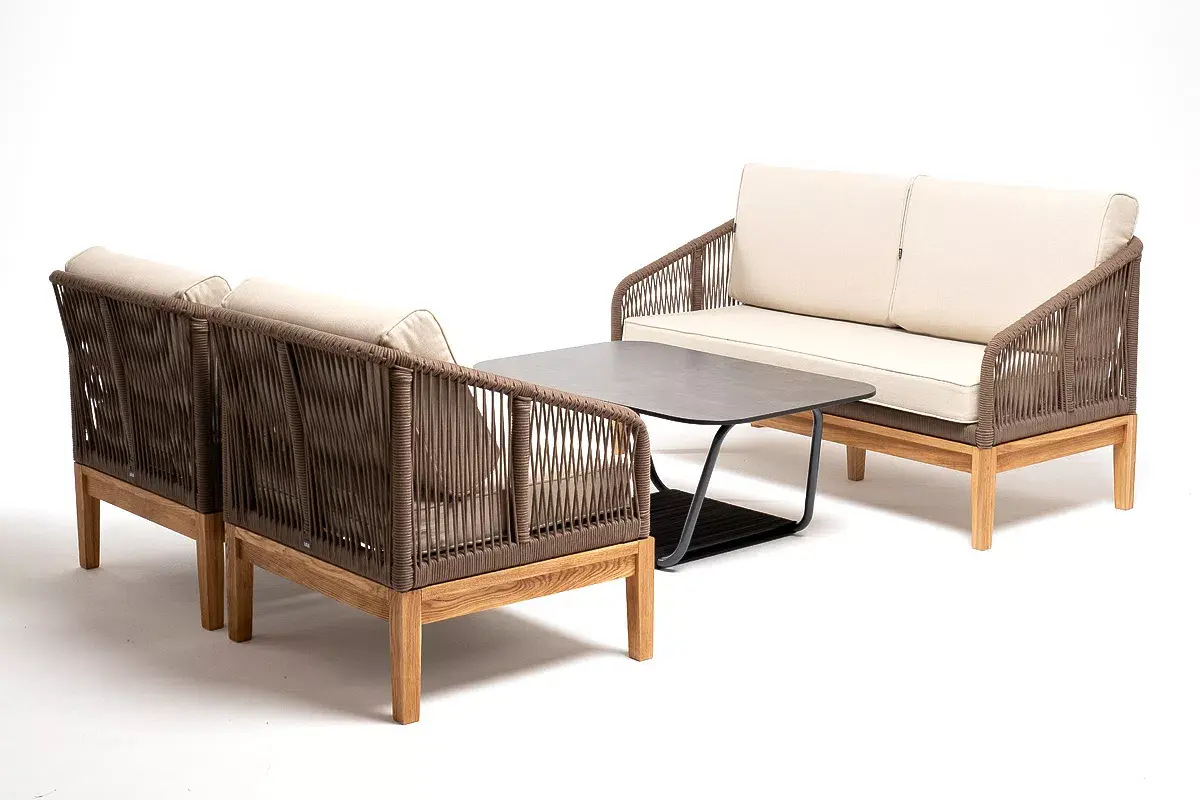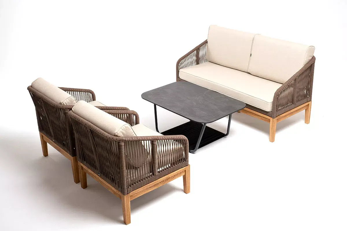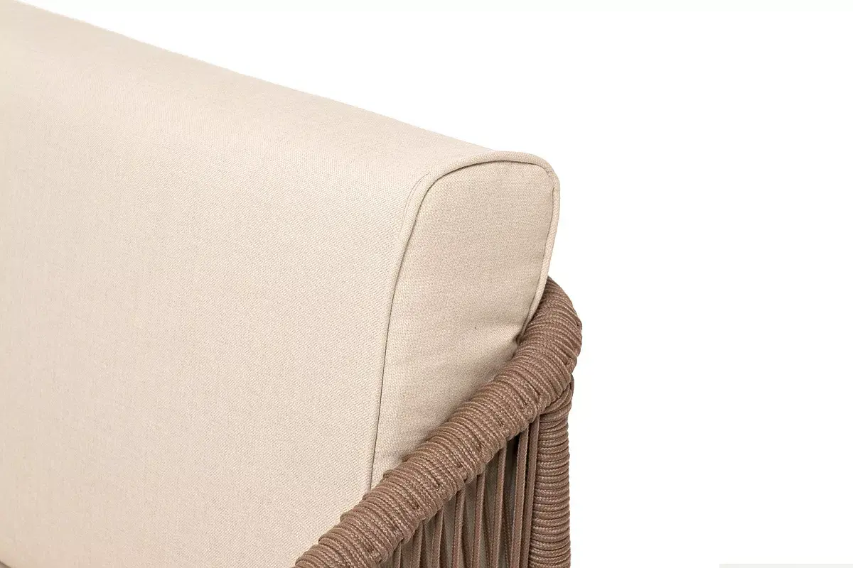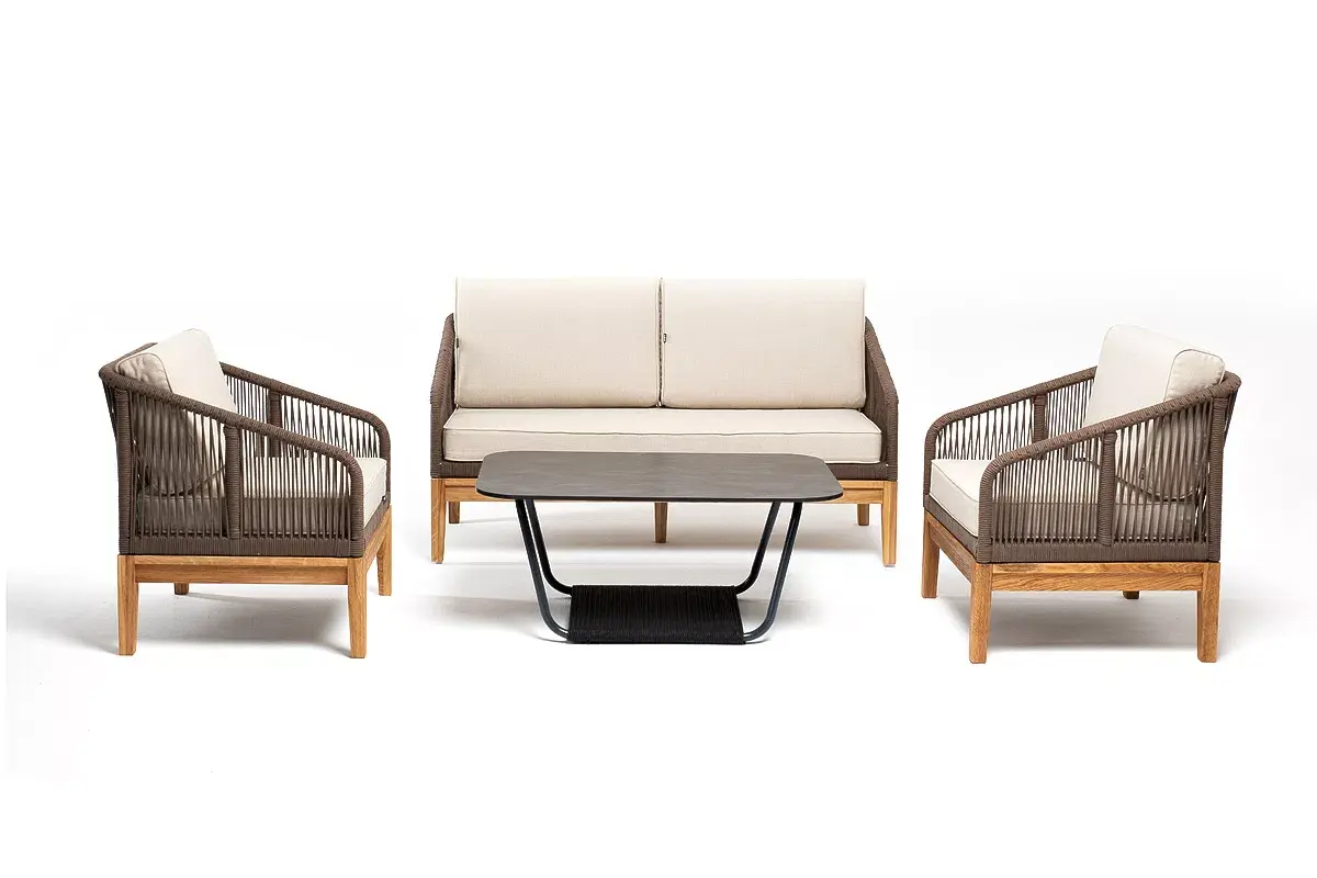 Каркас уличной мебели выполнен из дуба. Его дополняет коричневая оплетка, изготовленная на основе эластичных синтетических лент из полиэфирных волокон высокой прочности.