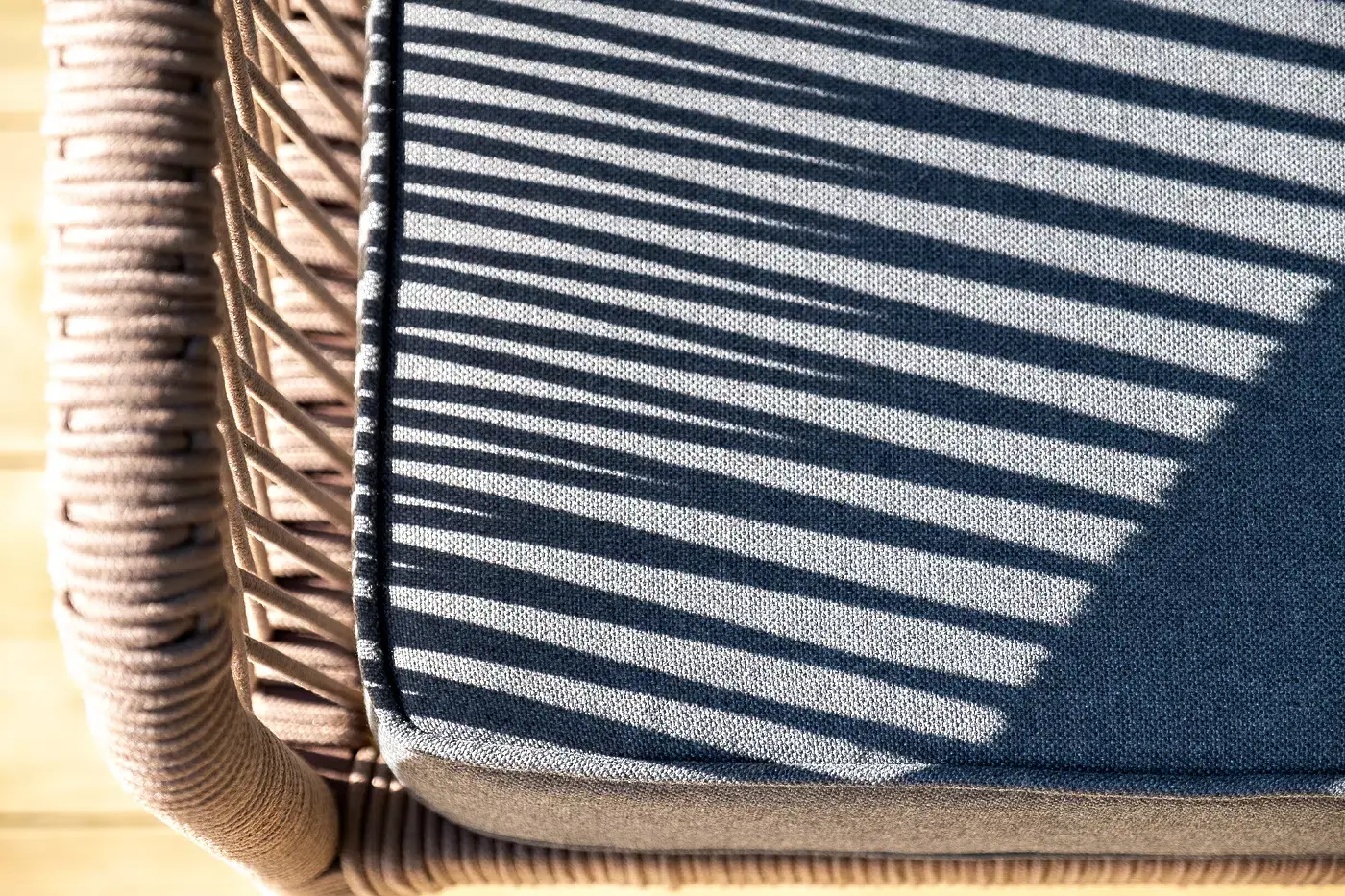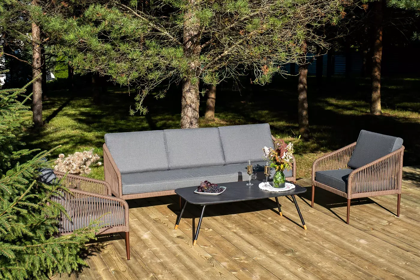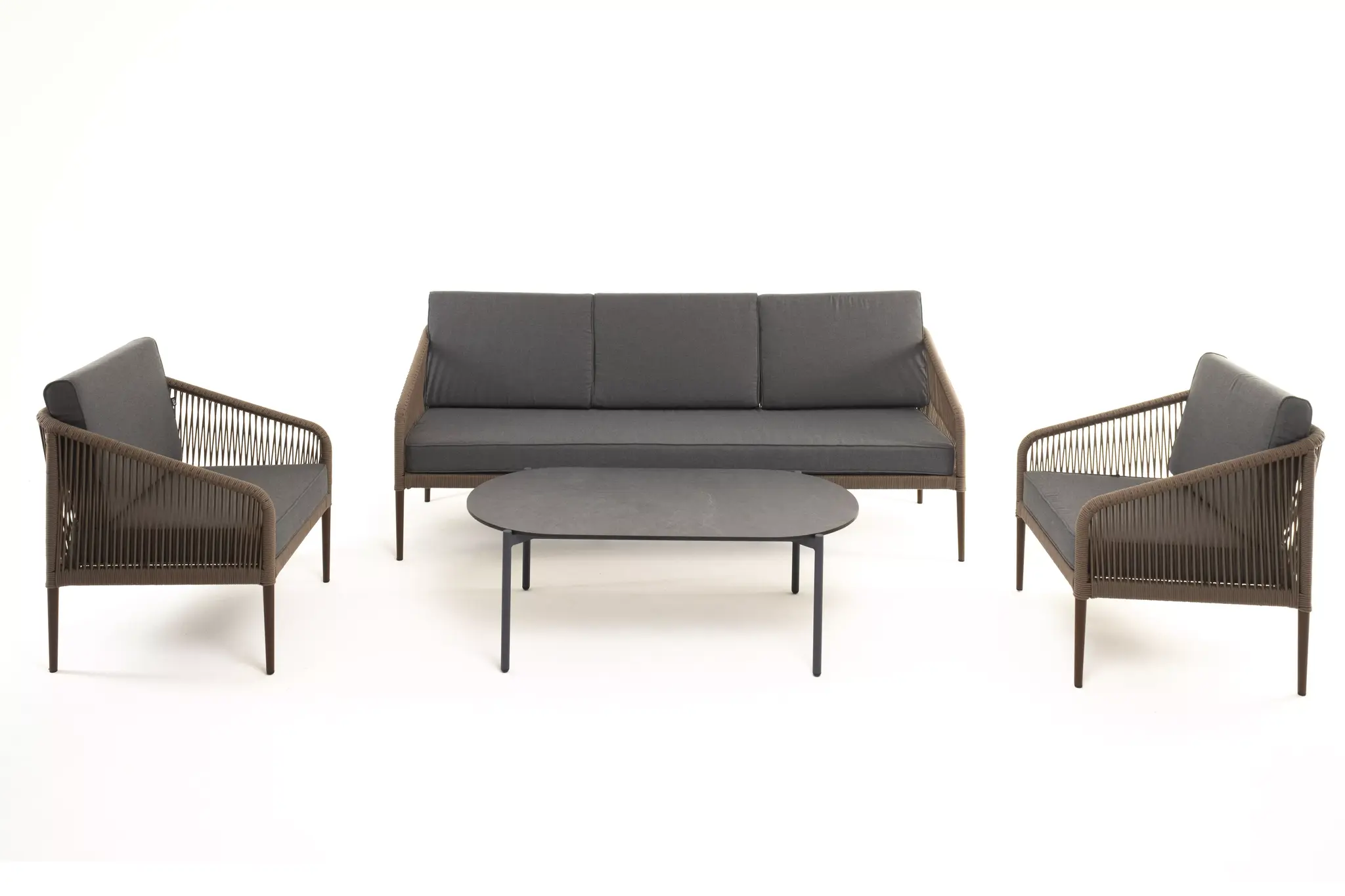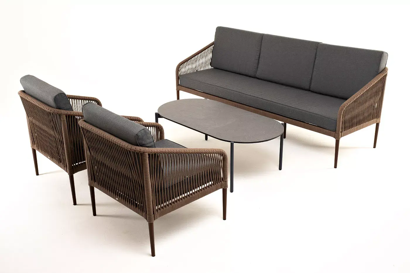 Каркас уличной мебели выполнен из износостойкого алюминия. Его дополняет коричневая ручная оплетка, изготовленная на основе эластичных синтетических лент из полиэфирных волокон высокой прочности.