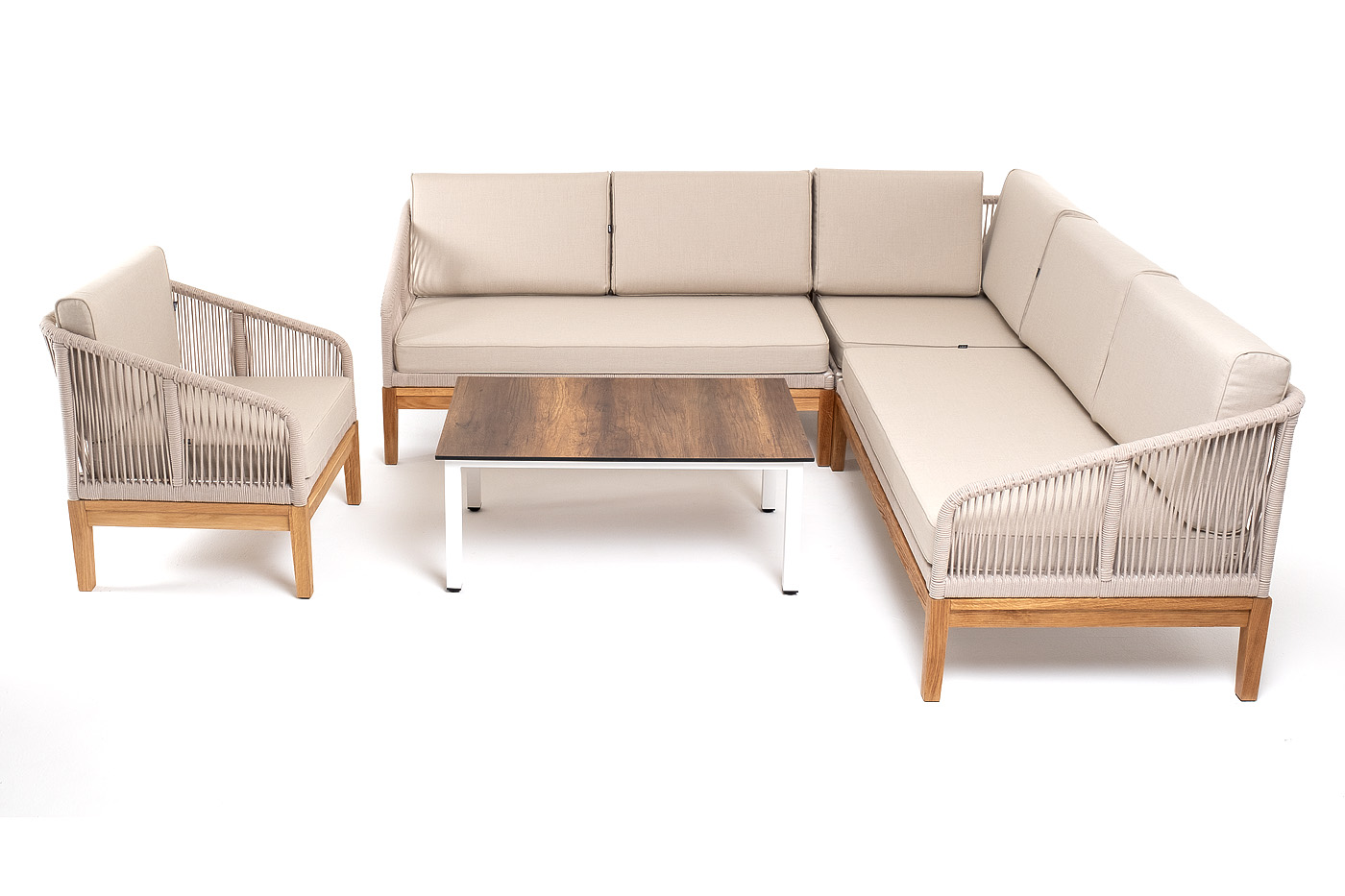 Боковины каркаса вручную оплетены роупом - эластичными синтетическими лентами, изготовленными из высокопрочных полиэфирных волокон. Цвет оплетки - бежевый. Основание дуб.